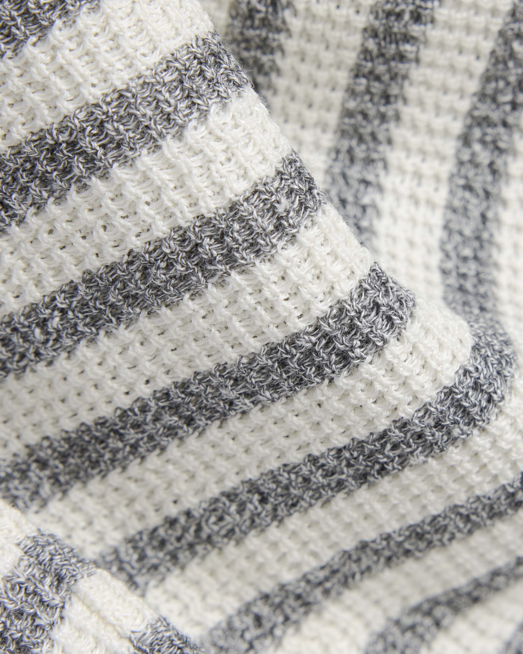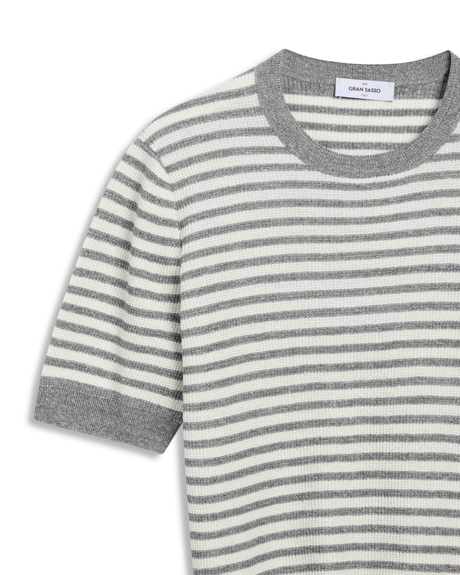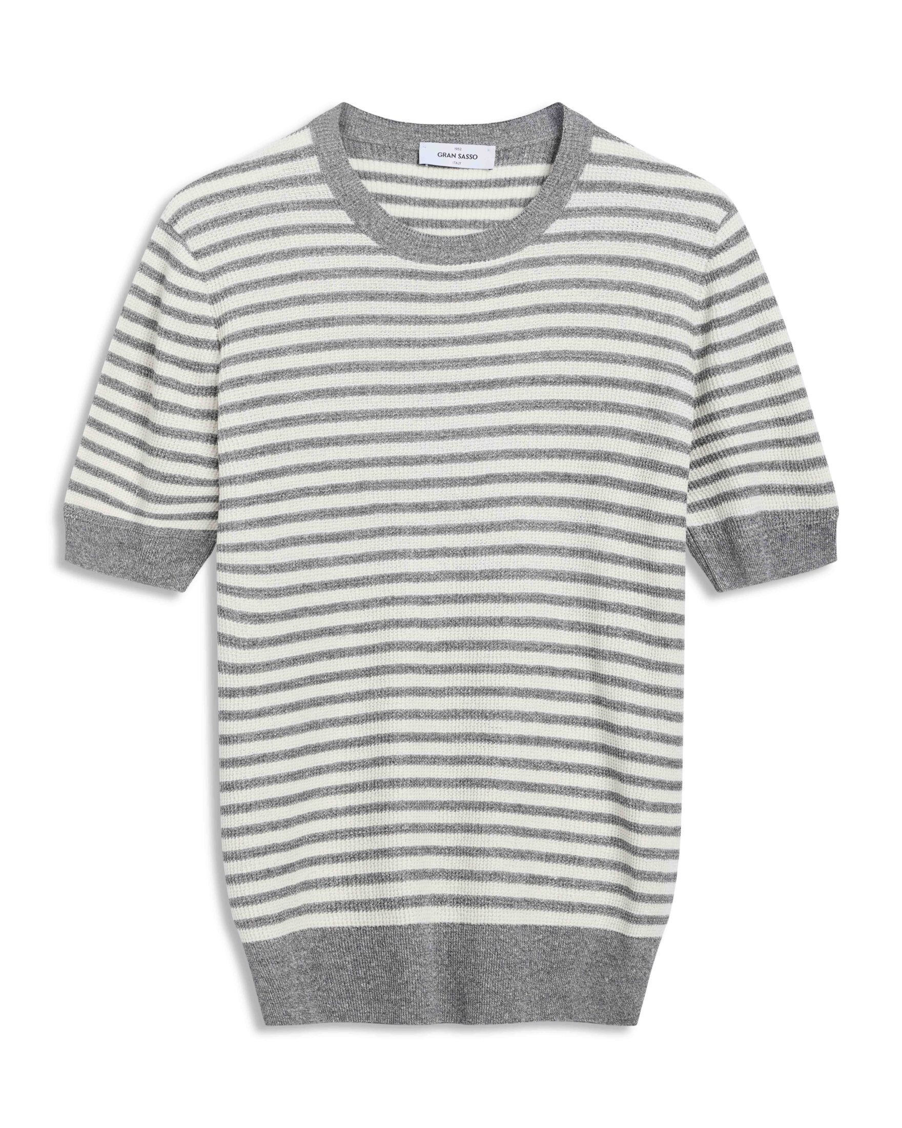Strikket t-skjorte fra Gran Sasso i en lett og pustende blanding av lin og bomull. Modellen har rund hals, korte ermer og ribbestrikkede kontrastkanter, kombinert med smale horisontale striper i klassisk breton-inspirert stil. En raffinert og komfortabel sommerstrikk som gir antrekket et avslappet, men gjennomført uttrykk.