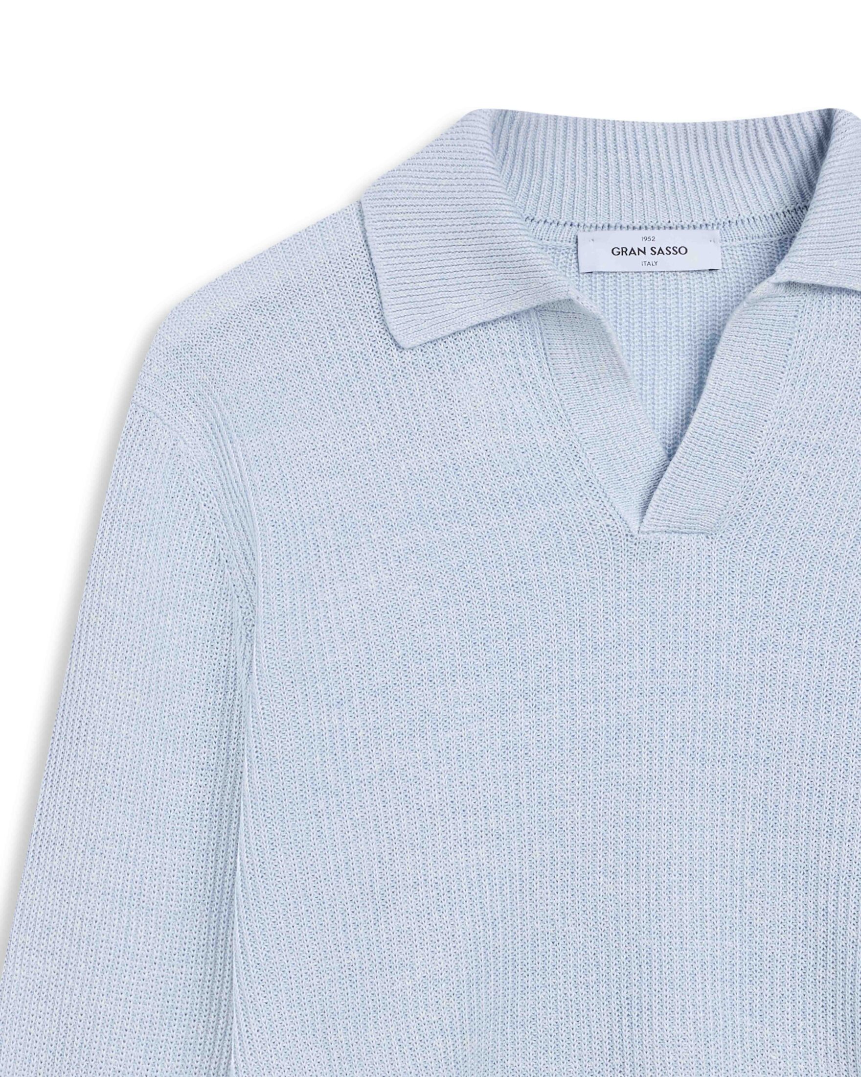 Strikket genser fra Gran Sasso i en lett og pustende blanding av lin og bomull. Modellen har åpen krage, ribbestrikkede avslutninger og en strukturert overflate som gir et sofistikert uttrykk. Et stilrent og komfortabelt alternativ som passer perfekt til en avslappet, men velkledd sommerstil.