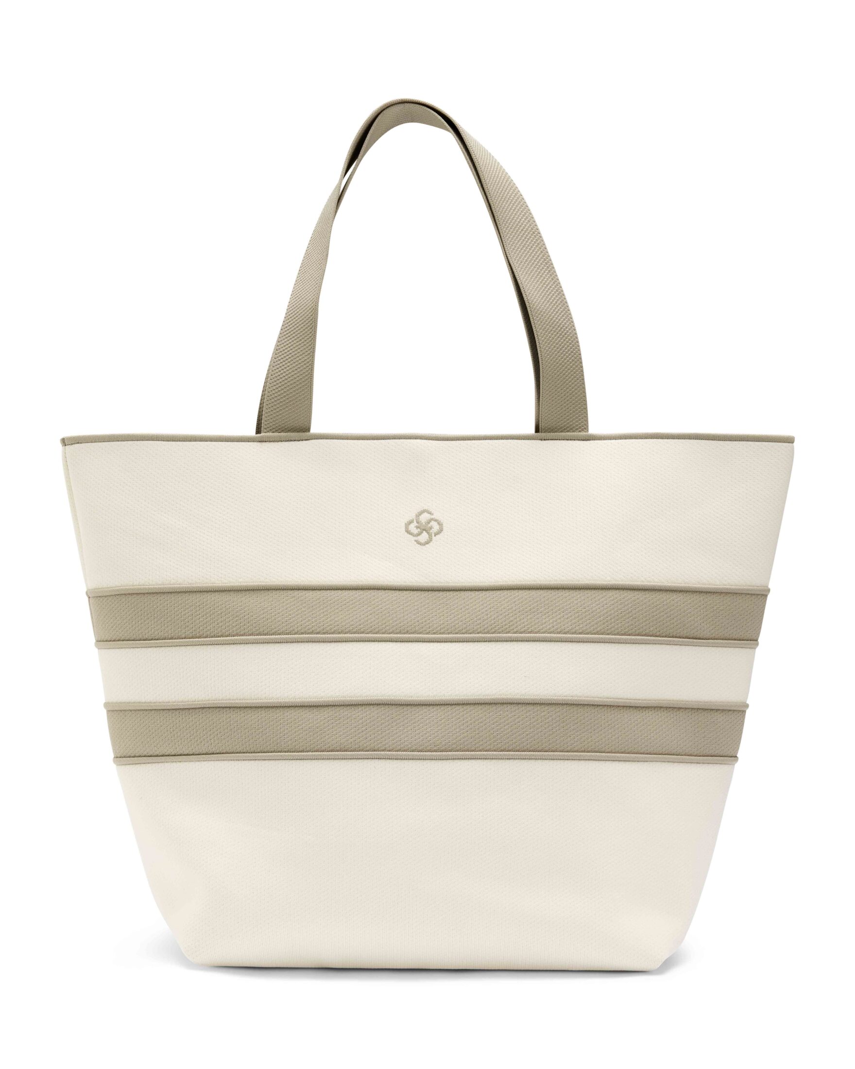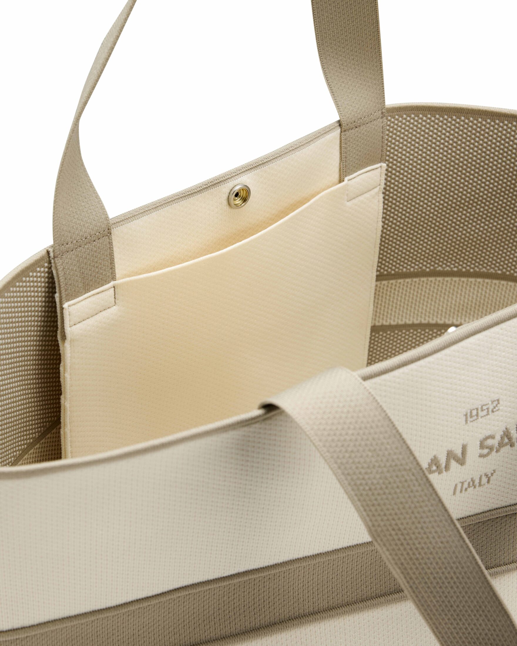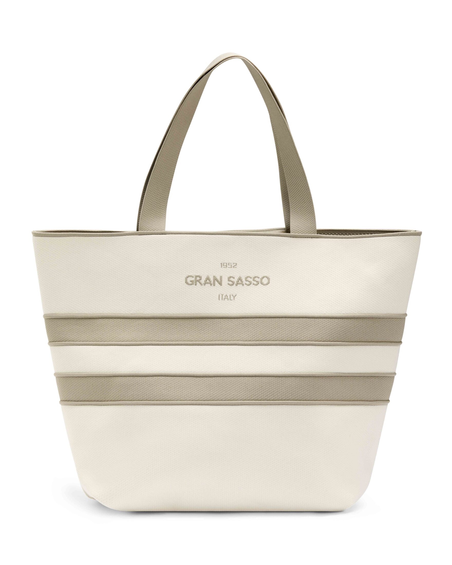 Tote bag fra Gran Sasso med logo i front og kontrastdetaljer. Modellen har doble håndtak og trykknapplukking, med romslig hovedrom. Perfekt som hverdagsveske eller til strand og reise.