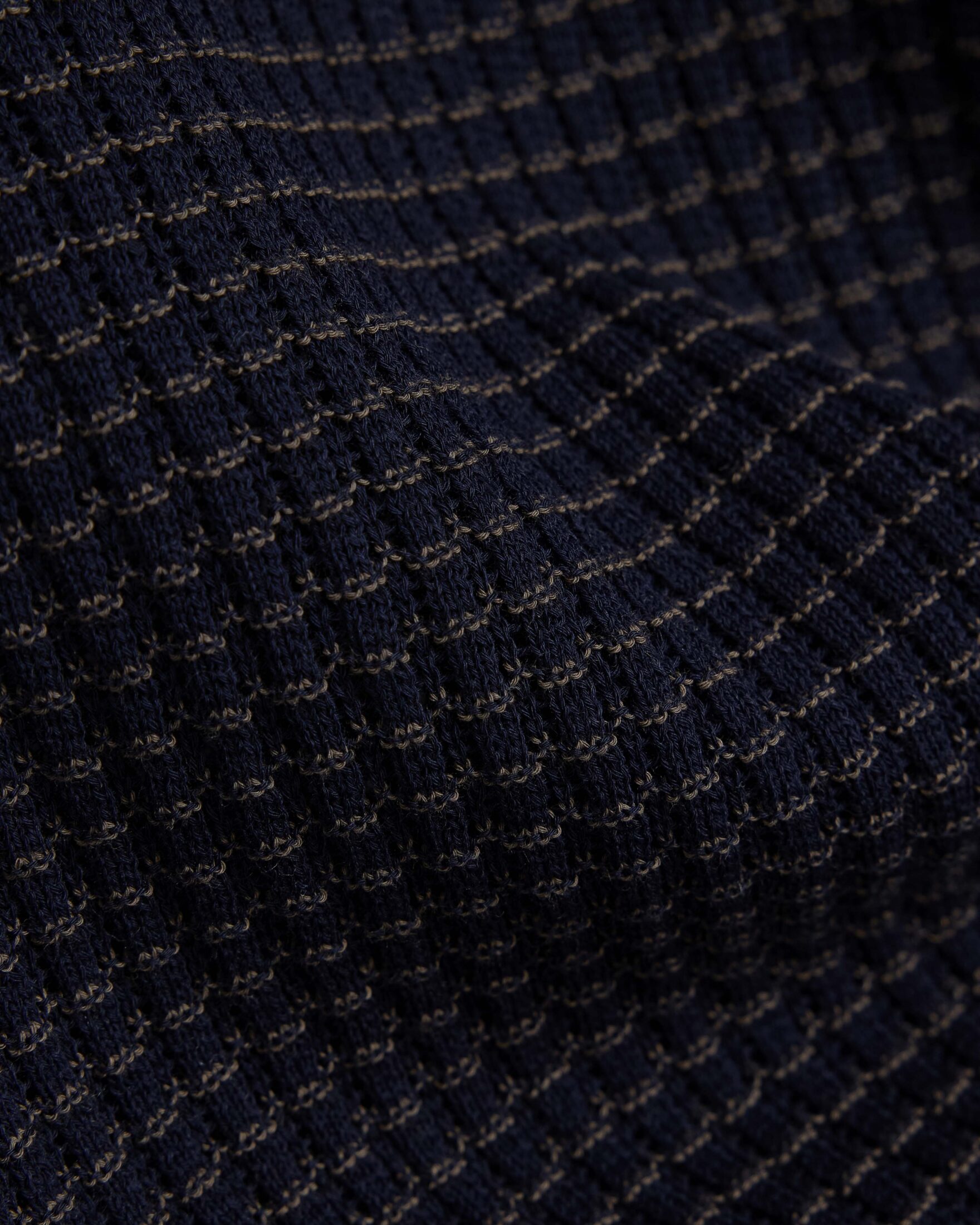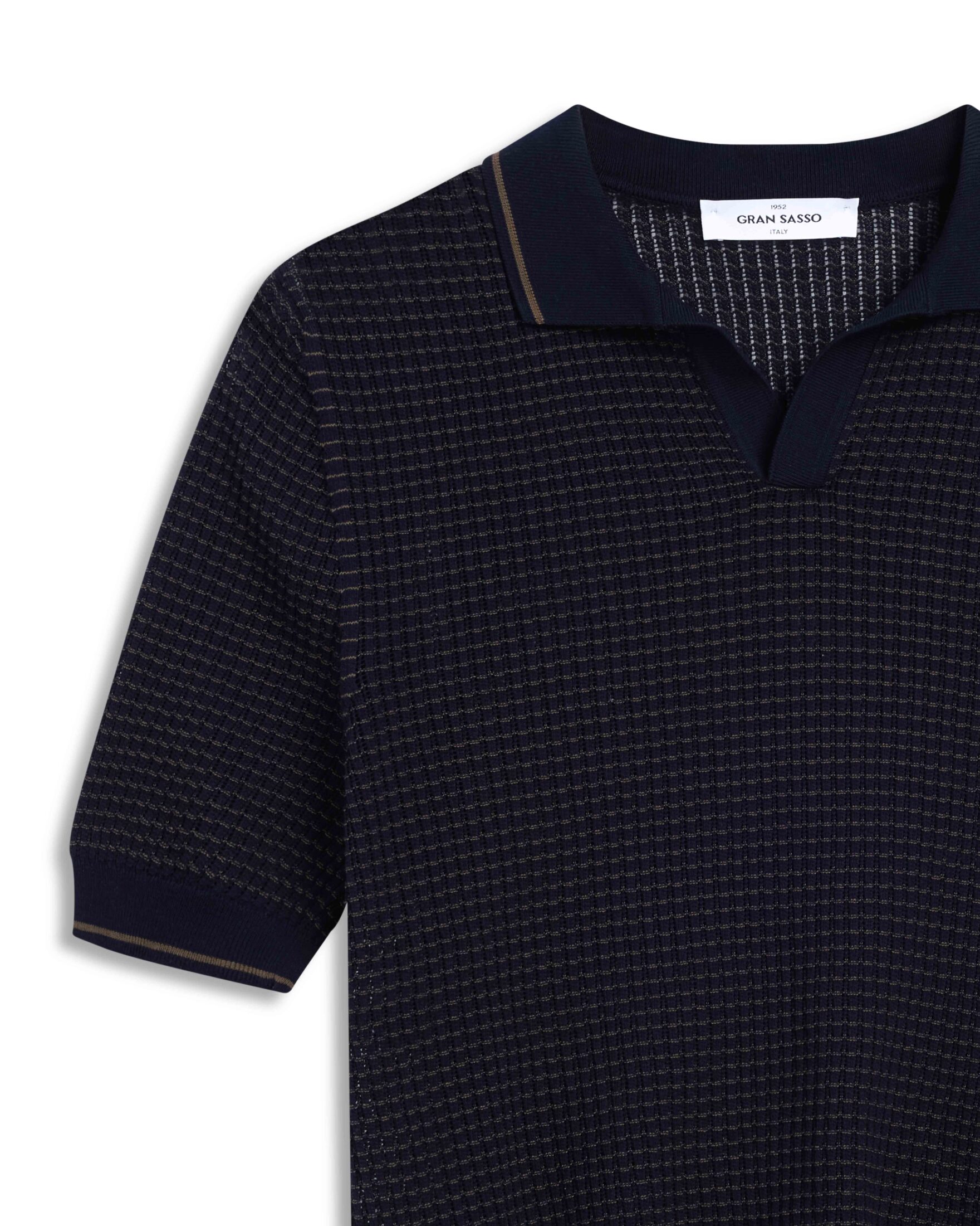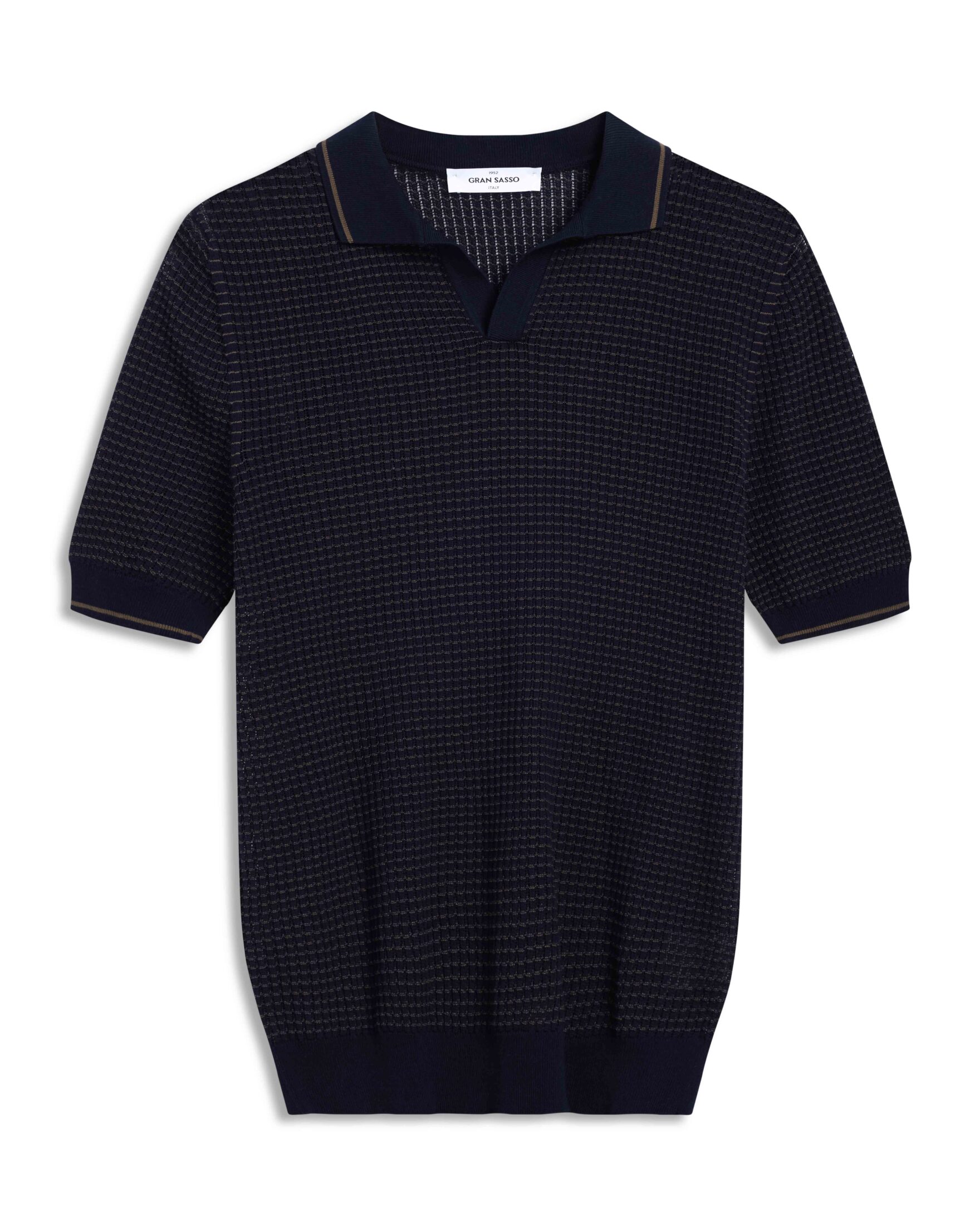 Strikket poloskjorte fra Gran Sasso i myk og pustende bomull. Modellen har strukturert mønster, kontrastfarget krage og ribbestrikkede kanter som gir et gjennomført uttrykk. En stilren og sommerlig polo som kombinerer komfort med et sofistikert, moderne preg.