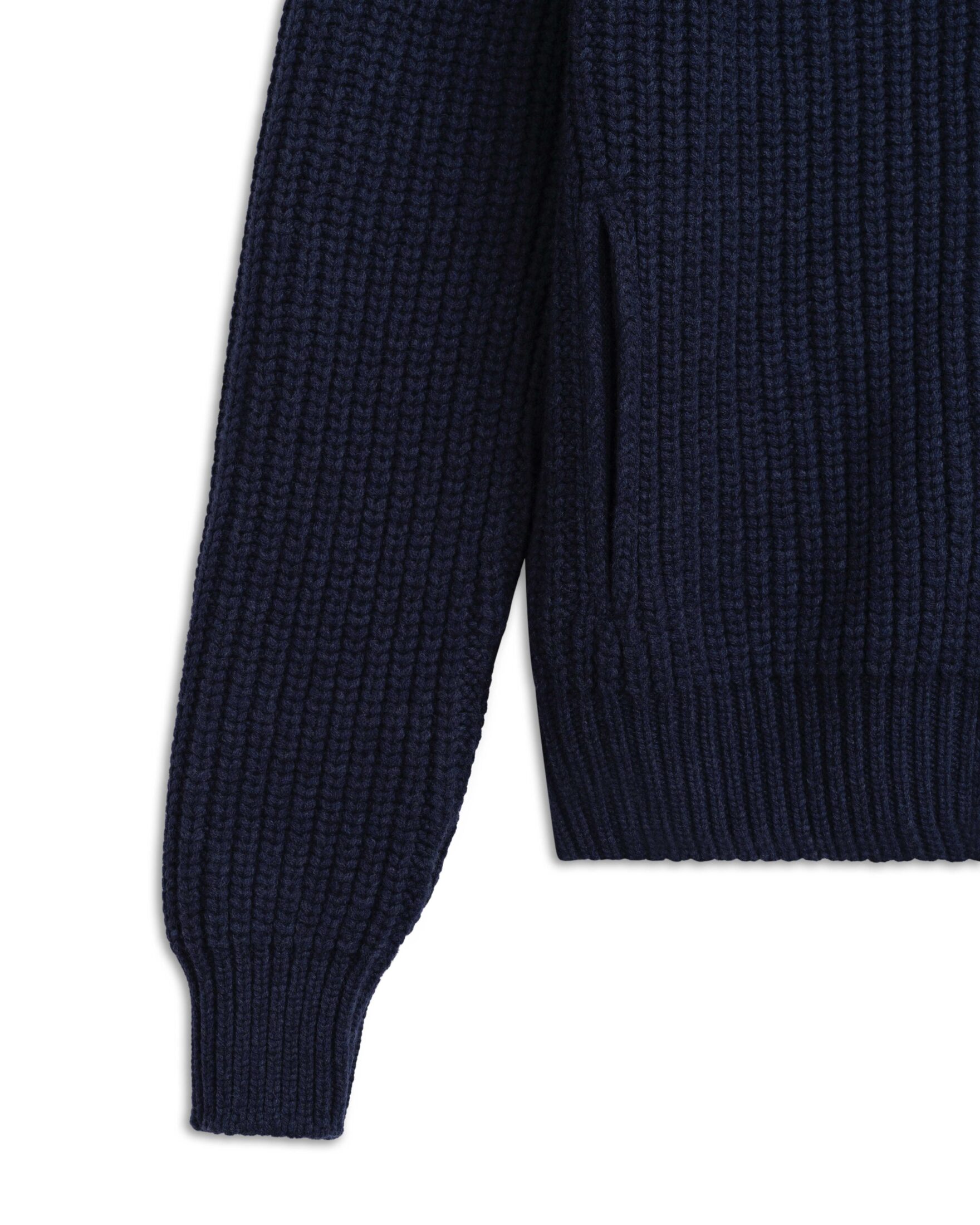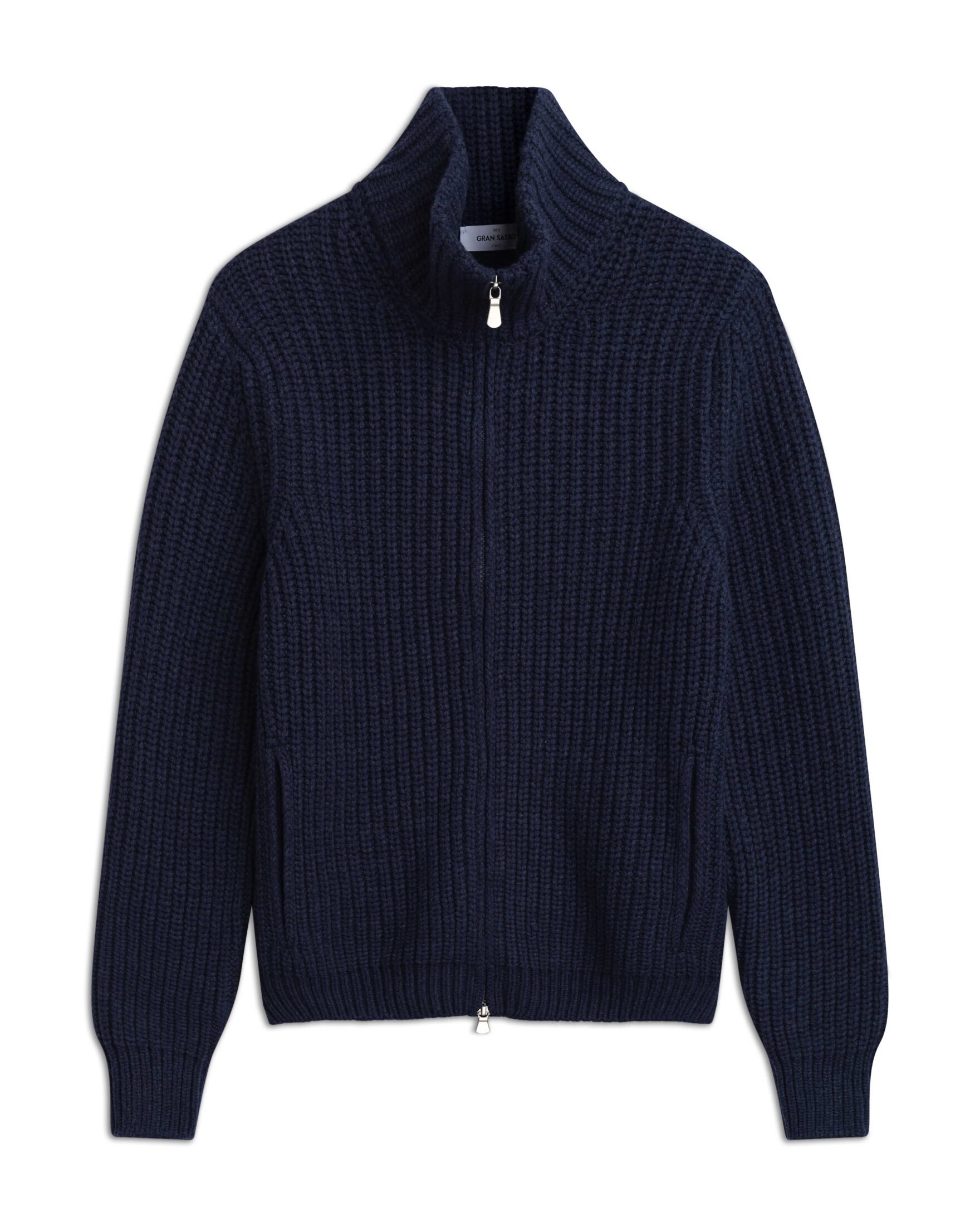 En eksklusiv cardigan til herre fra Gran Sasso, laget i en myk og luksuriøs blanding av ull, viskose og kasjmir. Den grove ribbestrikken gir plagget struktur og karakter, mens den høye halsen og toveis glidelåsen tilfører funksjonalitet og moderne stil. Et allsidig plagg som fungerer like godt alene som under en jakke på kjølige dager.