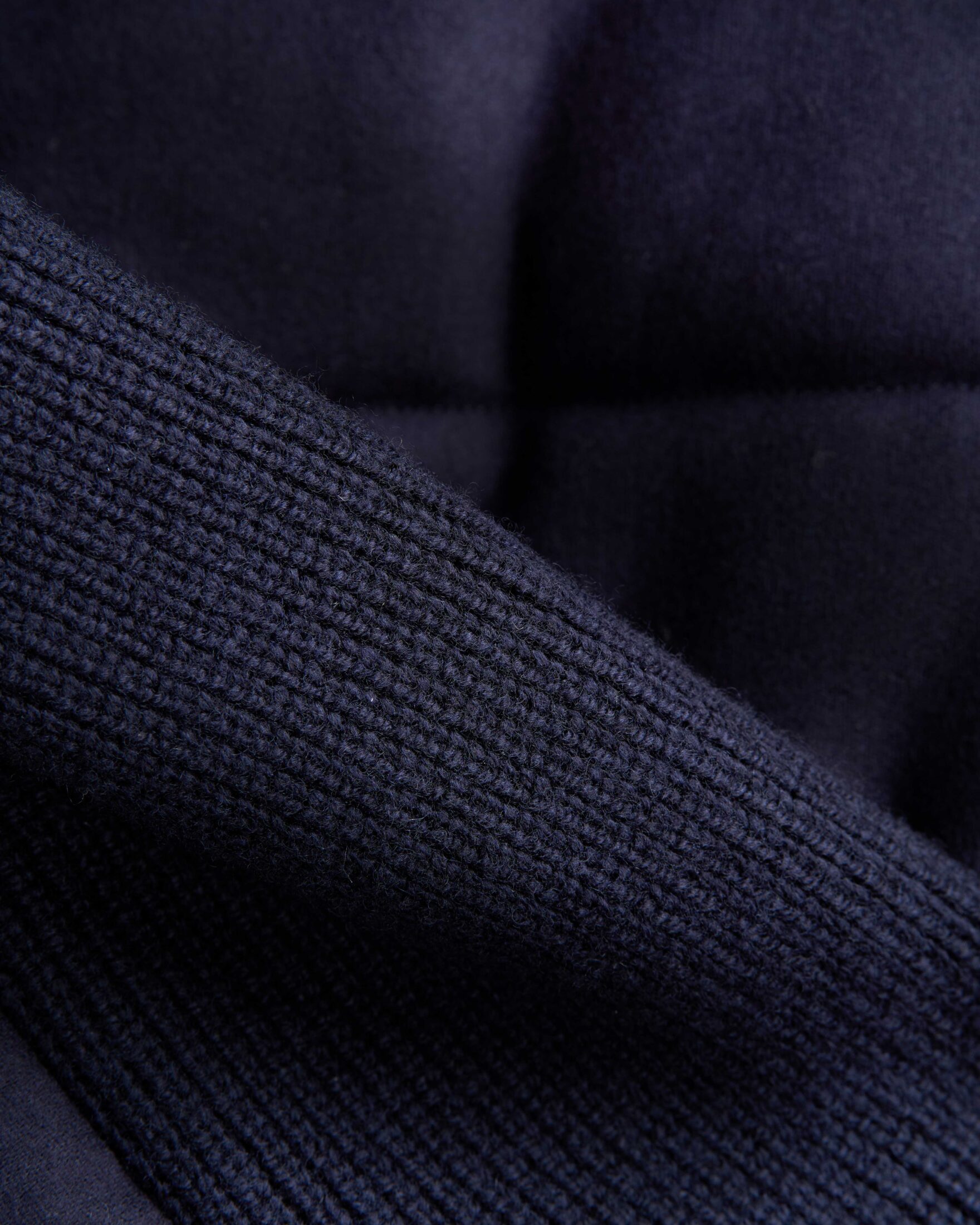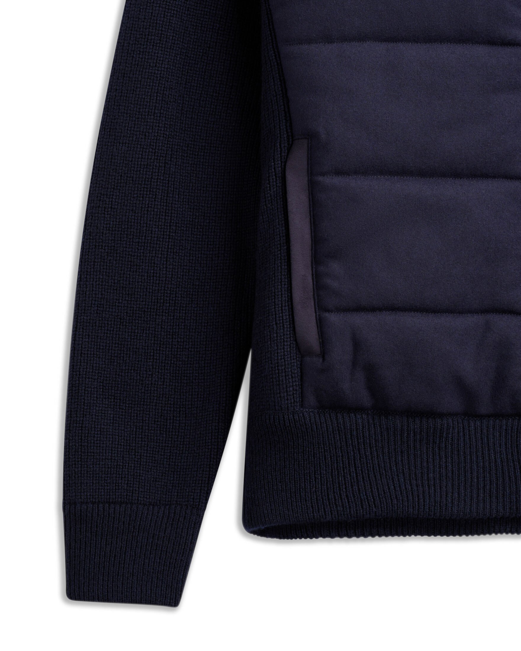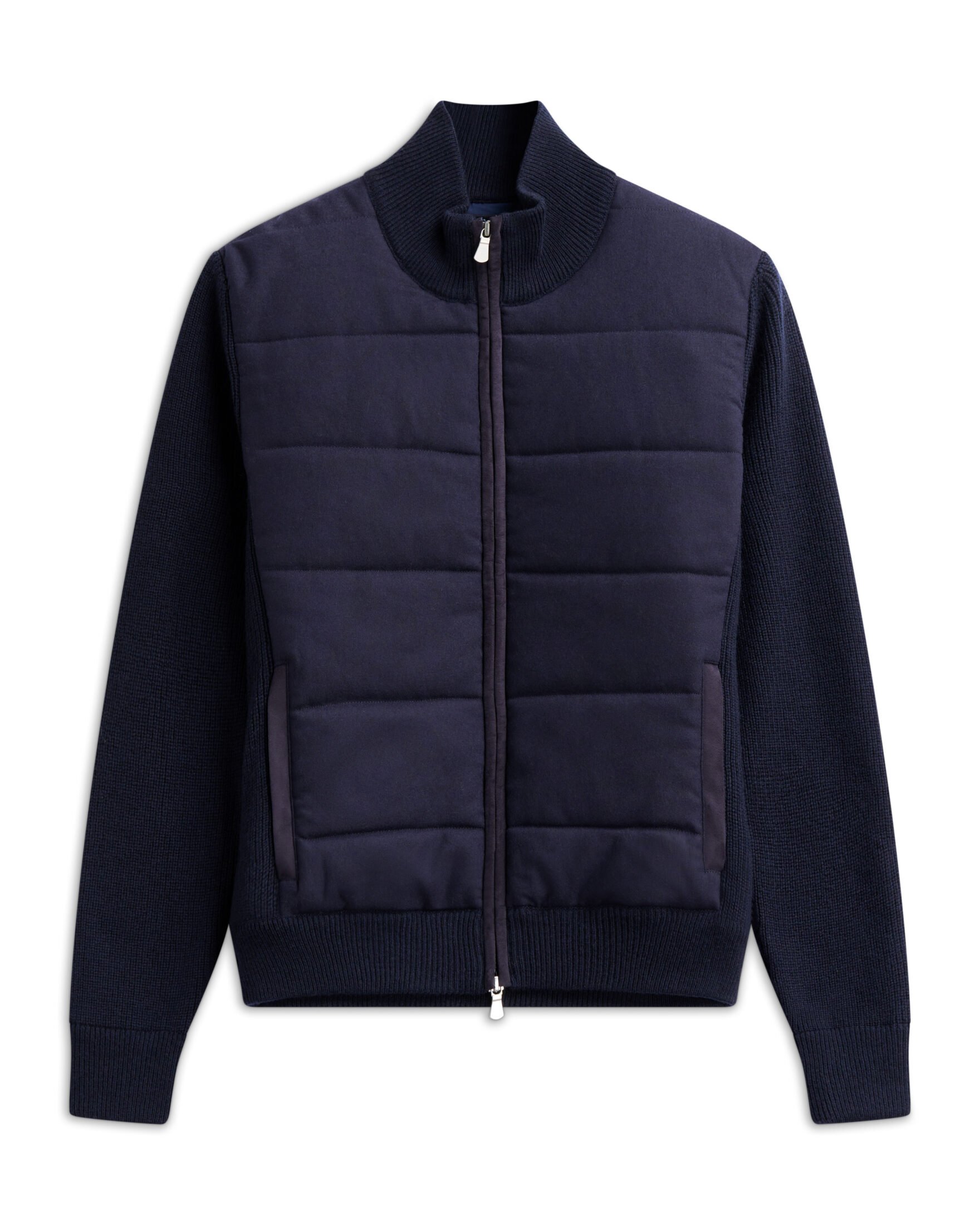 En moderne og allsidig jakke til herre fra Gran Sasso, designet for komfort og stil. Strikket i 100% ull med en vattert front i ull og elastan, fylt med lett polyester for ekstra varme. Jakken har høy ribbestrikket krage, glidelåslukning med toveis glidelås og ribb nederst og på ermene for en komfortabel passform. Et perfekt plagg for overgangen mellom sesonger. Like stilig alene som under en ytterjakke.