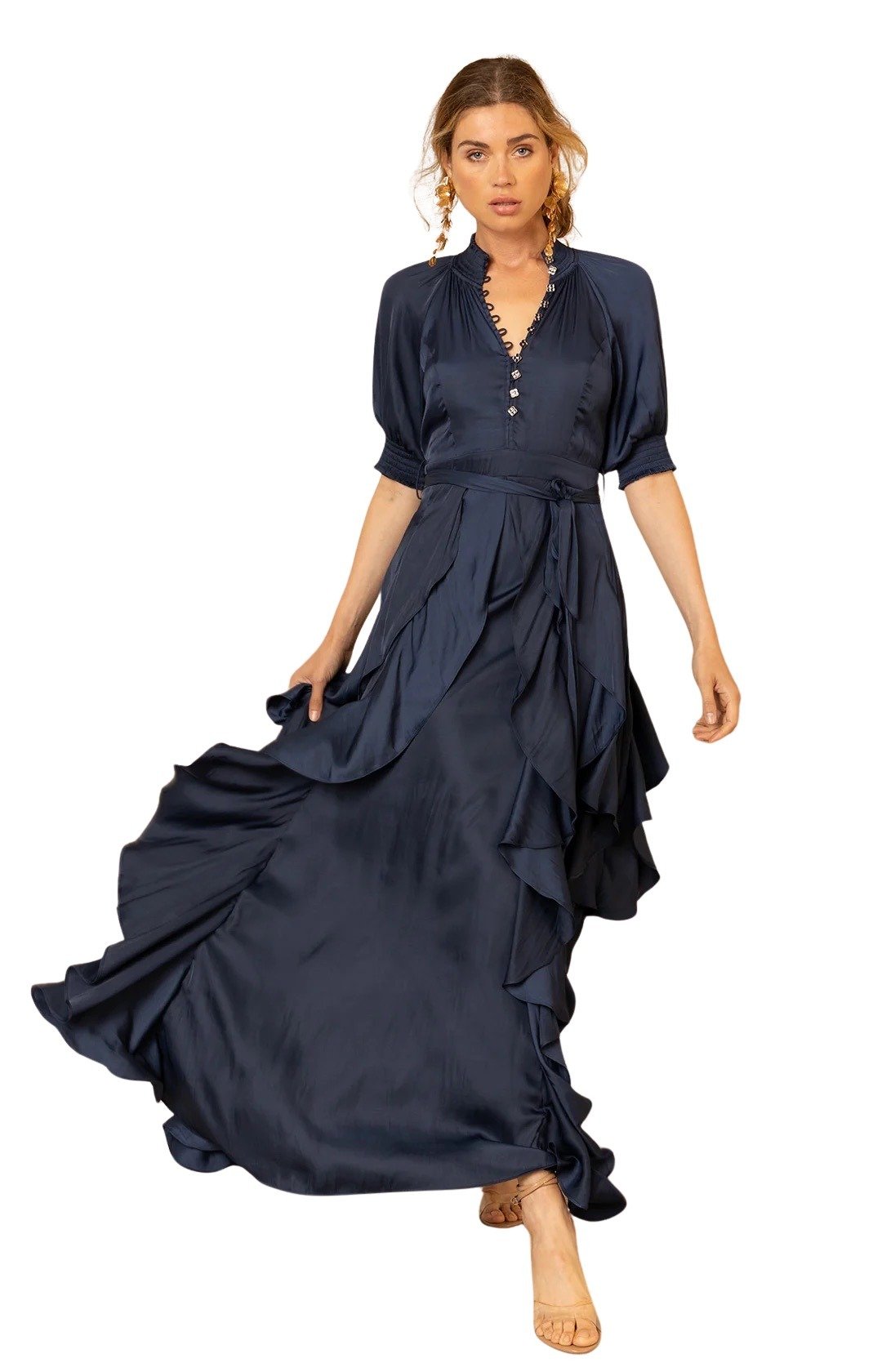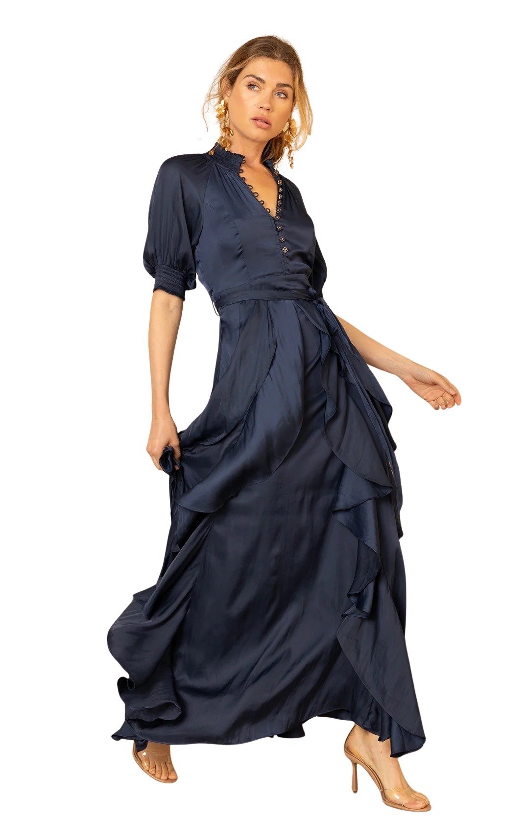Maxikjole til dame fra Hale Bob. Laget i vasket charmeuse med knappestolpe i front. Kjolen har smock i halsen og bak for enkel passform. Korte ballongermer med smock på mansjettene og elegante rysjer i skjørtet for feminin fasong. Lukkes med glidelås bak.