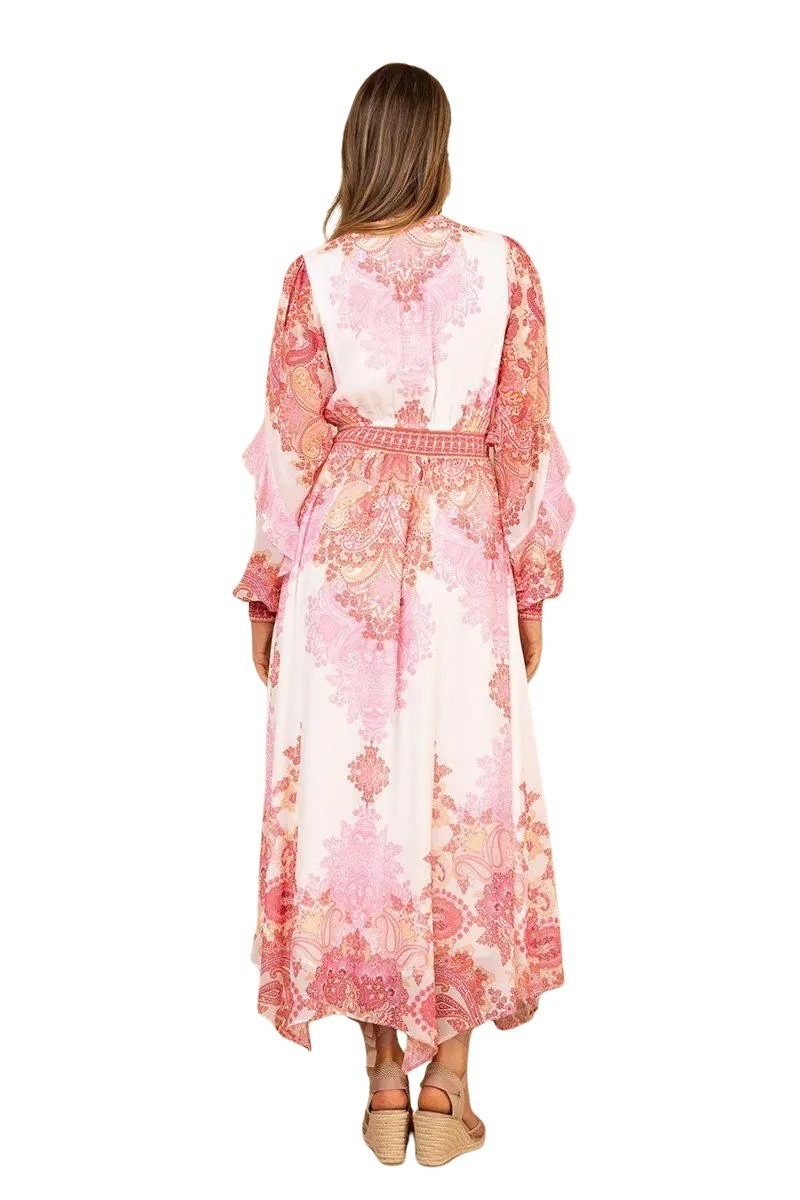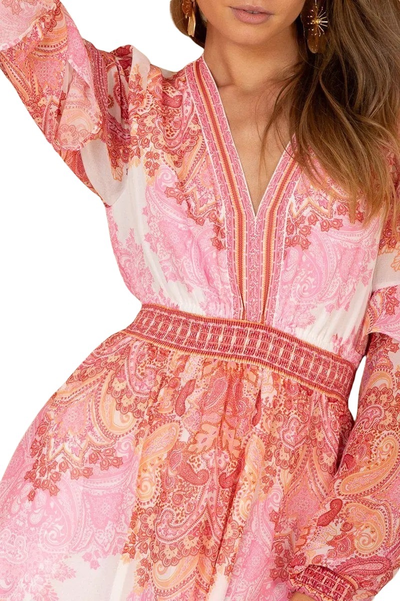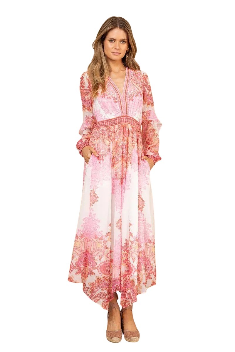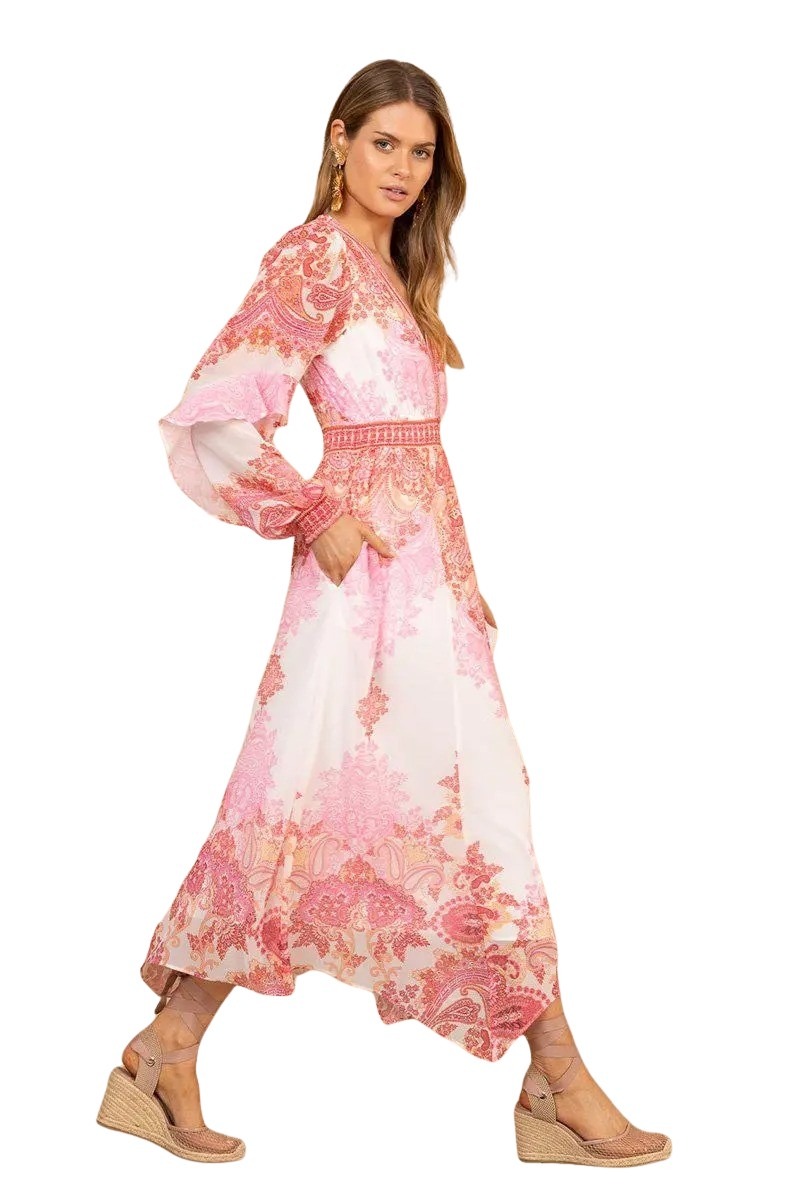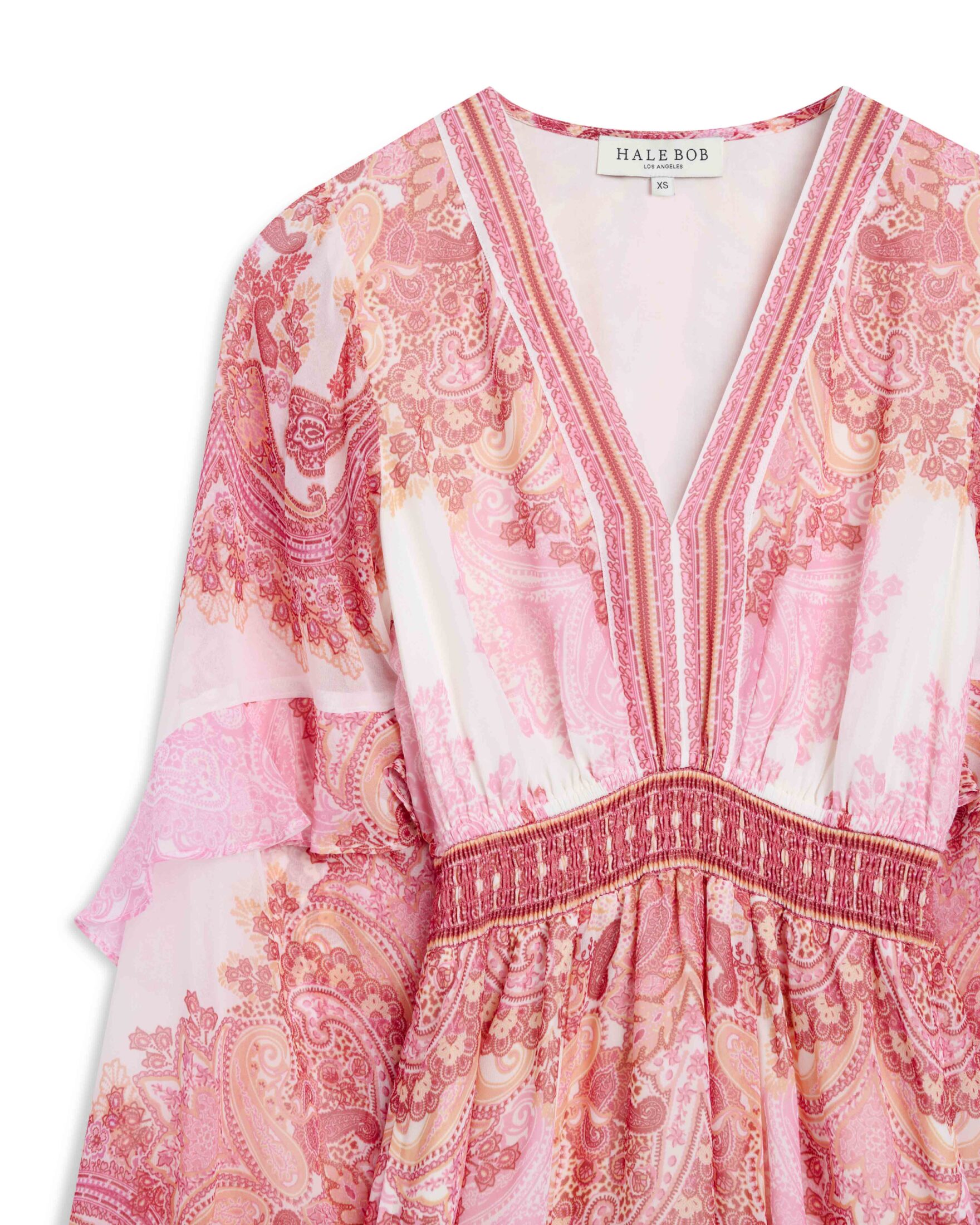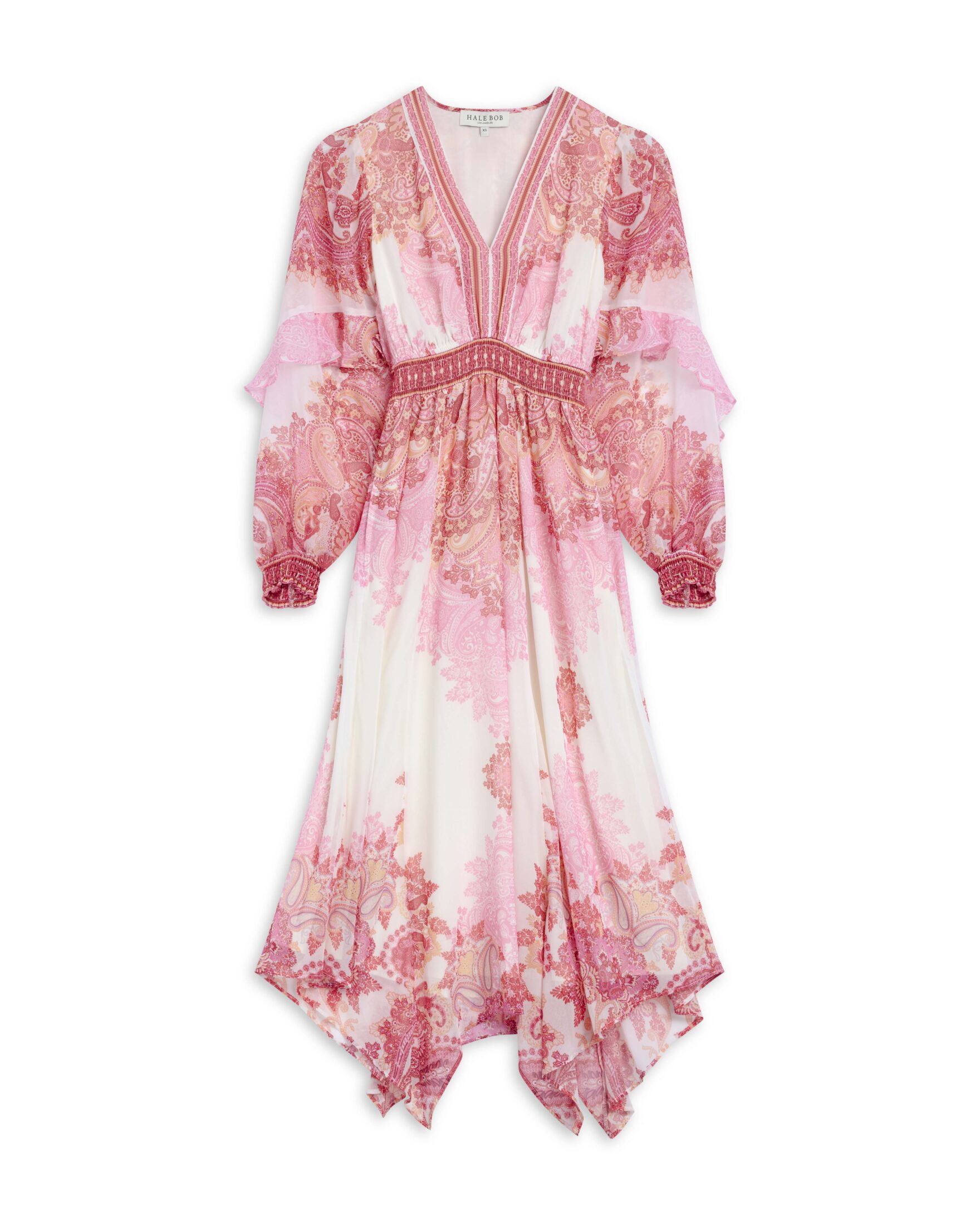 Kjole fra Hale Bob i vasket chiffon. Kjolen har et lett og luftig fall med en flatterende smock i livet. Den har lange ermer med volanger, lommer i siden og en dekorativ fald som gir et elegant uttrykk. Fôret i myk viskose for god komfort gjennom hele dagen.