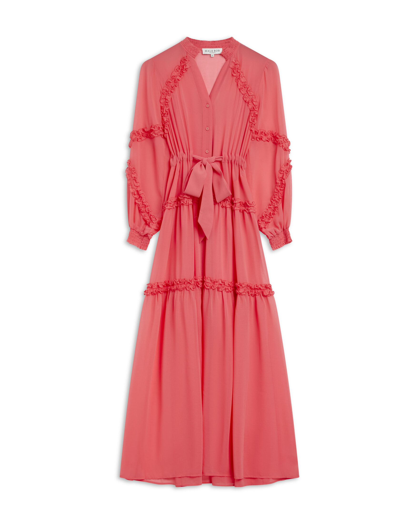 Maxikjole fra Hale Bob i vasket chiffon. Kjolen har et lett og luftig fall med feminine volangdetaljer. Den har knapper foran, knytebånd i livet og et lagdelt skjørt som gir fin bevegelse. Lange ermer med smock og praktiske lommer i siden gjør den både komfortabel og anvendelig.