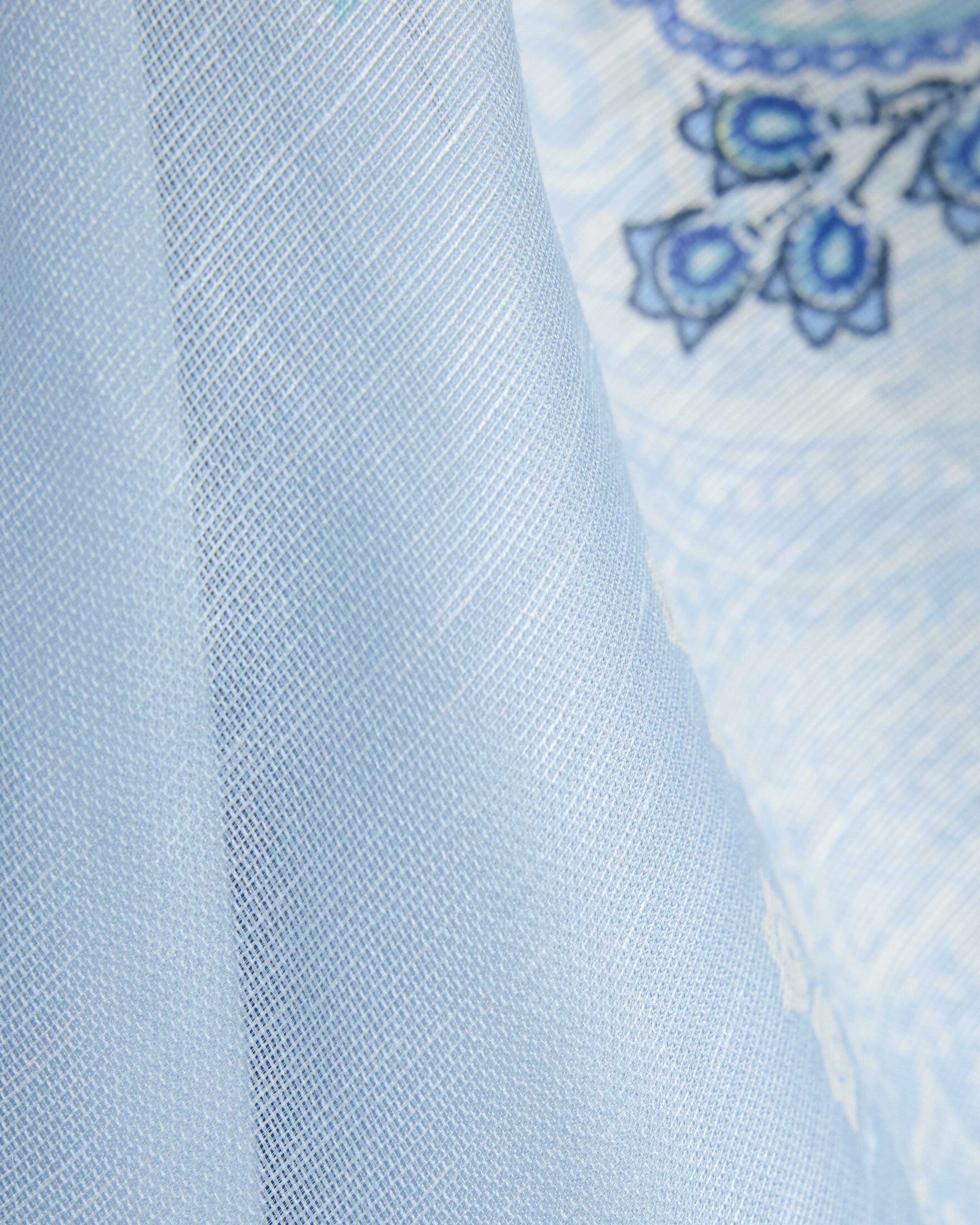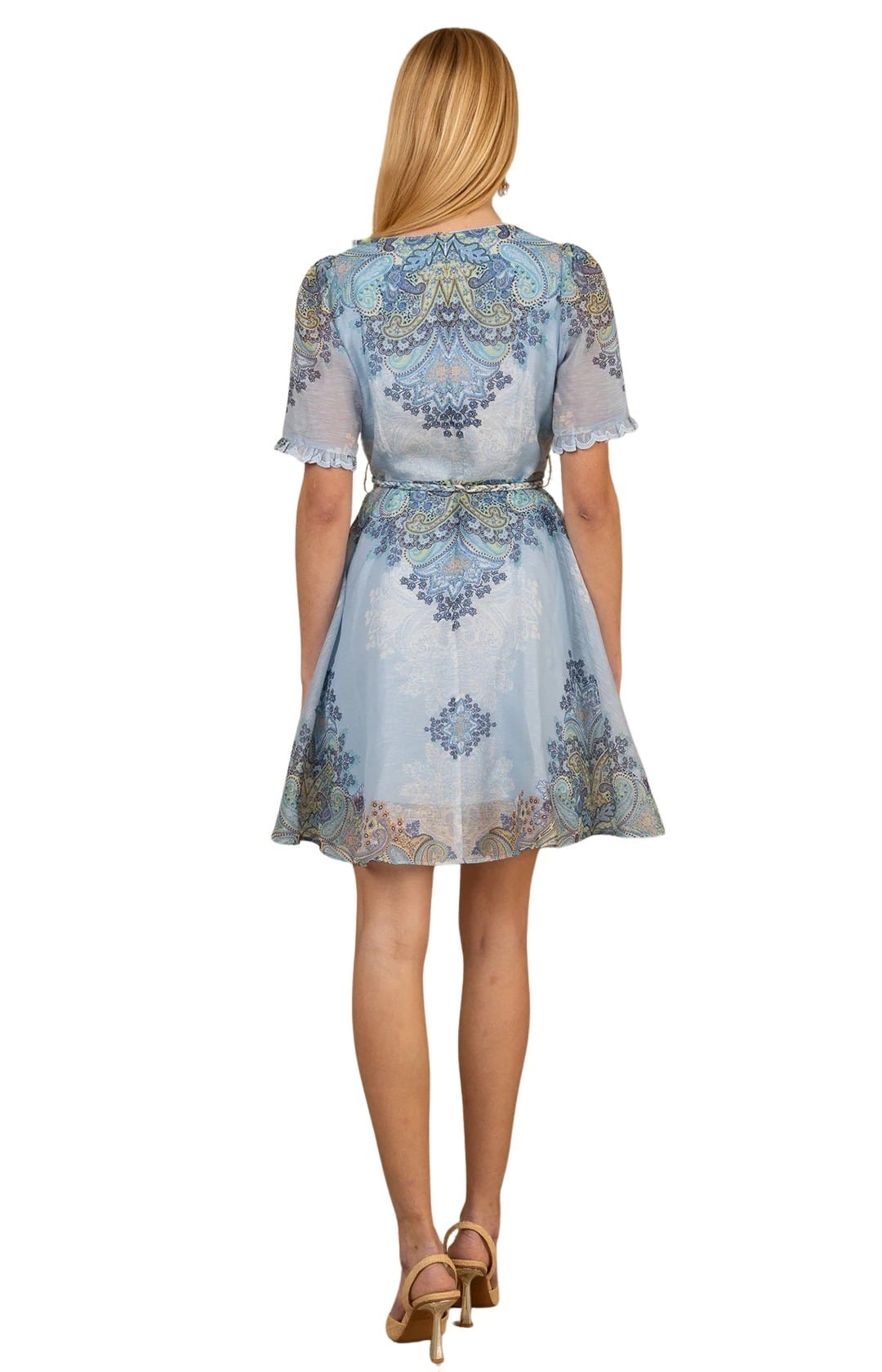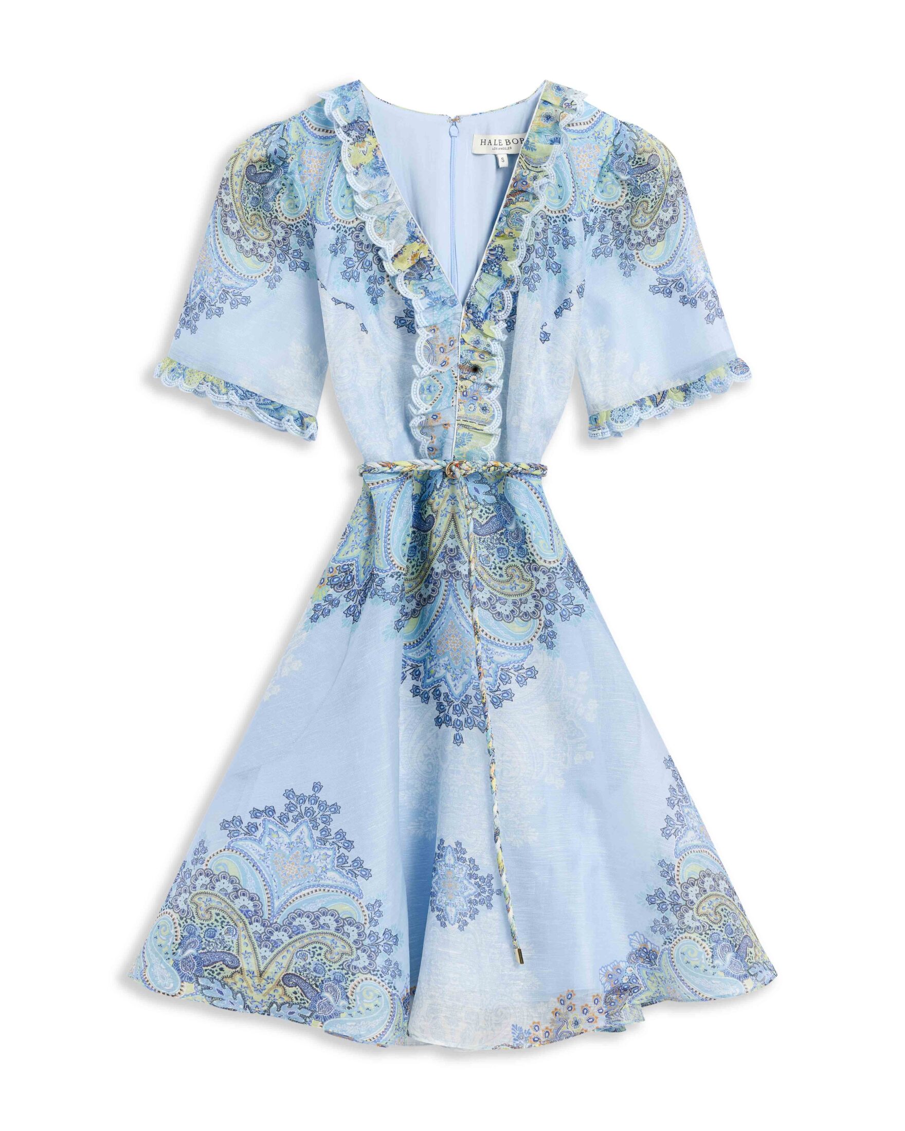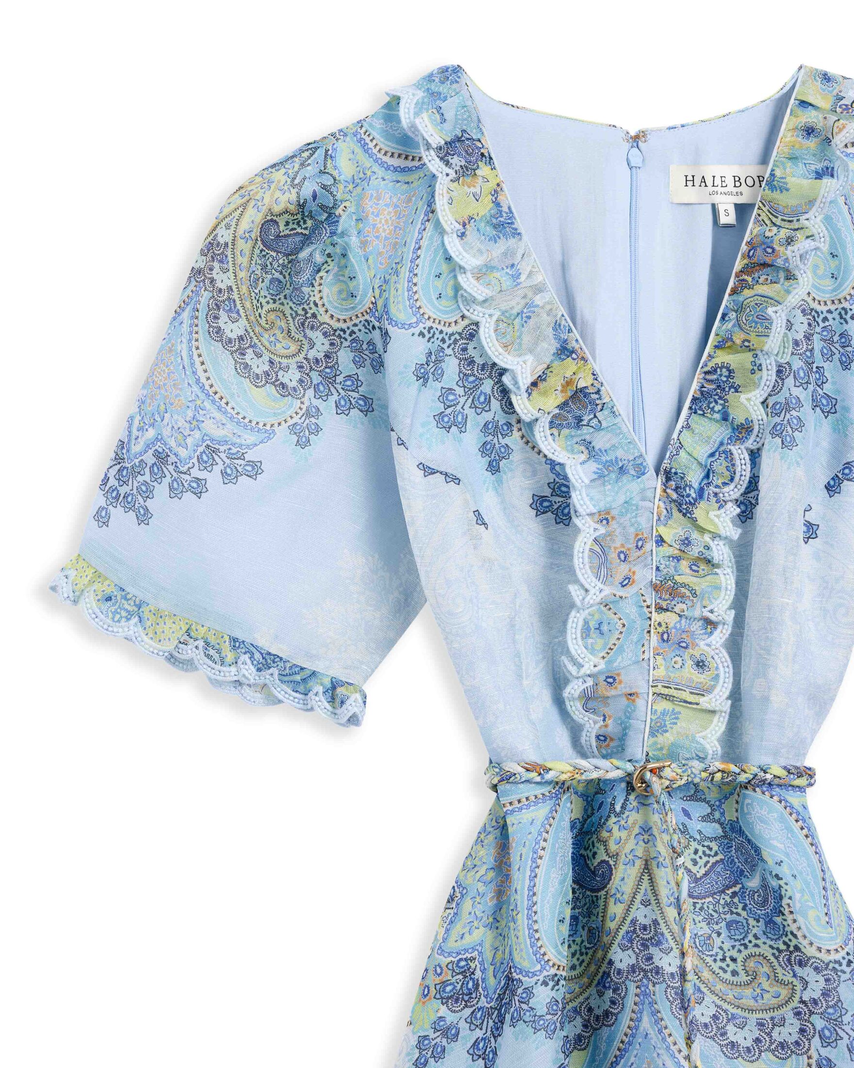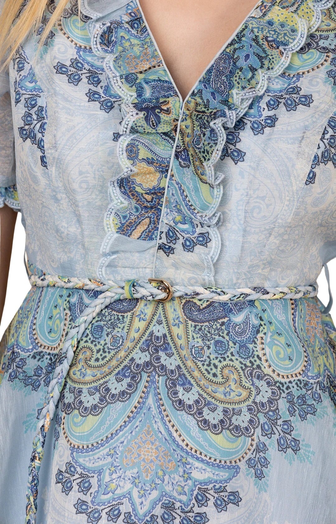 Knelang kjole til dame fra Hale Bob i silkeblandet organza med nydelig mønster. Rysjedetaljer, broderte ermer og flettet belte skaper et feminint uttrykk som passer perfekt til sommerens festlige anledninger.