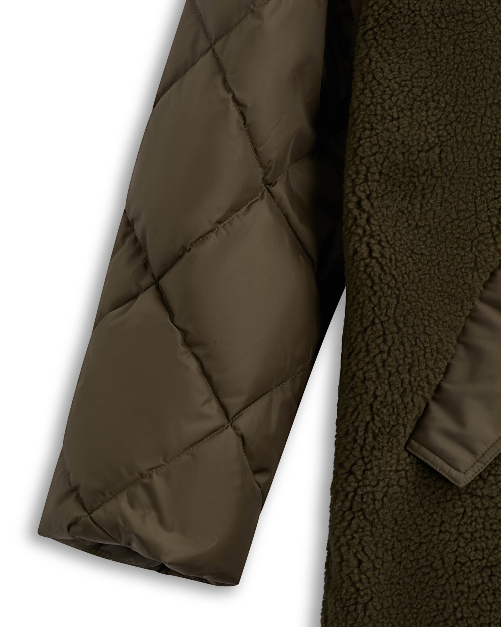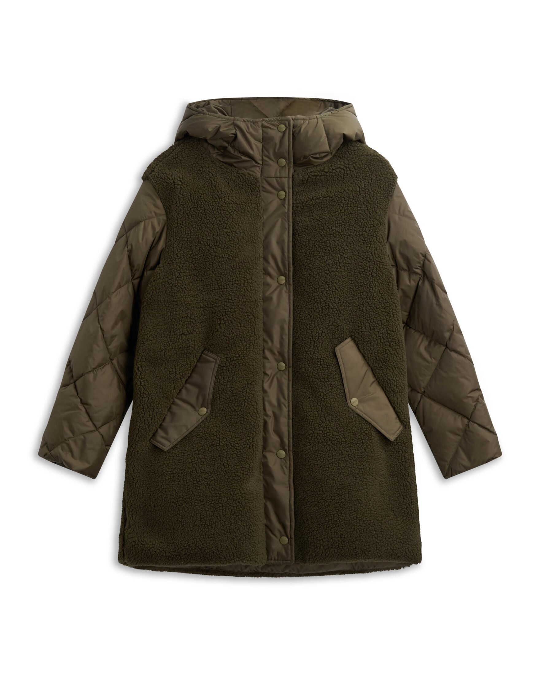 Stilfull jakke til dame fra Herno som kombinerer moderne design med maksimal komfort. Kroppen er kledd i myk teddyfleece, mens ermene har quiltet nylon for et sporty og sofistikert uttrykk. Jakken er vattert med dun og fjær som gir lett og behagelig varme. Fullført med hette og praktiske lommer – et perfekt ytterplagg for kalde dager med italiensk eleganse.