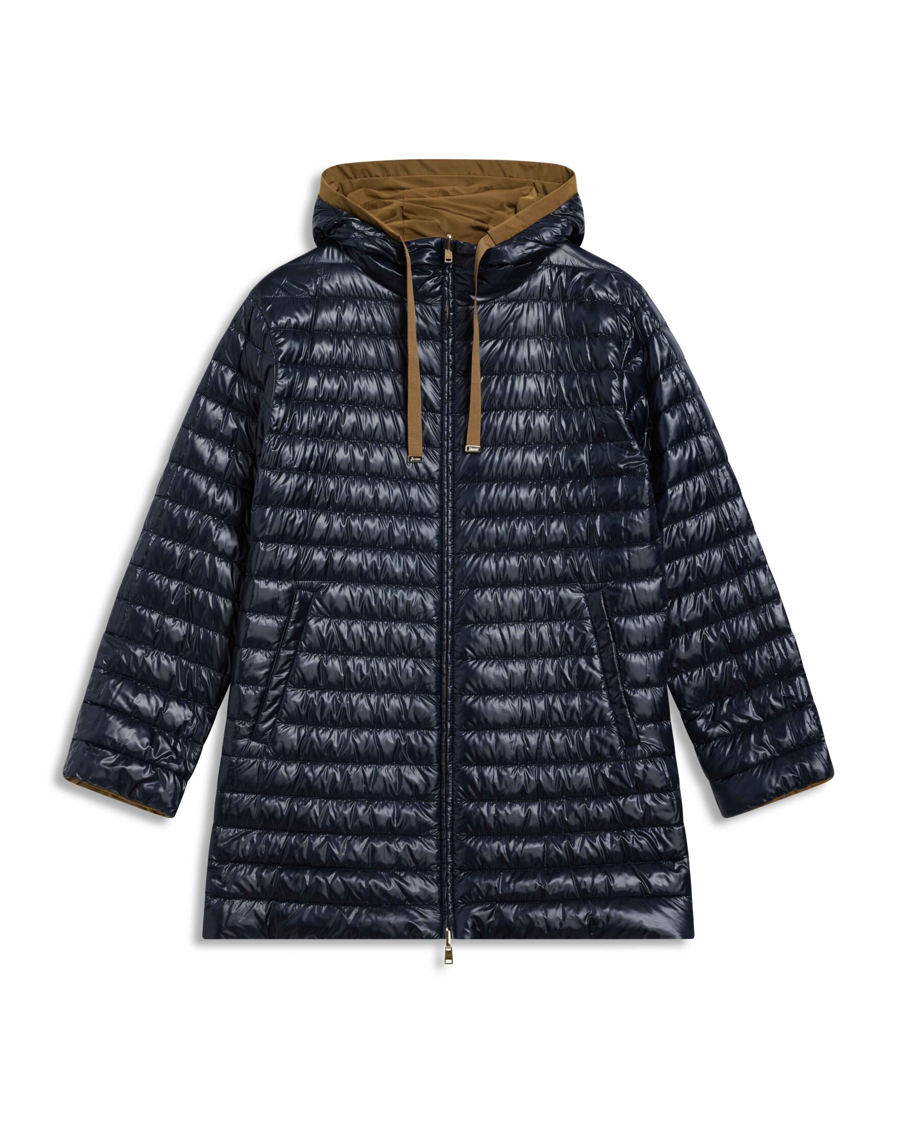 Jakke til dame fra Herno. Vendbar A-formet jakke fra Herno i lett taft med vannavvisende behandling og en diskret, elegant glans. Modellen kan brukes på begge sider, med ikonisk Nylon Ultralight på innsiden. Ultralett 20 denier japansk nylon med 90/10 dunfyll for optimal varme og komfort. En sporty og sofistikert jakke som kombinerer funksjonalitet, luksuriøs følelse og moderne stil.