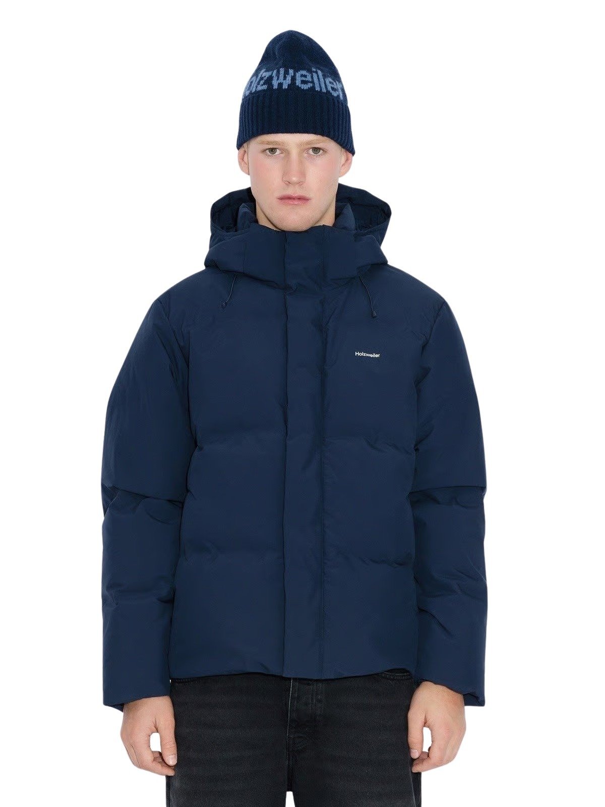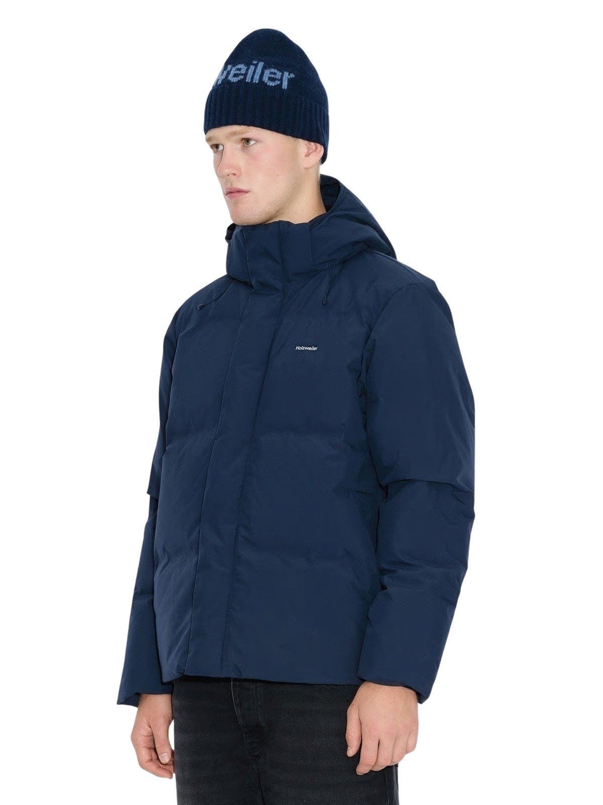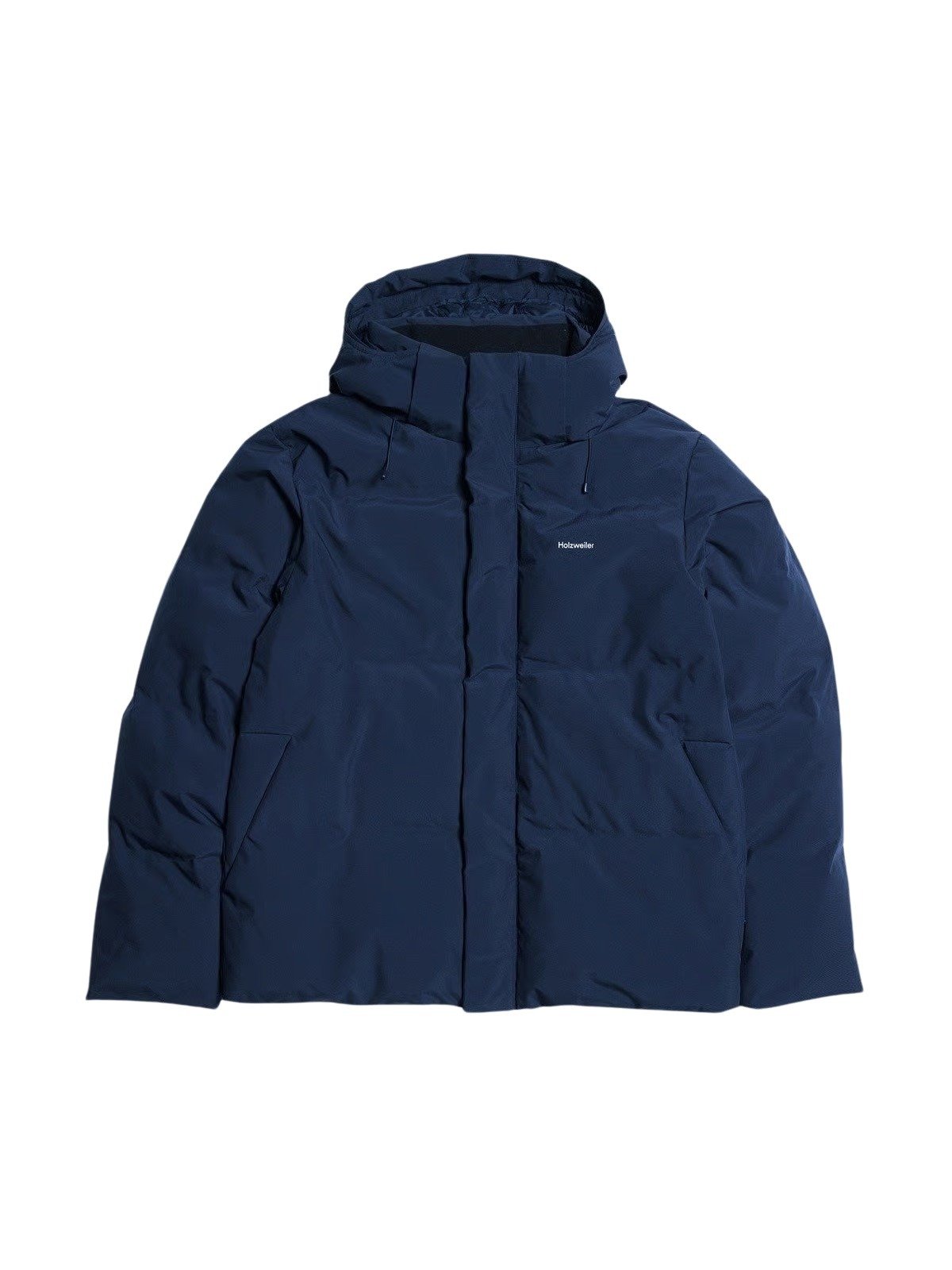 Dunjakke til herre fra Holzweiler. Den perfekte følgesvenn i overgangssesongen. Laget av et vattert teknisk stoff med lett dunfôring, gir den akkurat passe varme uten å bli tung. Jakken har avtakbar hette med snøring, toveis glidelås og praktiske lommer både utvendig og innvendig. Med justerbar fald og ribbede mansjetter får du en komfortabel passform – i et moderne, tidløst design.