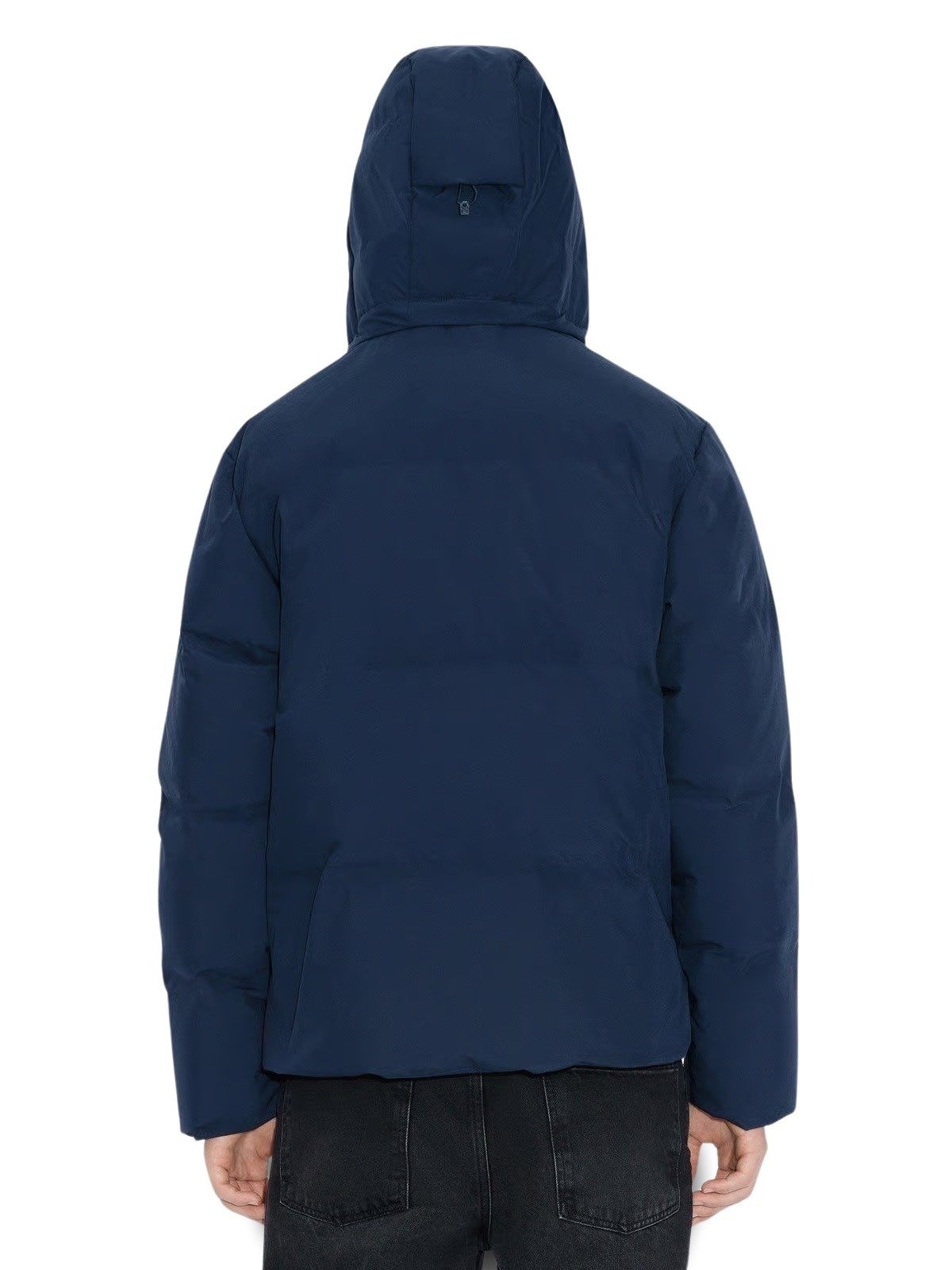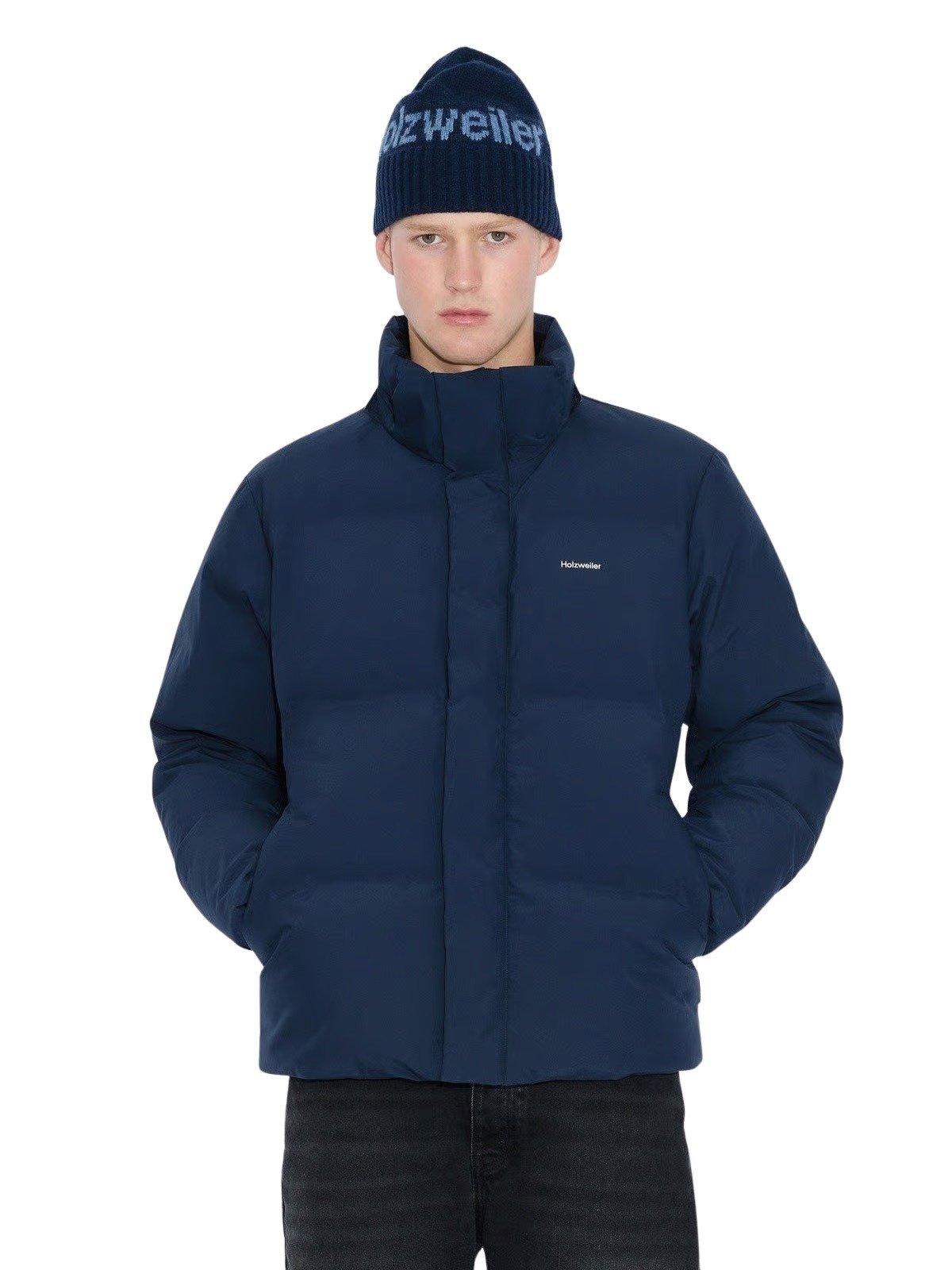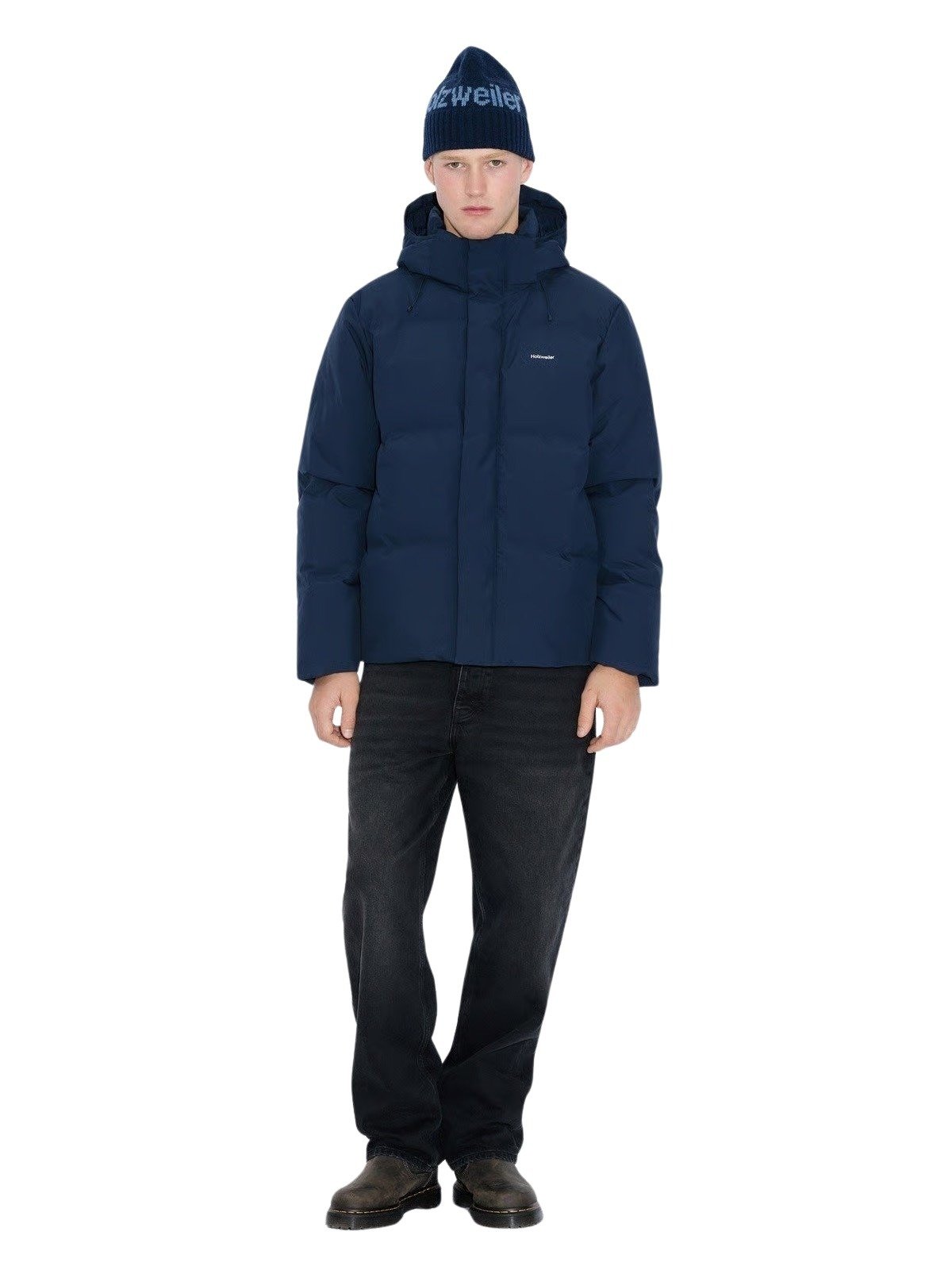 Dunjakke til herre fra Holzweiler. Den perfekte følgesvenn i overgangssesongen. Laget av et vattert teknisk stoff med lett dunfôring, gir den akkurat passe varme uten å bli tung. Jakken har avtakbar hette med snøring, toveis glidelås og praktiske lommer både utvendig og innvendig. Med justerbar fald og ribbede mansjetter får du en komfortabel passform – i et moderne, tidløst design.