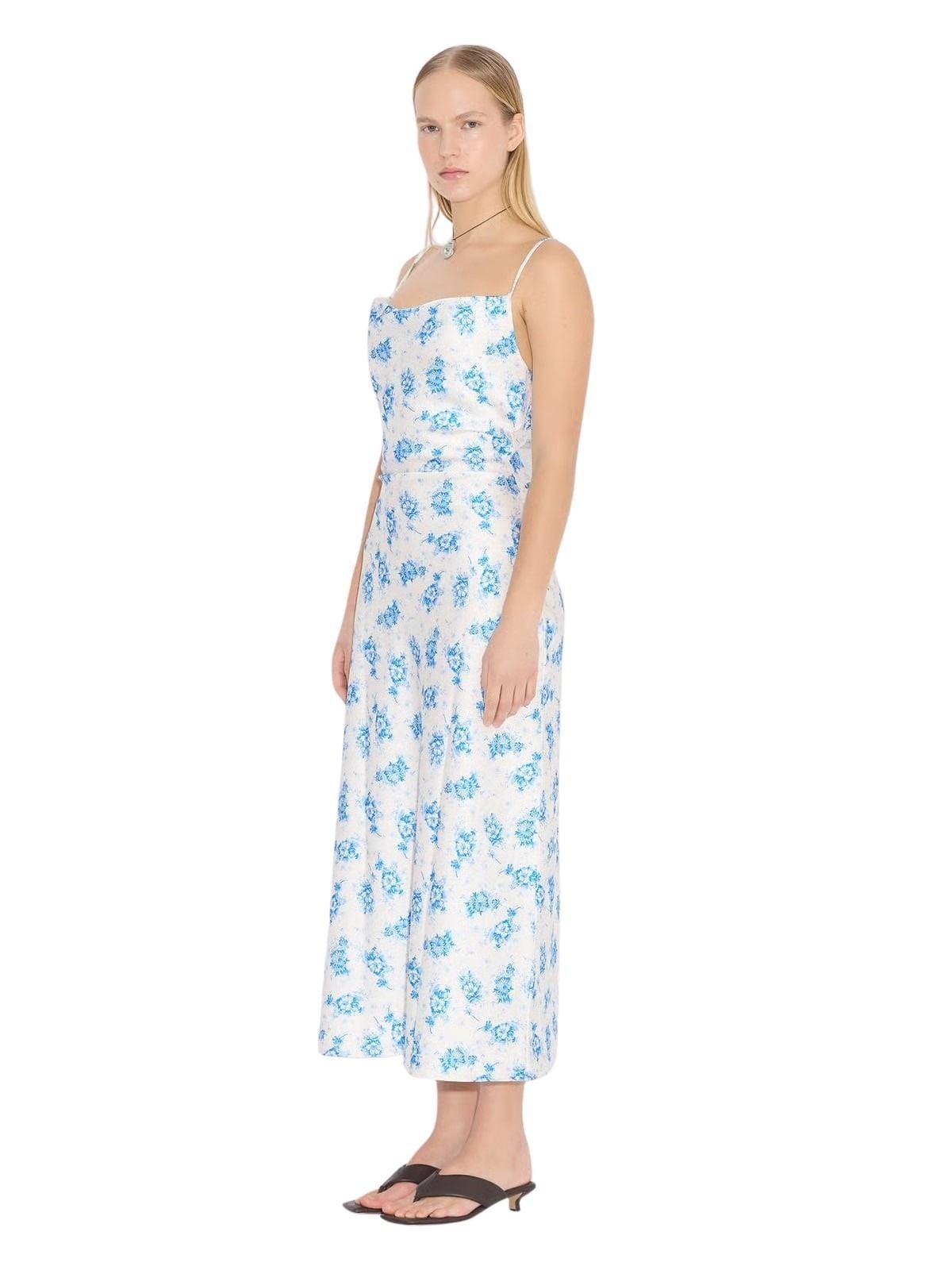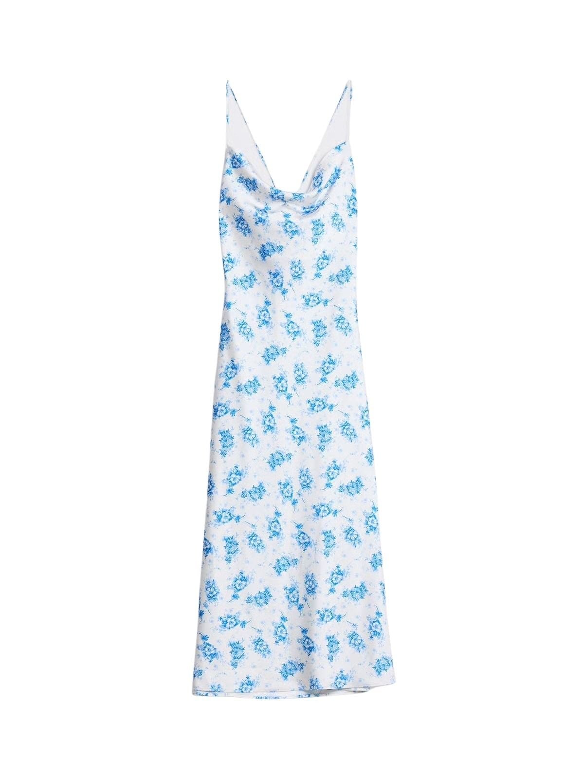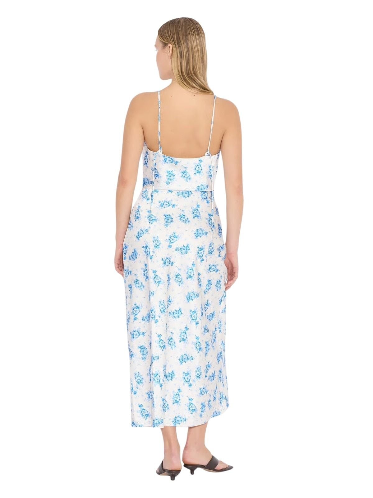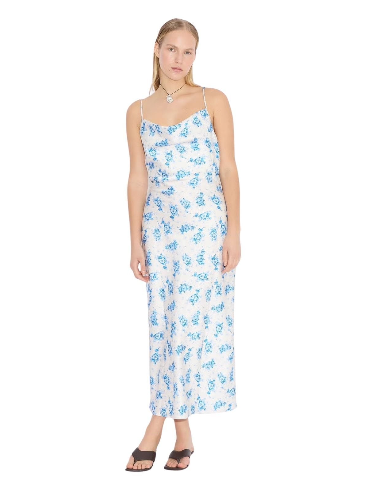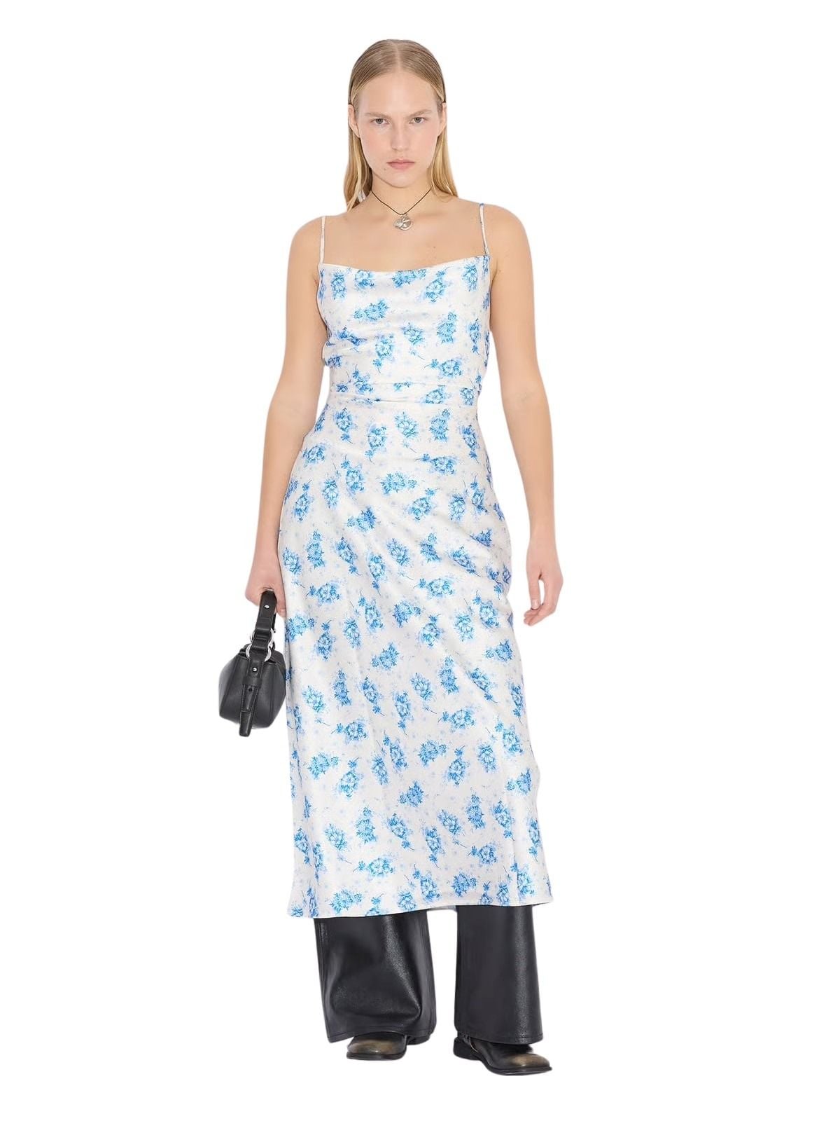 Eila Print Midi Dress fra Holzweiler. En feminin midikjole med delikat blått blomsterprint og smale stropper. Den har en flatterende, kroppsnær passform med lett drapert utringning som gir et elegant uttrykk. Perfekt til både sommerdager og festlige anledninger med sandaler eller hæler.