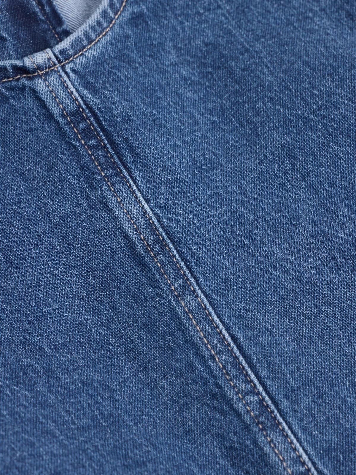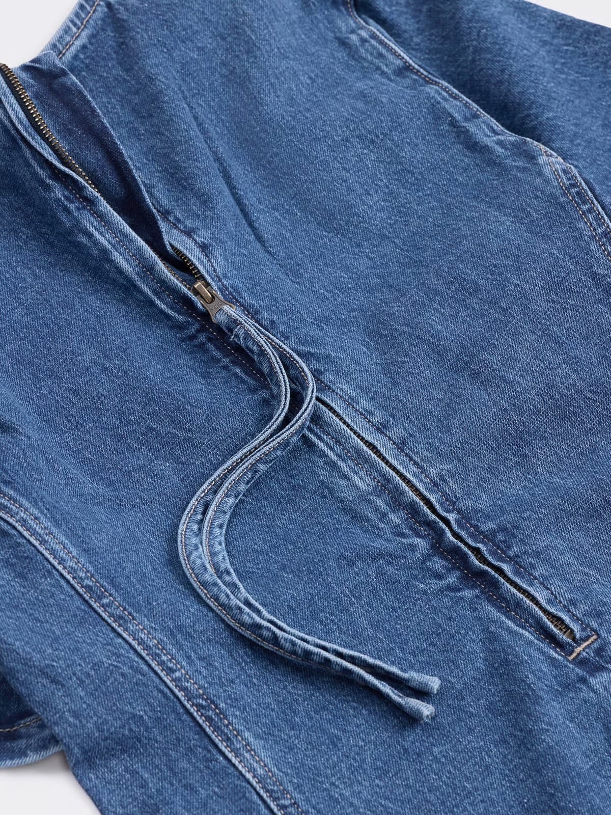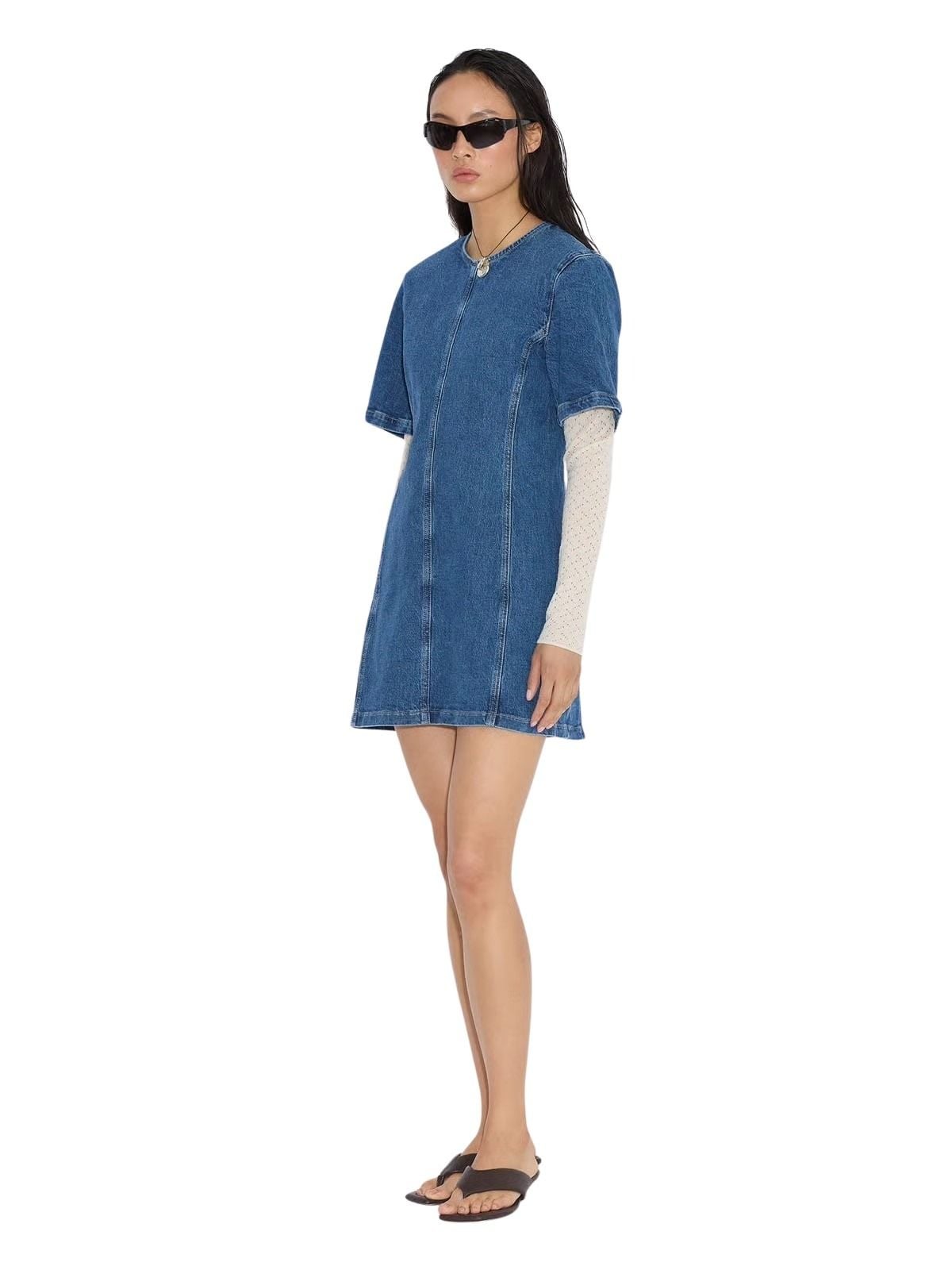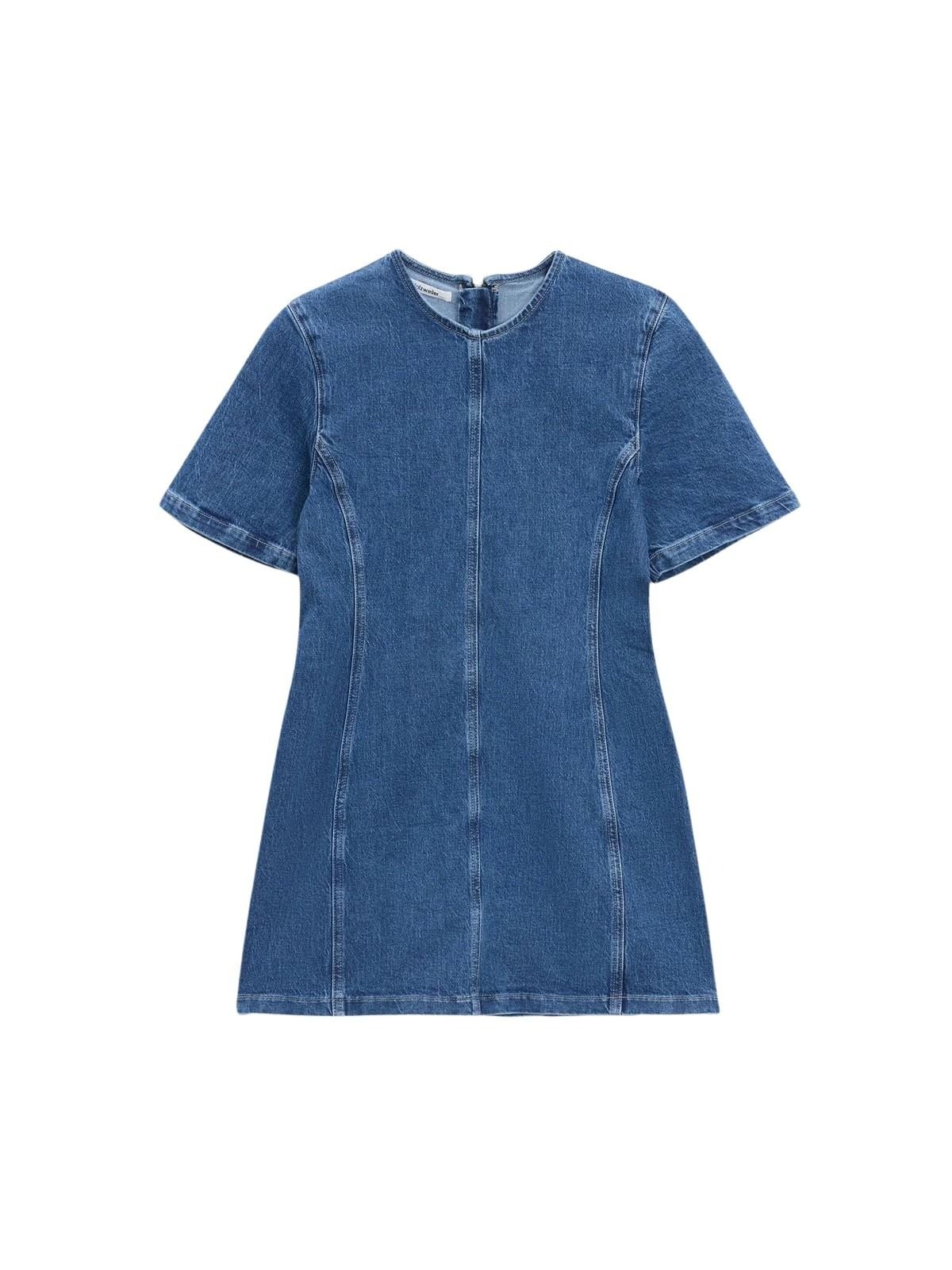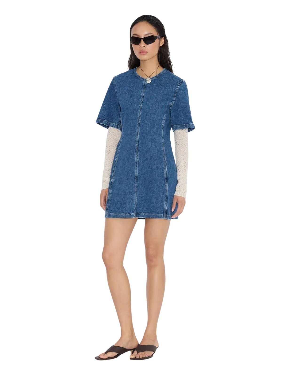 Short Denim Dress fra Holzweiler. En kul og feminin denimkjole med kort lengde og flatterende, rett silhuett. Den har korte ermer og en ren, minimalistisk look som gjør den enkel å style til både hverdag og kveld. Bruk den med sandaler for en casual vibe, eller med boots og jakke for en mer edgy look.