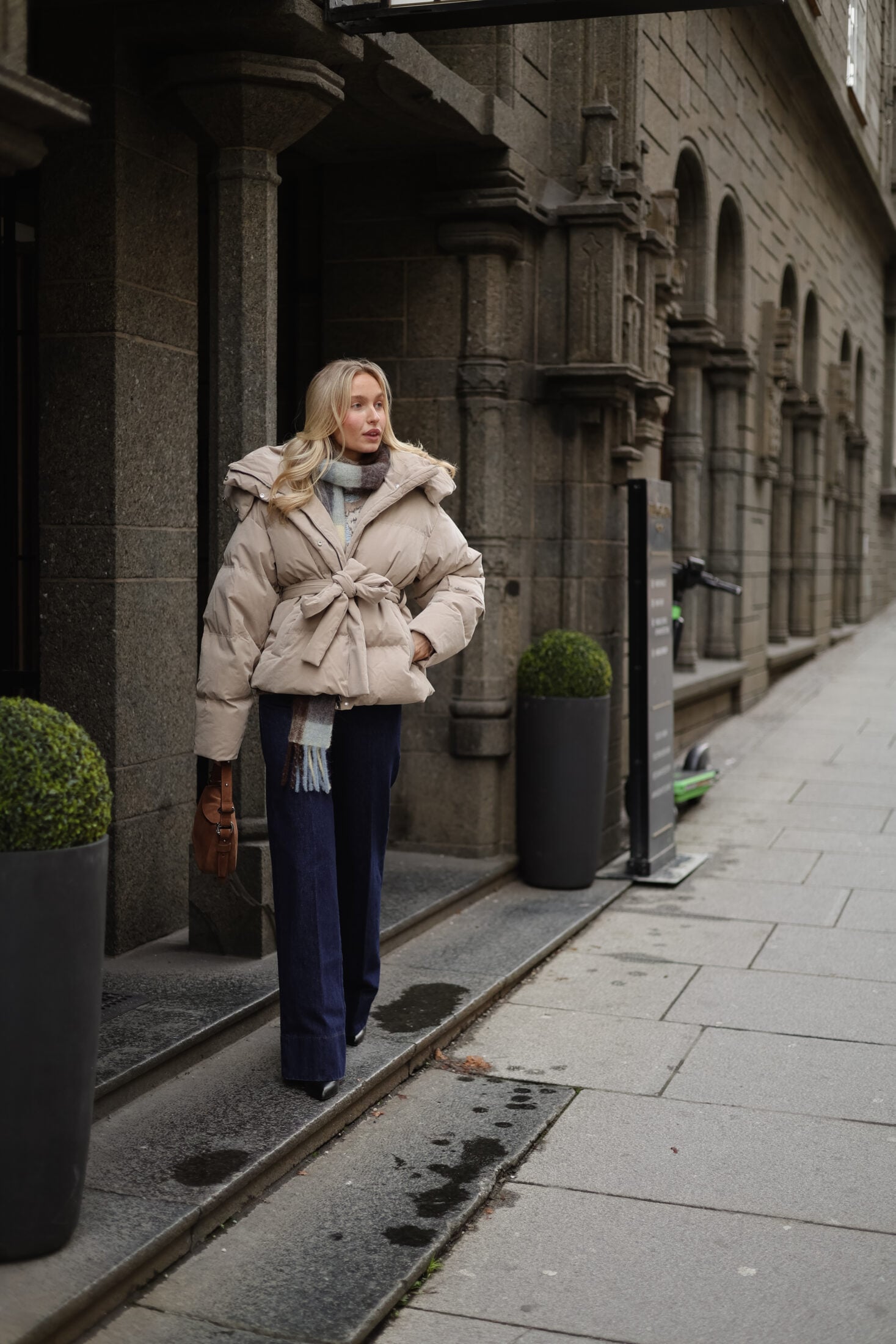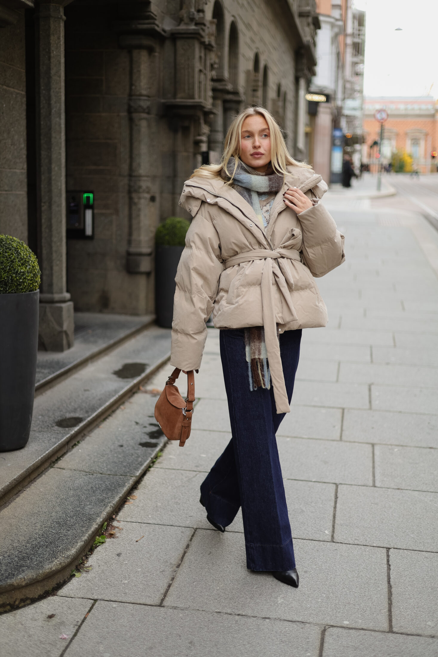 Dunjakke til dame fra Holzweiler. Luksuriøs jakke som kombinerer volum og feminint snitt i én stilren silhuett. Vattert med dun og fjær for lett varme, med en myk, børstet overflate som gir et eksklusivt uttrykk. Det brede beltet i livet fremhever figuren, mens den høye kragen og den generøse hetten gir ekstra komfort og beskyttelse på kalde dager.