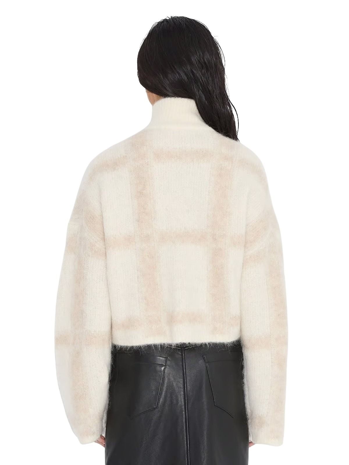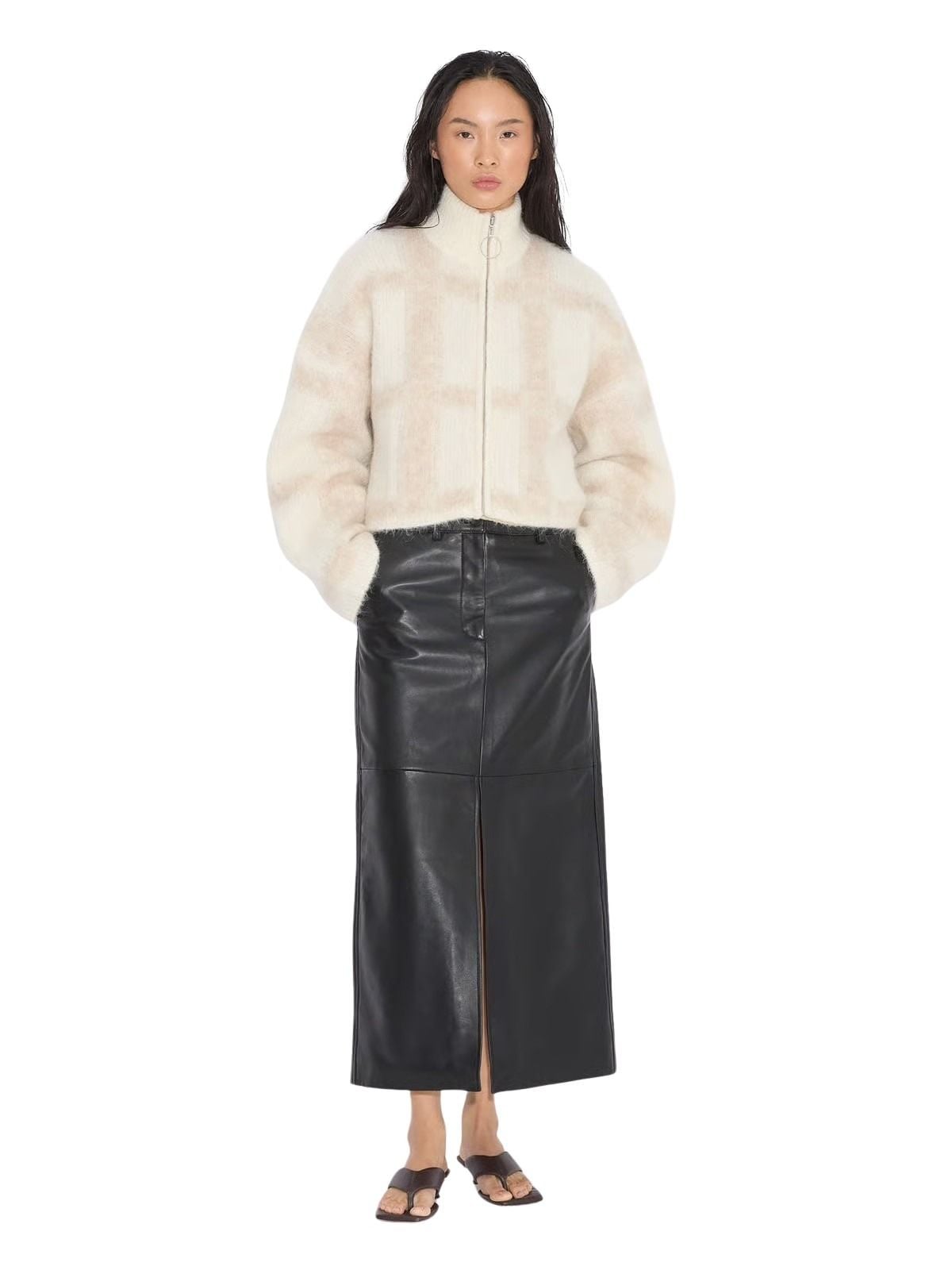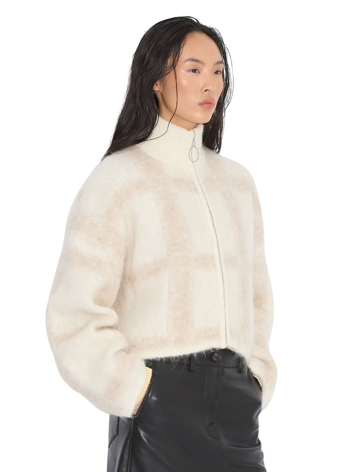 Tine Light Check Cardigan fra Holzweiler. En myk og lun cardigan med et delikat rutemønster og moderne, kort passform. Den har høy hals og glidelås i front som gir et sporty og samtidig elegant uttrykk. Perfekt over en enkel topp eller kjole når du vil ha et varmt, men lett lag.