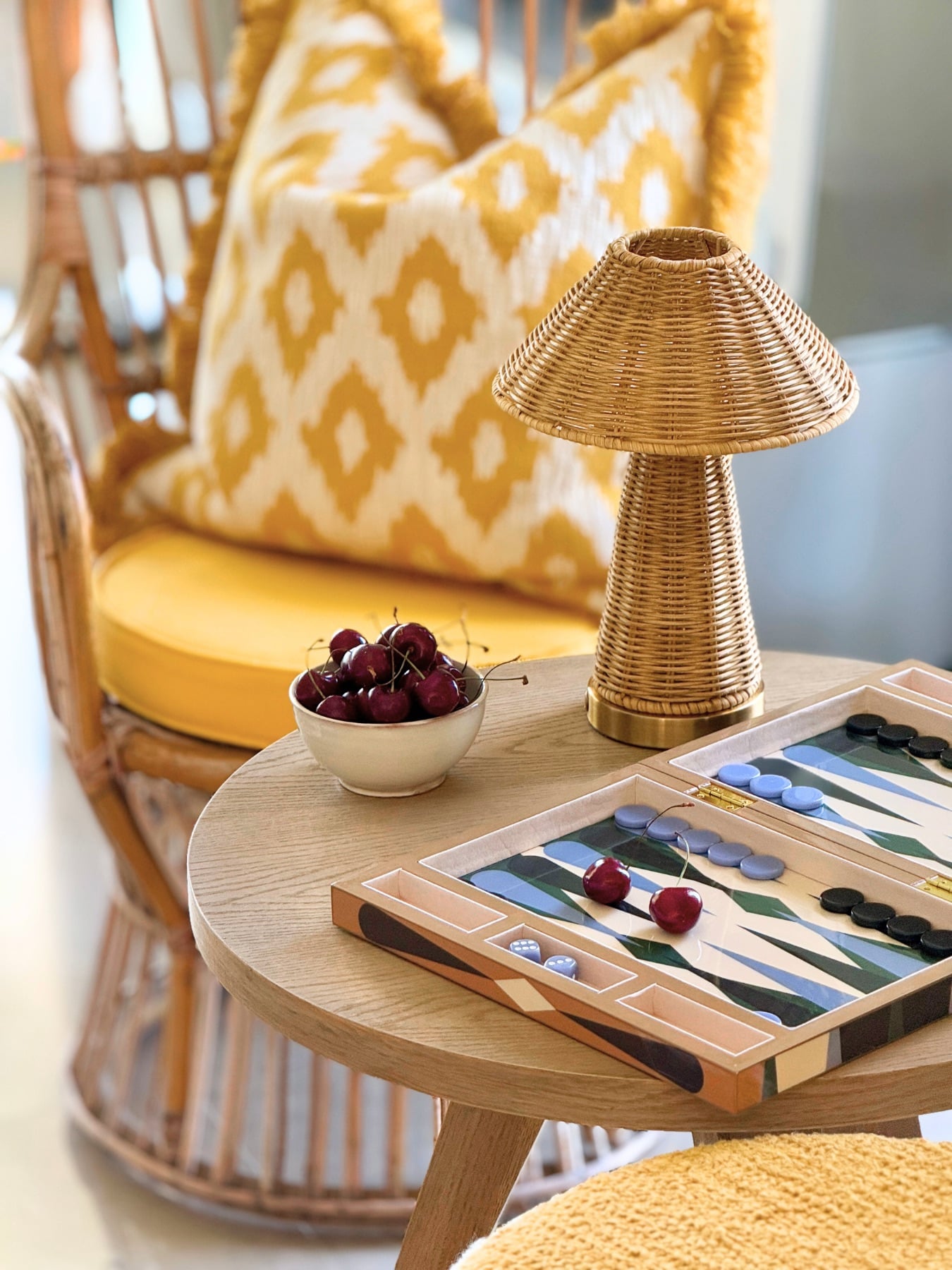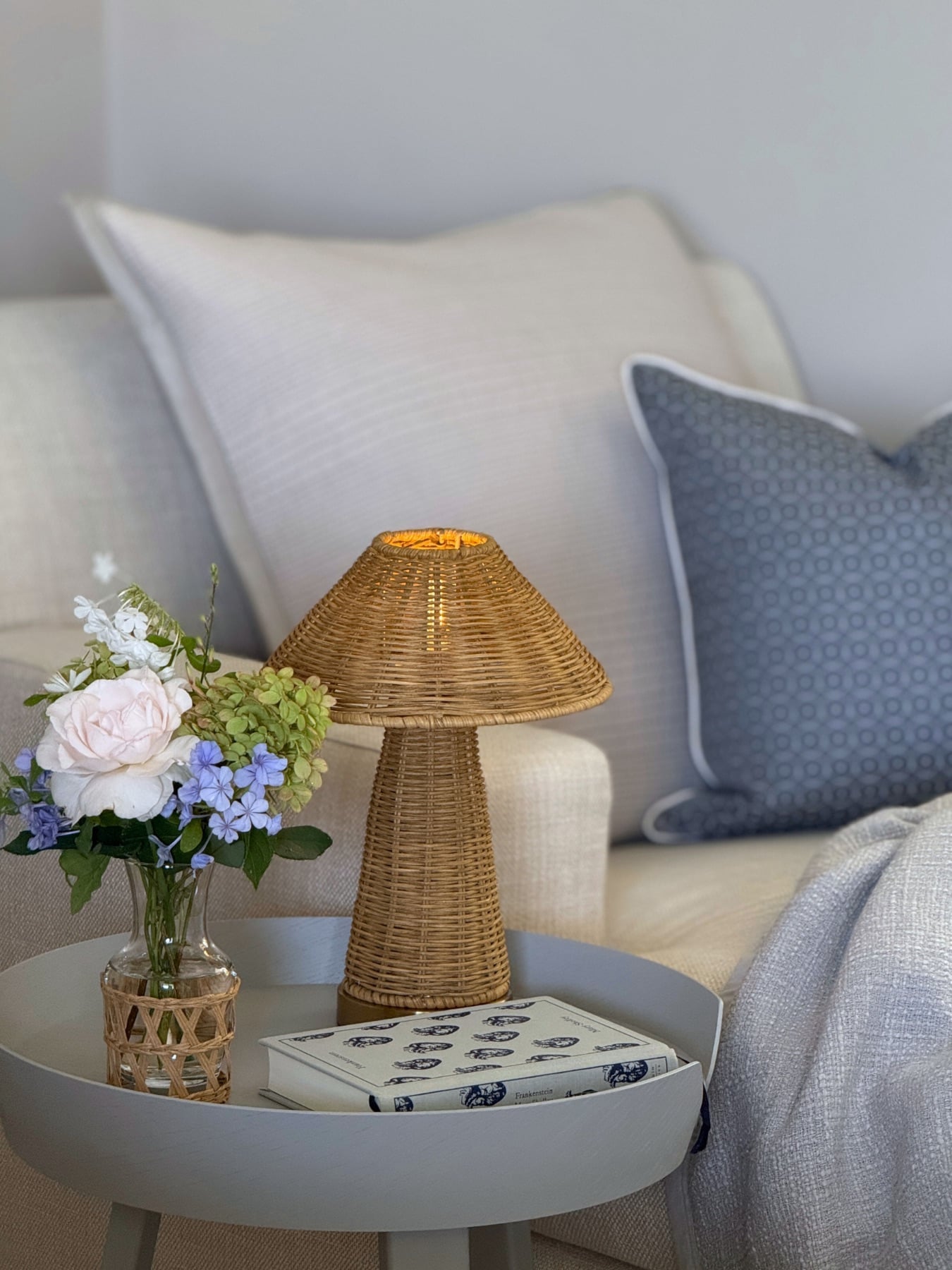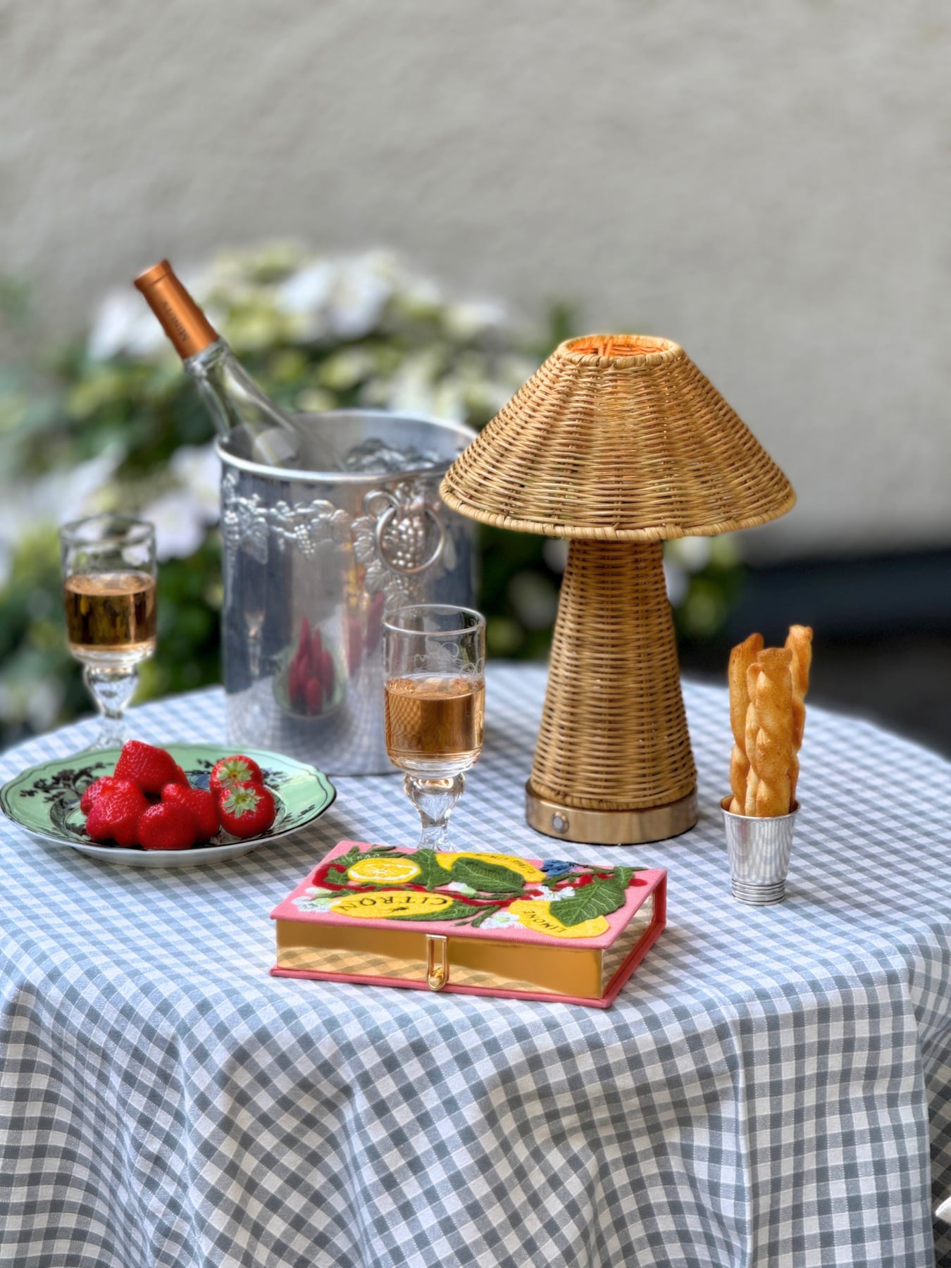 Singapore fra House of Firefly. En oppladbar og bærbar bordlampe med en nydelig rottingbase og matchende skjerm som gir et naturlig og sjarmerende uttrykk. Den skaper varm stemning både ute og inne, perfekt til alt fra utendørs servering til et hyggelig frokostbord. En dekorativ favoritt som tilfører karakter uansett hvor du plasserer den.