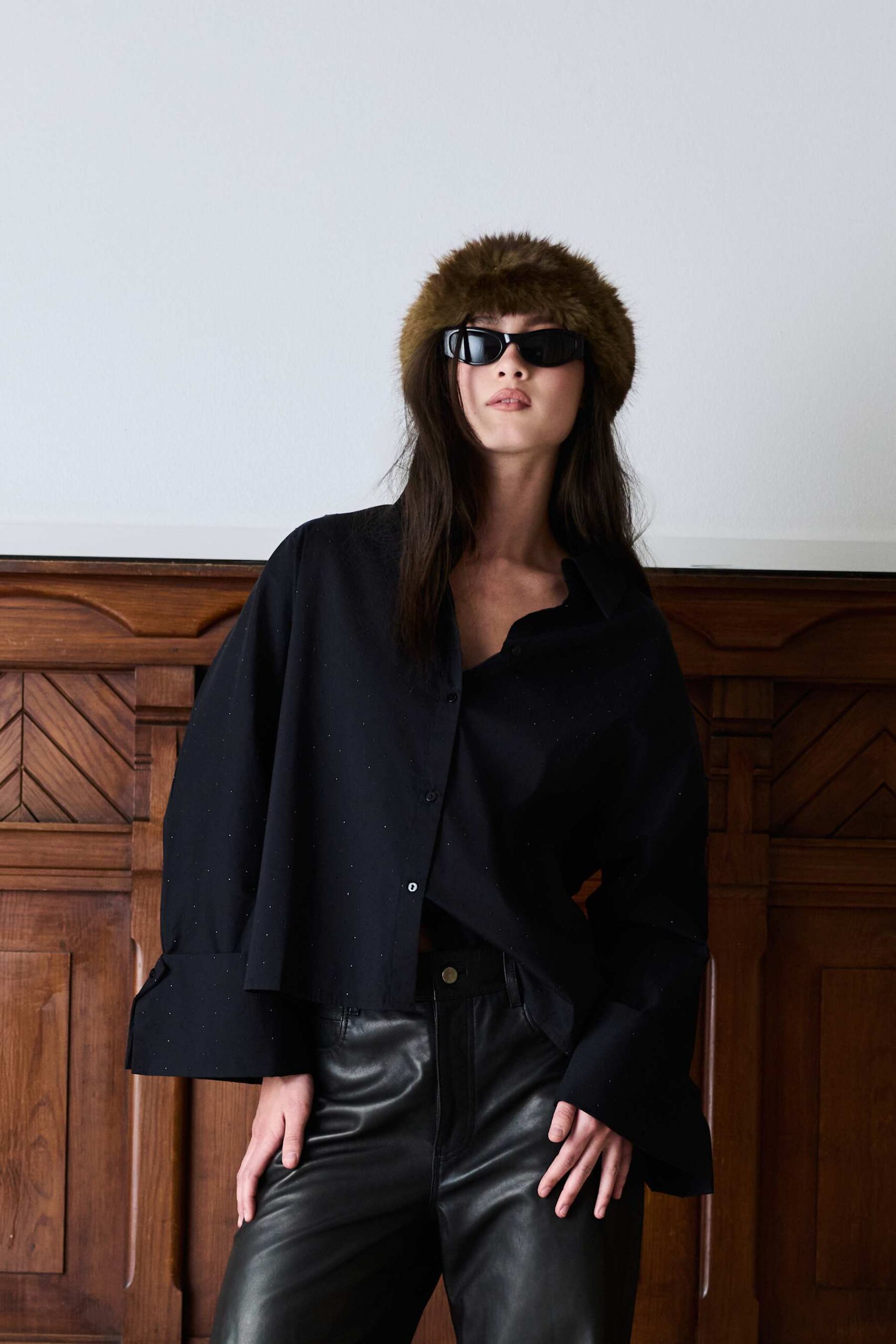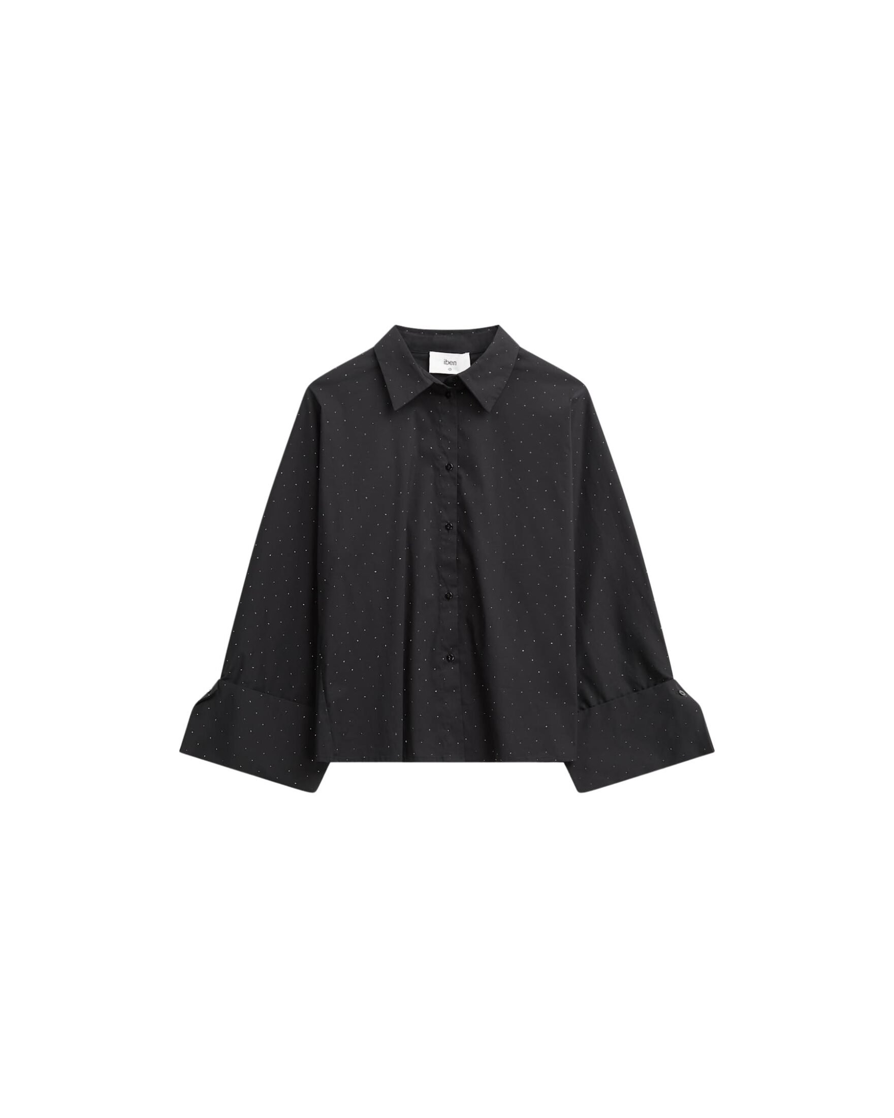 Skjorte til dame fra Iben. En elegant skjorte med avslappet passform og subtile glitrende detaljer som gir et eksklusivt preg. Laget i en crisp bomullskvalitet med brede mansjetter og tidløs krage. En garderobefavoritt som kombinerer komfort og stil.