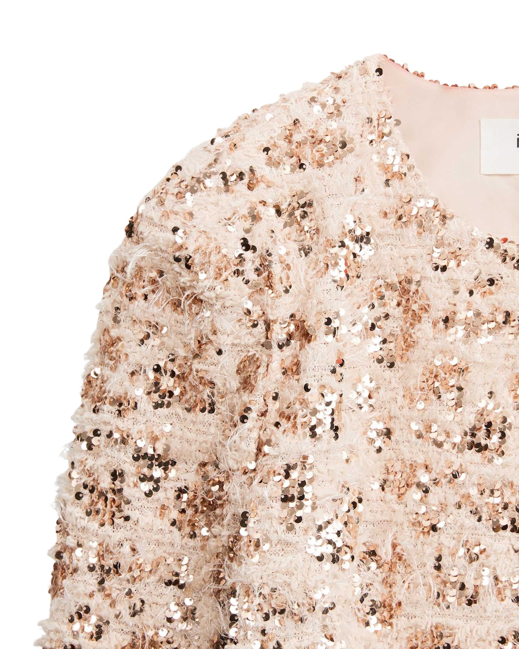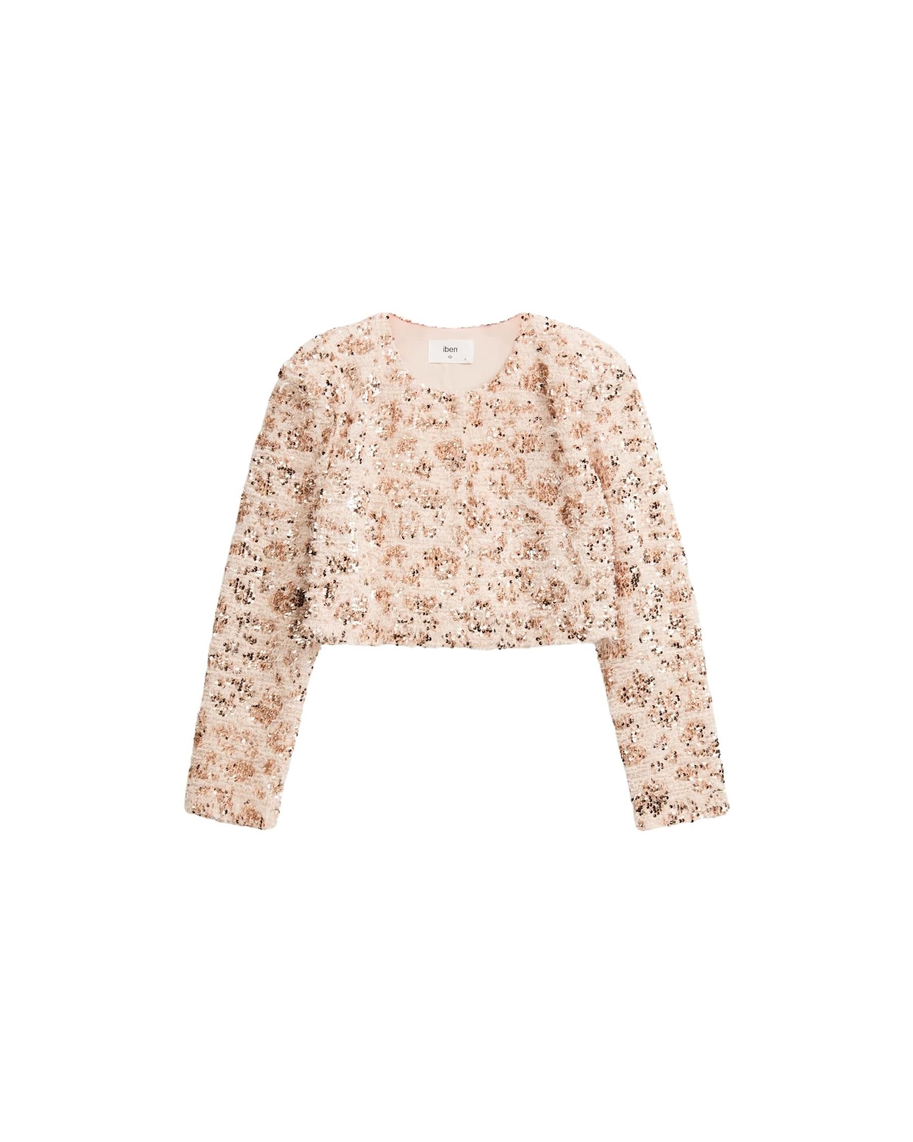 Jakke til dame fra Iben. En eksklusiv, kort jakke dekket av glitrende paljetter i varme champagnefargede toner. Den strukturerte fasongen og det luksuriøse uttrykket gjør den perfekt til festlige anledninger. Bruk den over en enkel topp eller kjole for umiddelbar wow-effekt.