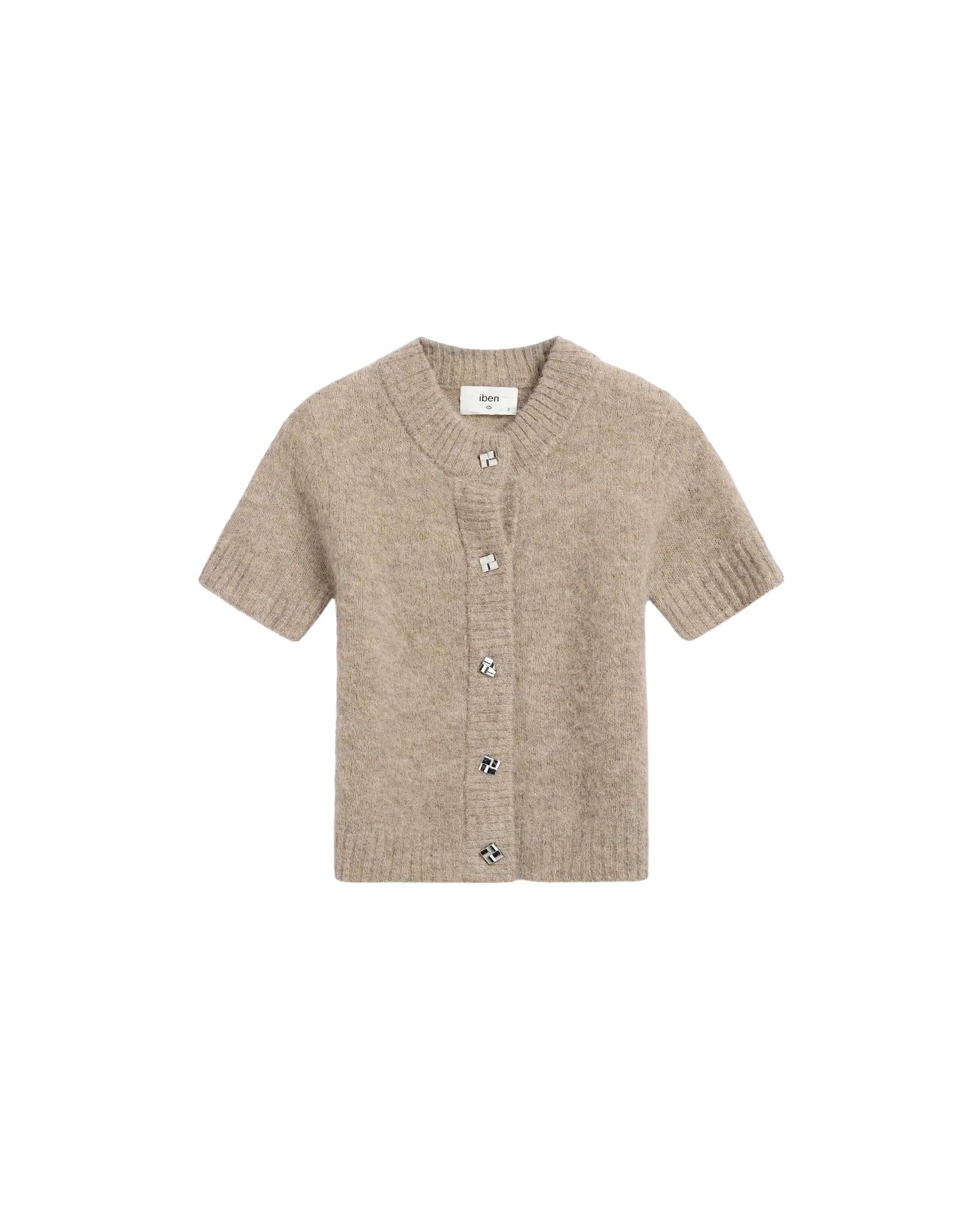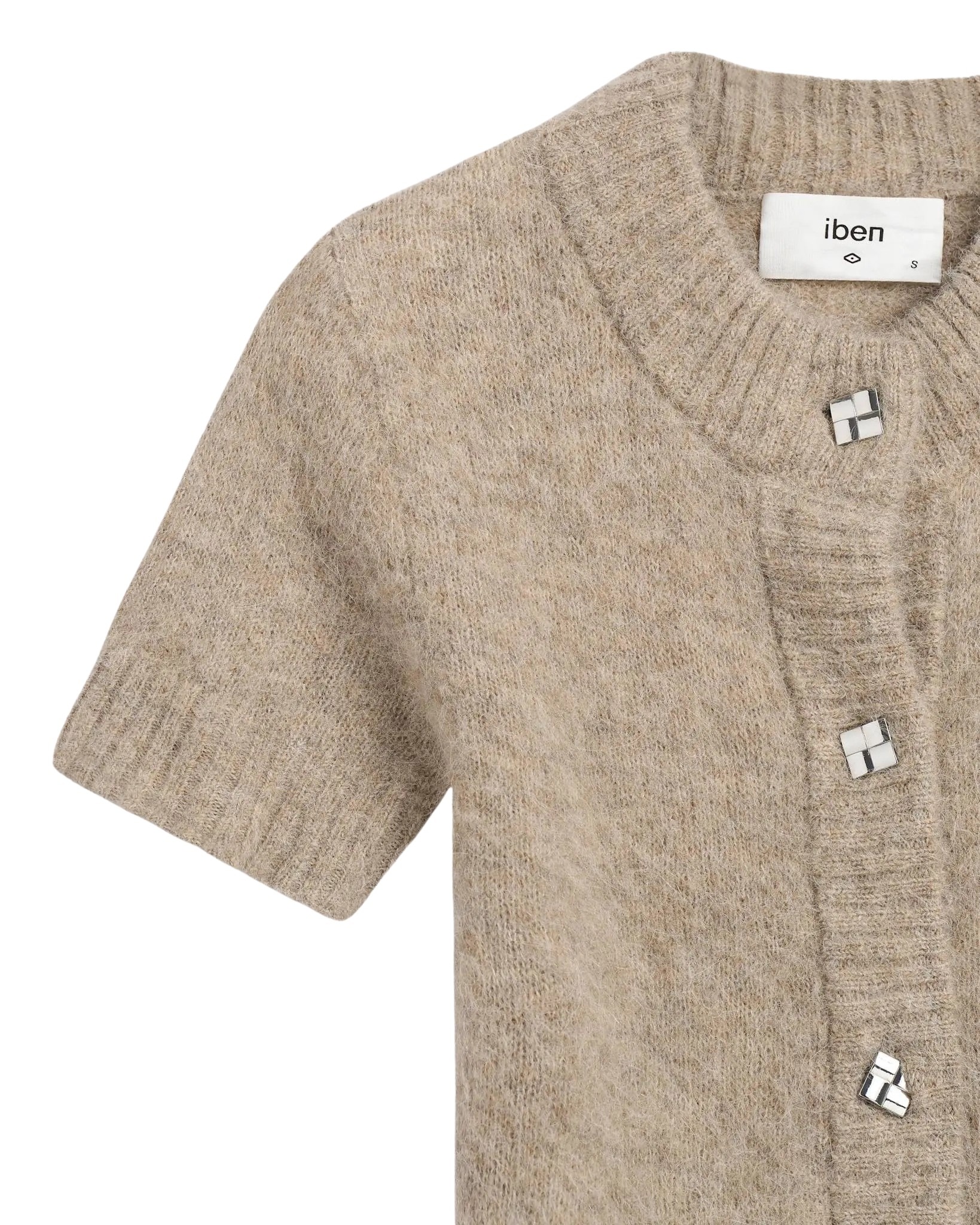 Monty SS Cardigan fra IBEN. En kortermet cardigan laget i en luksuriøs blanding av alpakka og ull som gir en myk og behagelig følelse. De markante metallknappene tilfører et moderne uttrykk, mens den tidløse silhuetten gjør den perfekt til lag-på-lag i overgangssesongene. Et elegant og allsidig plagg som løfter enhver garderobe.