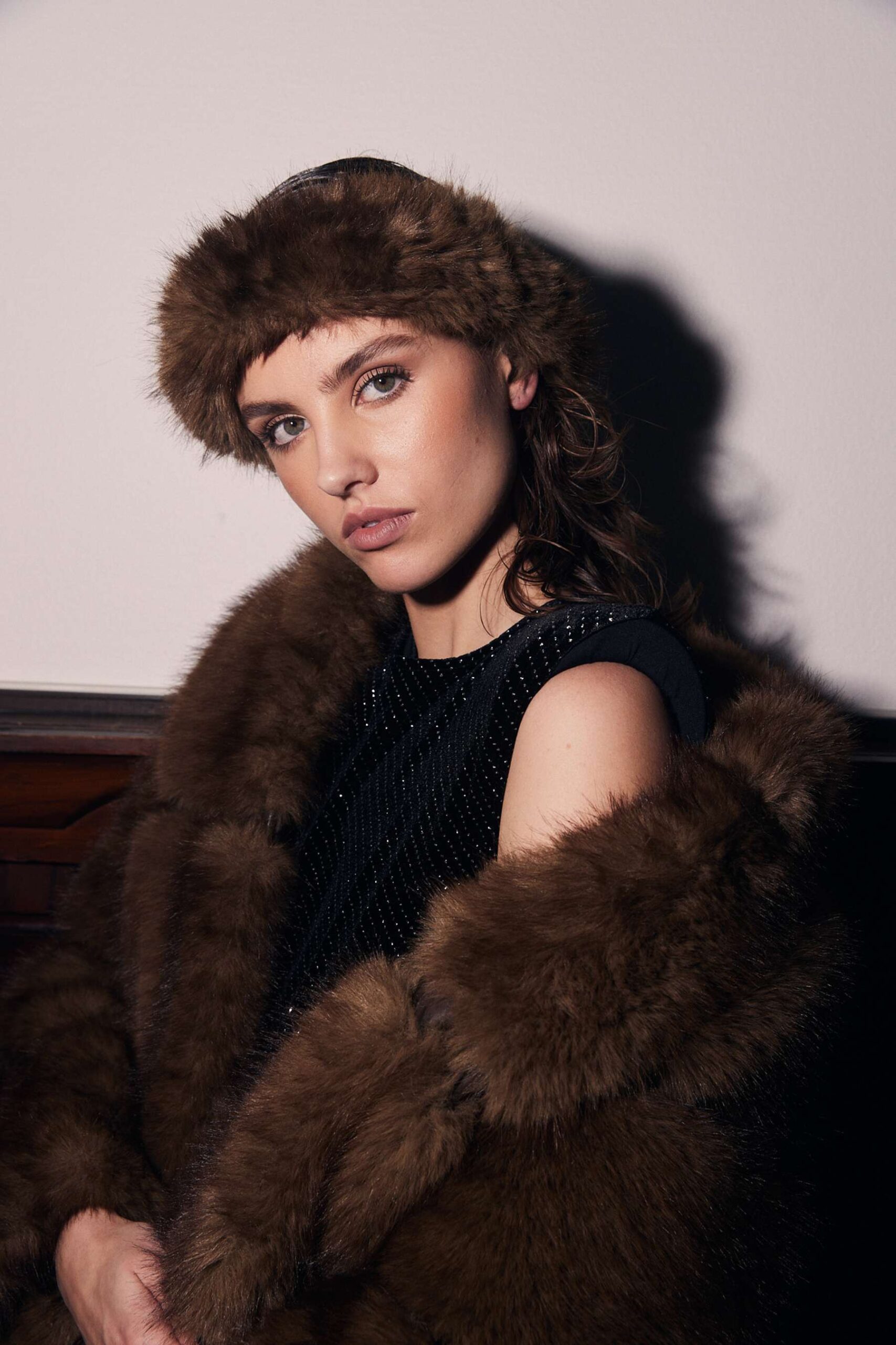 Pannebånd til dame fra Iben. Et elegant pannebånd i myk, eksklusiv fuskepels som gir et luksuriøst uttrykk. Perfekt for kalde dager når du vil holde varmen uten å ofre stilen. Prydet med en gullfarget logoplate for en fullført look.