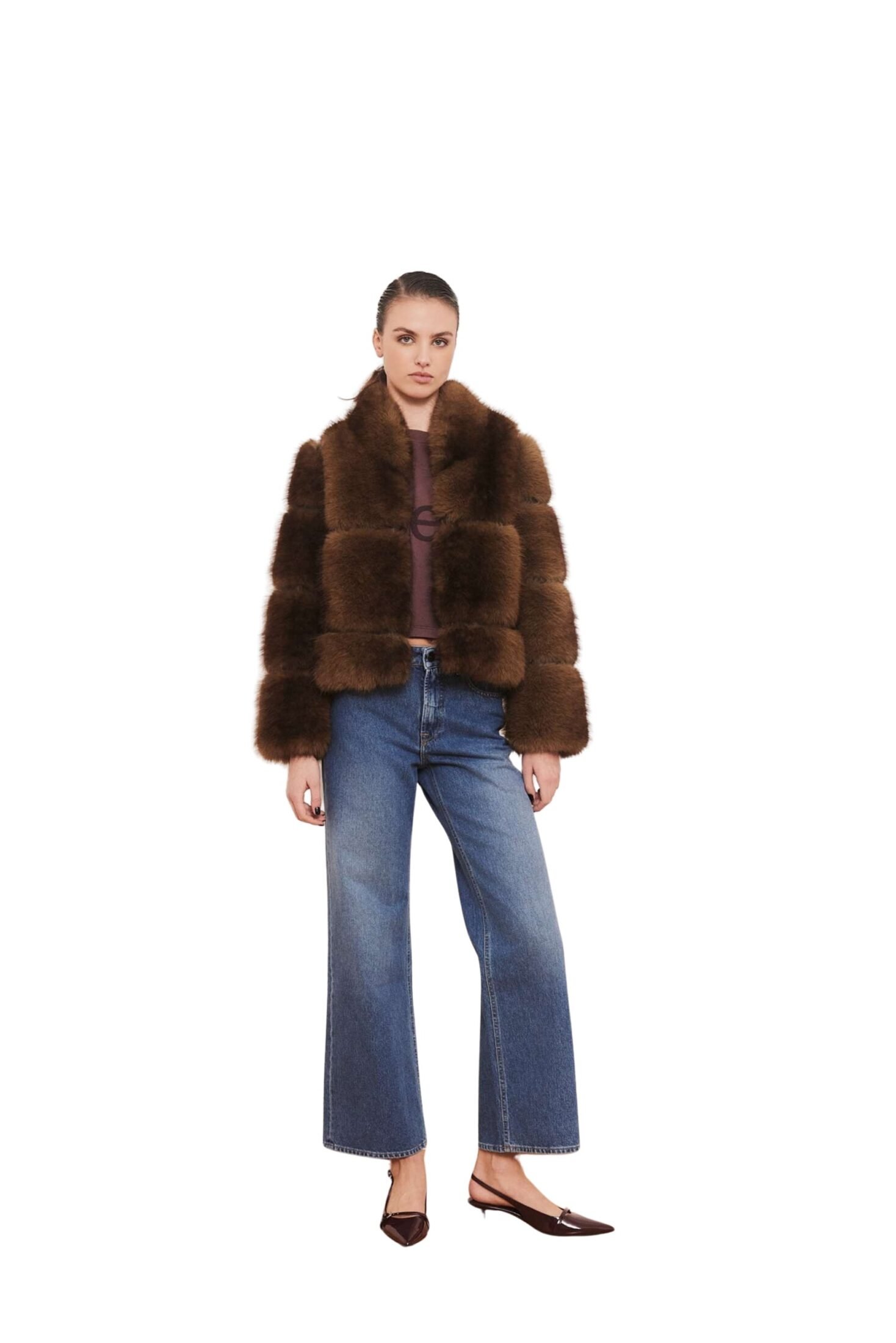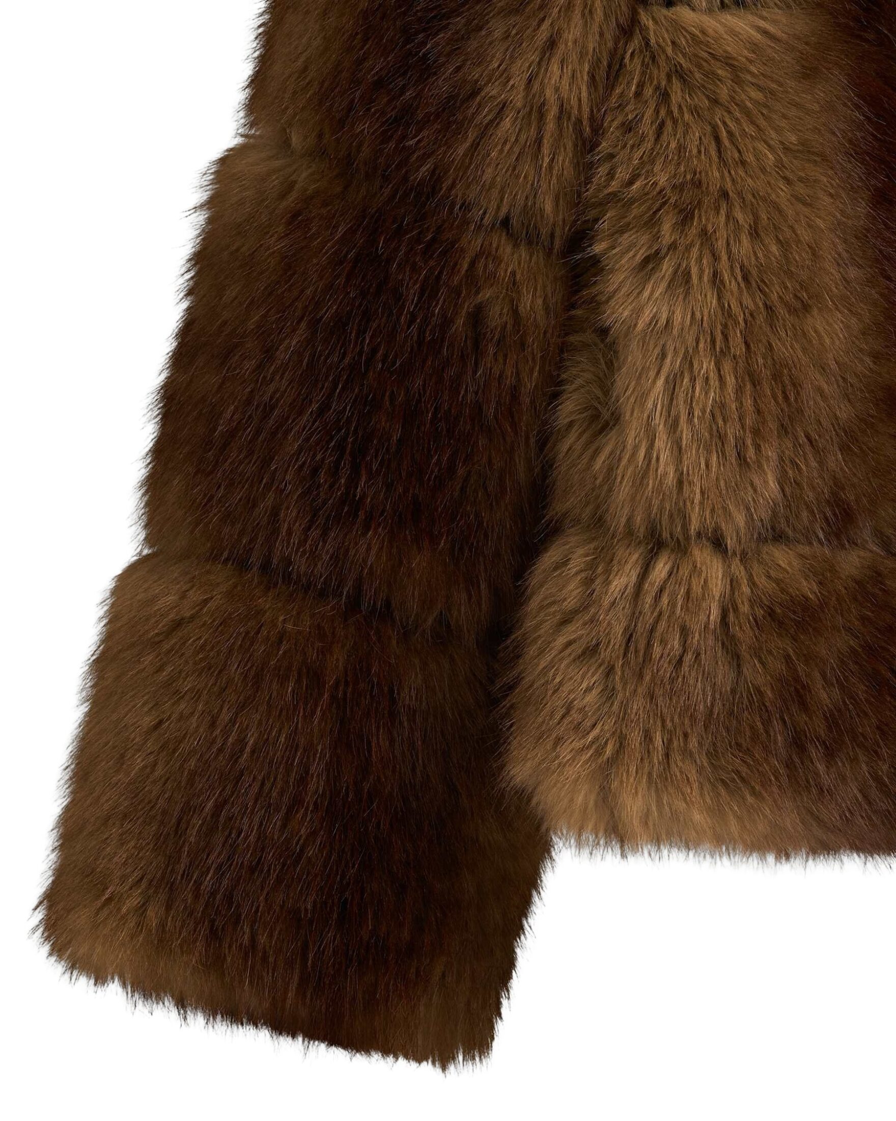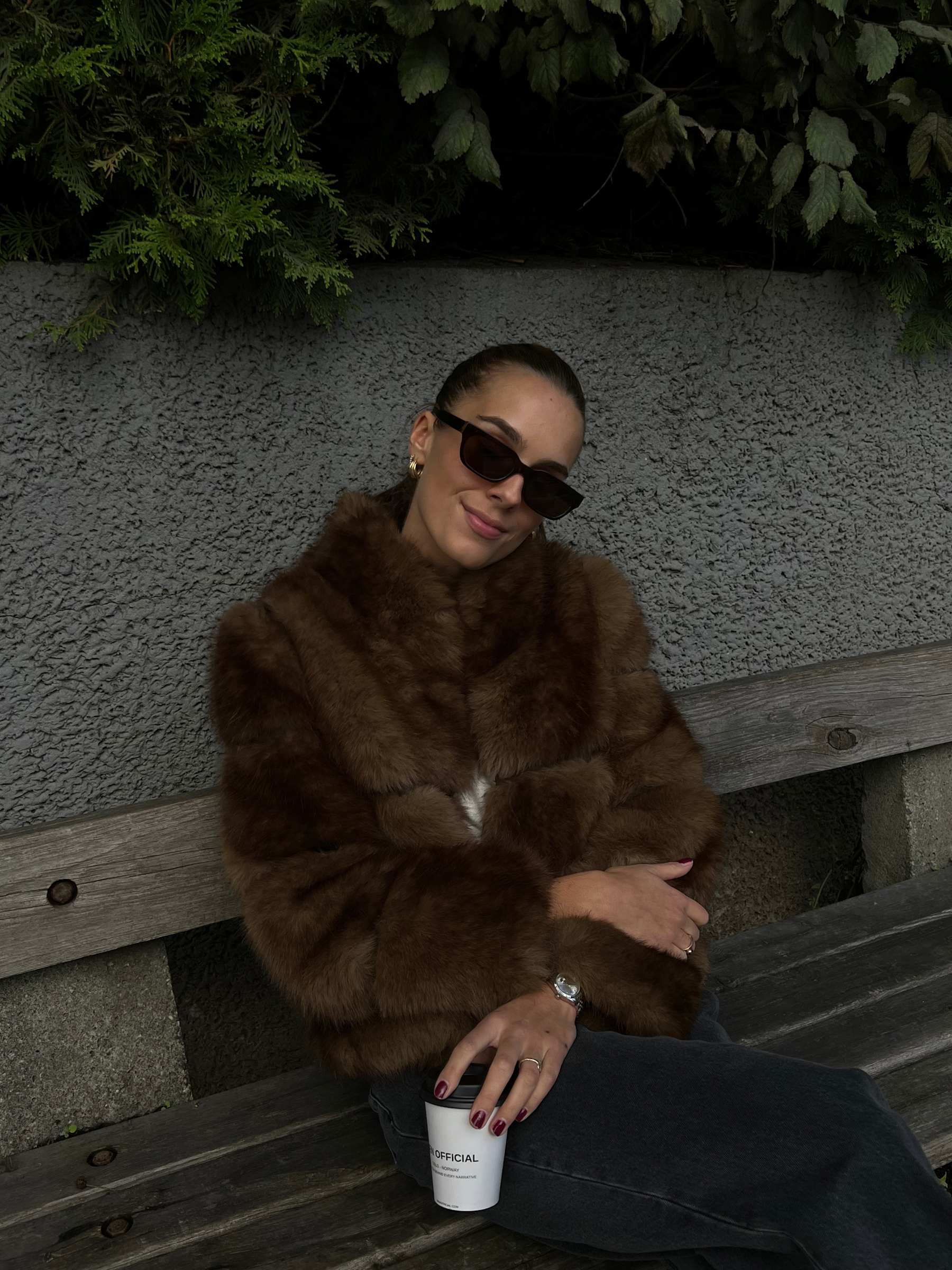 Jakke til dame fra Iben. En sofistikert fuskepelsjakke som kombinerer moderne eleganse med tidløs komfort. Laget av et eksklusivt, ultramykt materiale som føles som ekte pels, og kommer i en varm brun tone. Med diskrete hektelukking og skjulte sidelommer får du en ren og raffinert silhuett – perfekt til både hverdags og fest.