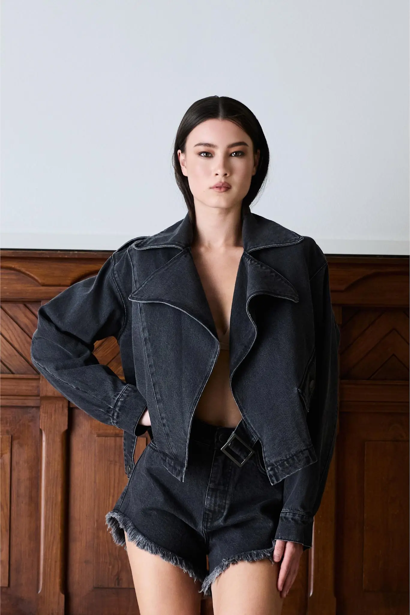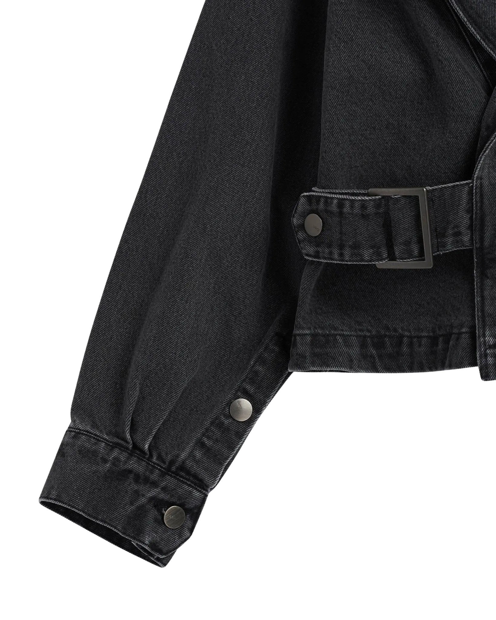 Reign Denim Jacket fra IBEN. En moderne vri på den klassiske denimjakken med en lett oversized passform og markerte slag. Den asymmetriske lommen og justerbar spenne i siden skaper et edgy uttrykk og en flatterende silhuett. Vasket sort denim og metallknapper fullfører looken med en cool, sofistikert finish.