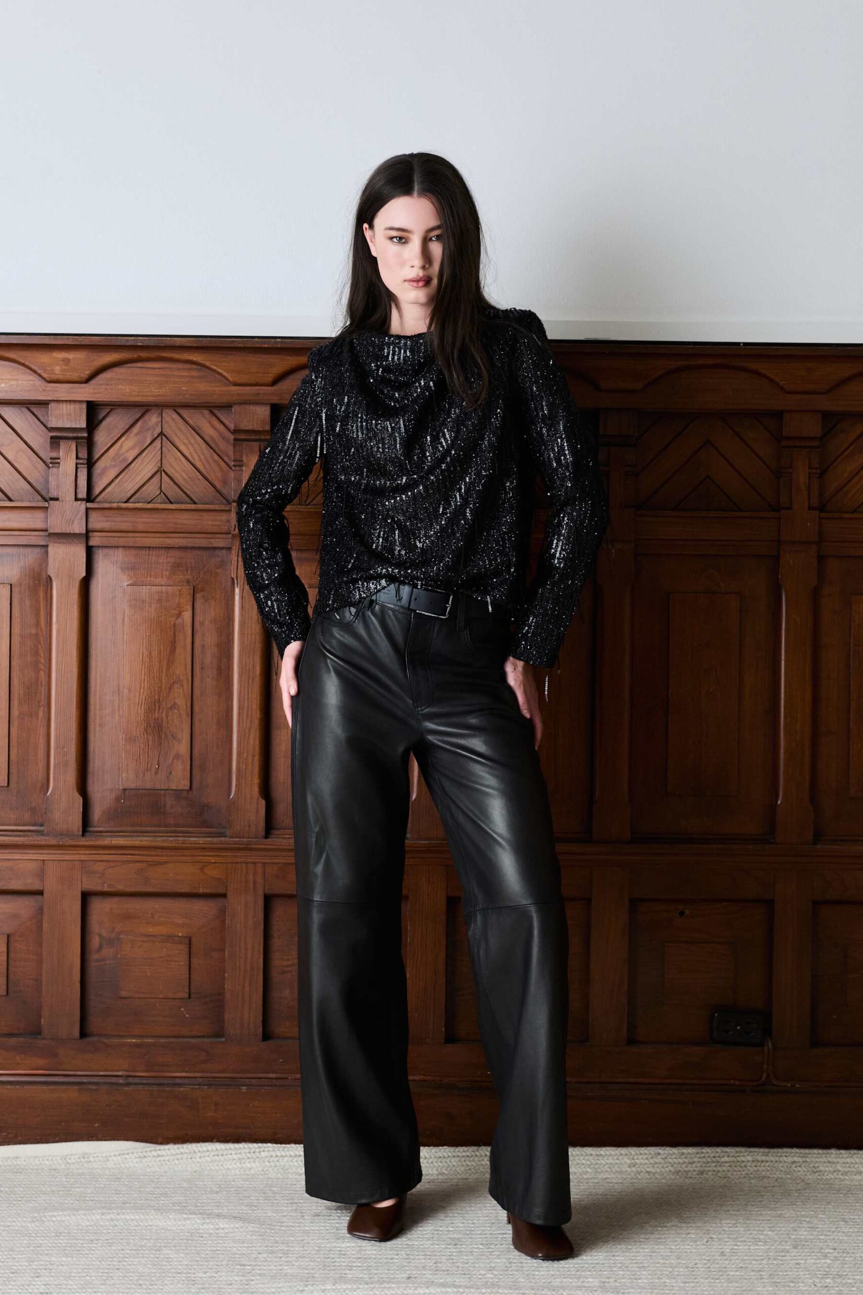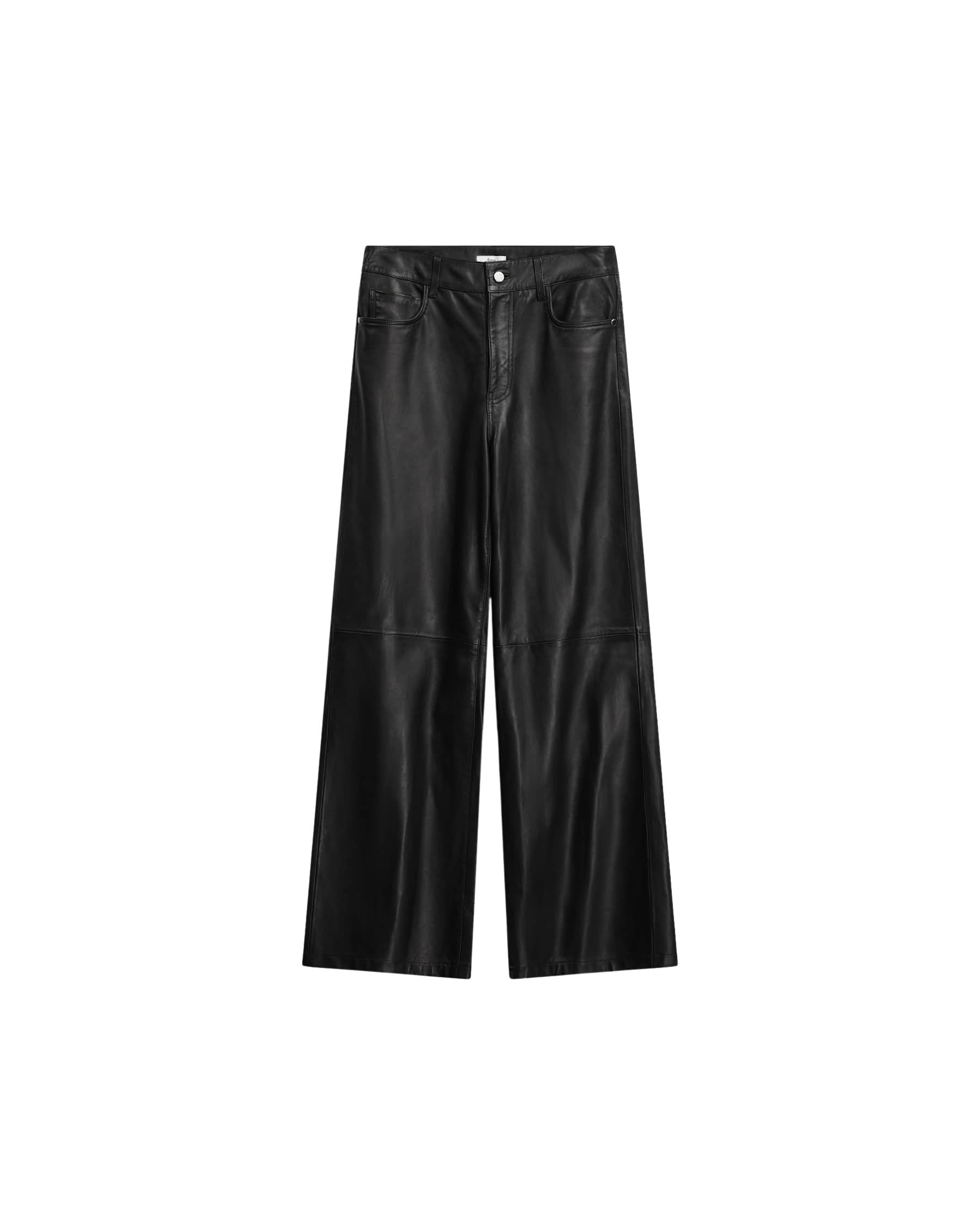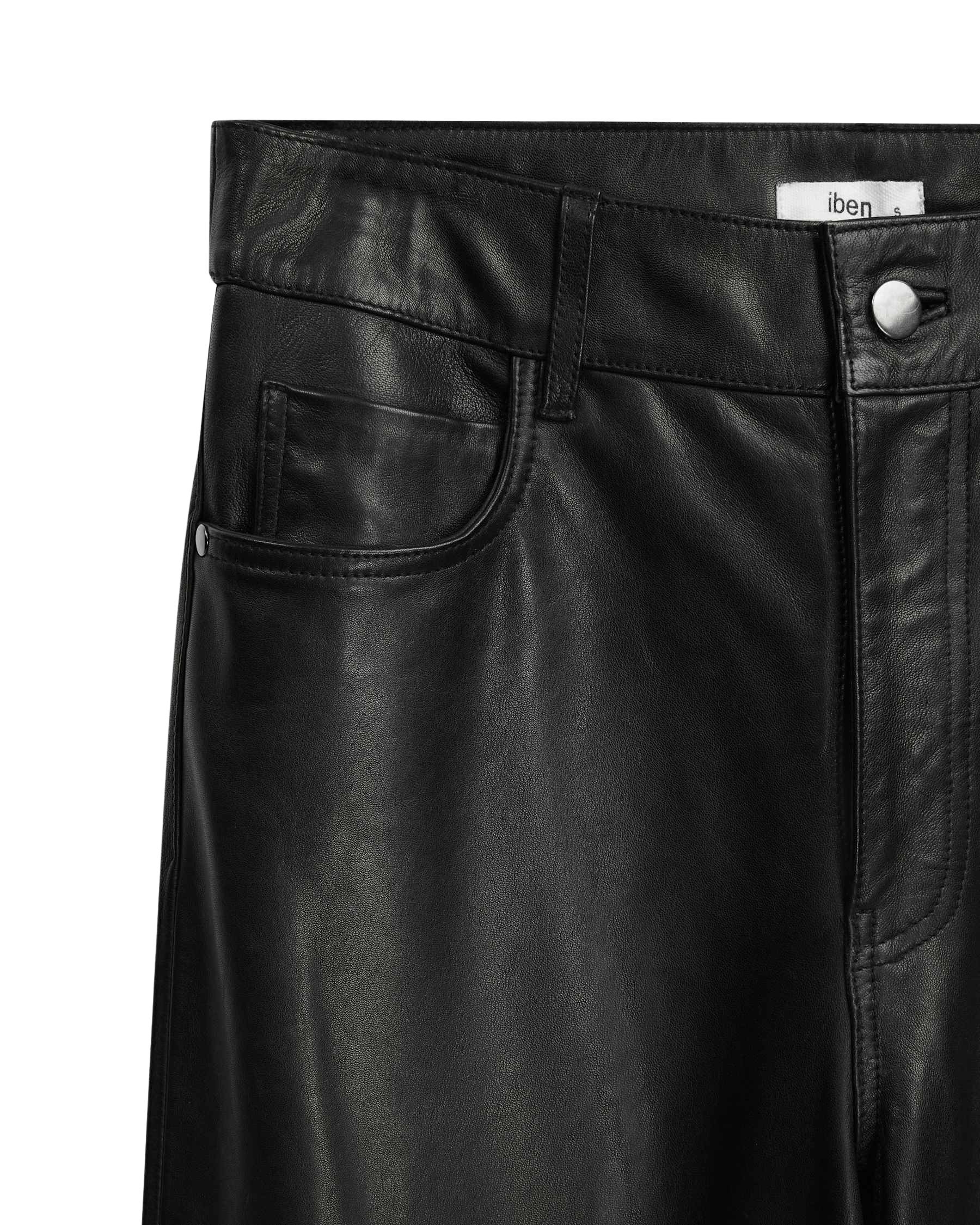 Skinnbukse til dame fra Iben. Eksklusive skinnbukser laget av 100% premium skinn. Med sitt minimalistiske design og elegante silhuett kombinerer den tidløs stil med moderne uttrykk. Det myke skinnet gir en luksuriøs følelse, mens den rene fasongen gjør buksene enkle å style både til hverdags og fest. Et allsidig plagg du vil bruke sesong etter sesong.