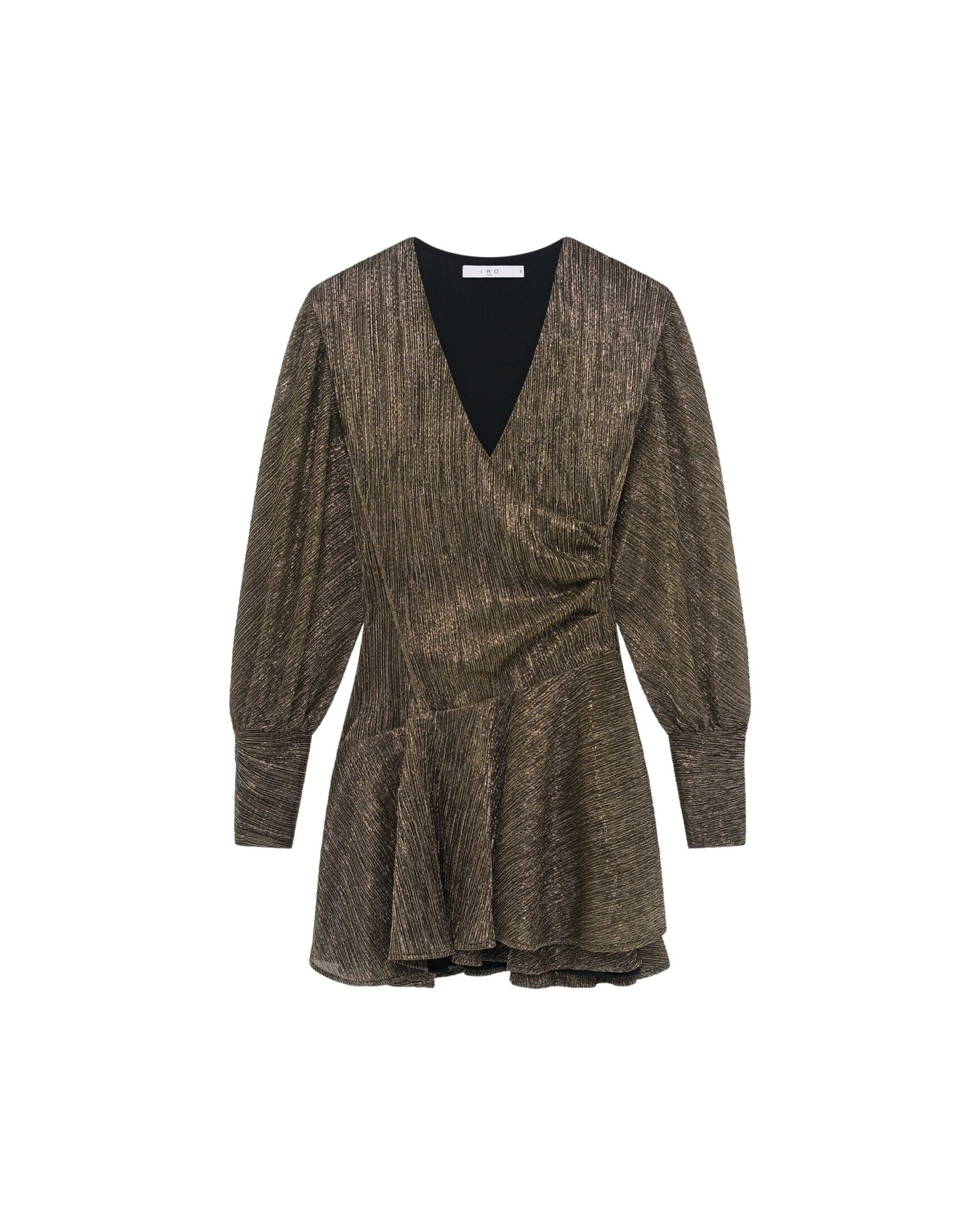 Nydelig kjole til dame fra Iro Paris. Asymmetrisk design med krysset v-hals og volanger i skjørtet. Laget i et nydelig materiale med glitrende detaljer. Den perfekte partykjolen til festsesongen med høye hæler og en stilig clutch til.