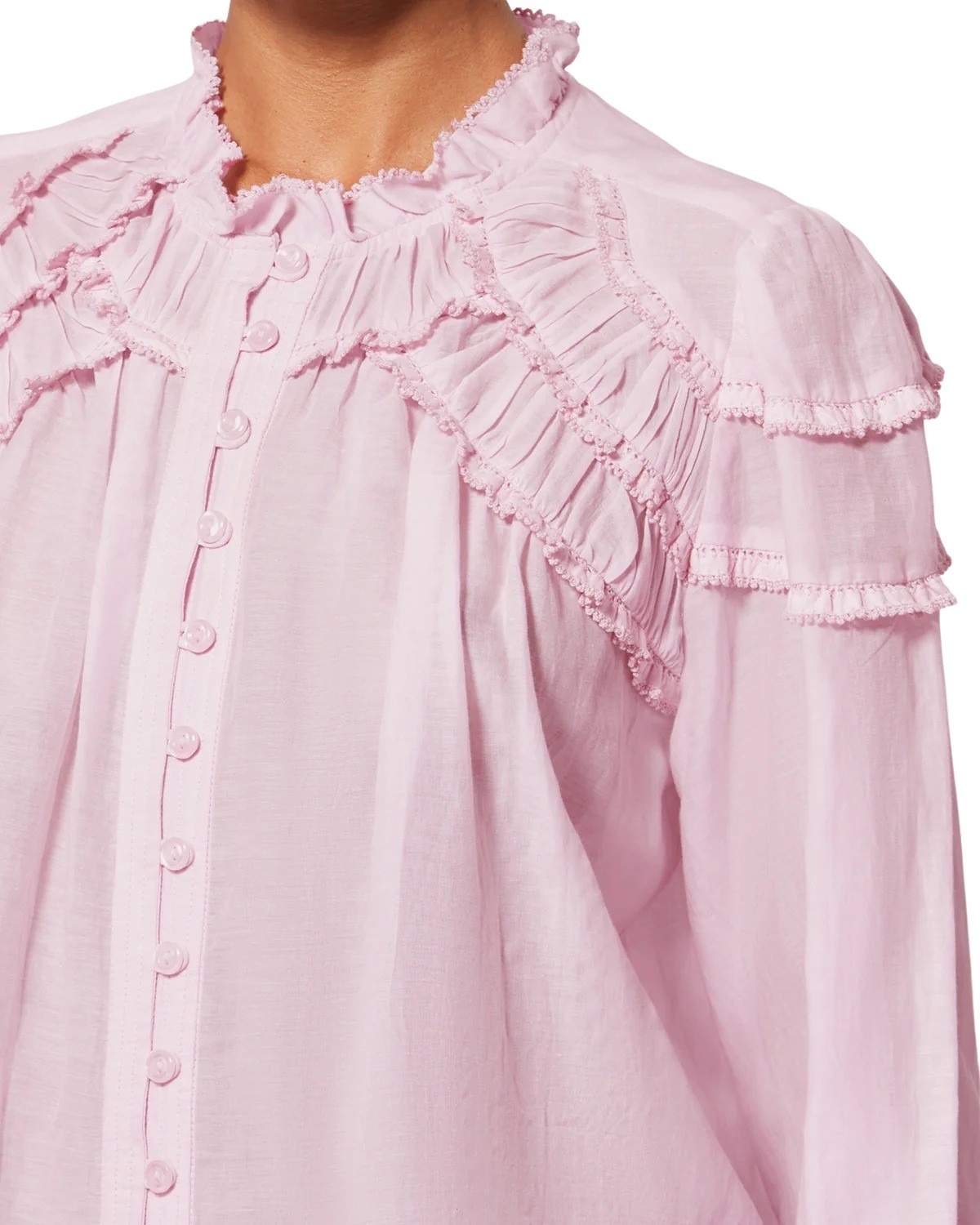 Volangdetaljer foran og på skuldrene