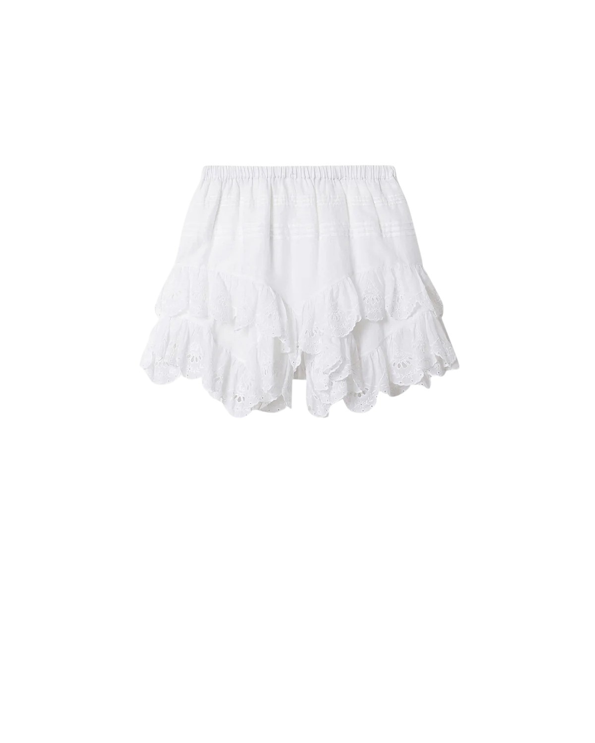 Jocadia Cotton and Floral Lace Shorts fra Isabel Marant Étolie. Laget i lett bomull med romantiske blondedetaljer og volanger. Shortsen har elastisk midje og en luftig passform som gir både komfort og et feminint uttrykk. Perfekt til sommerdager, stylet med en enkel topp og flate sko.