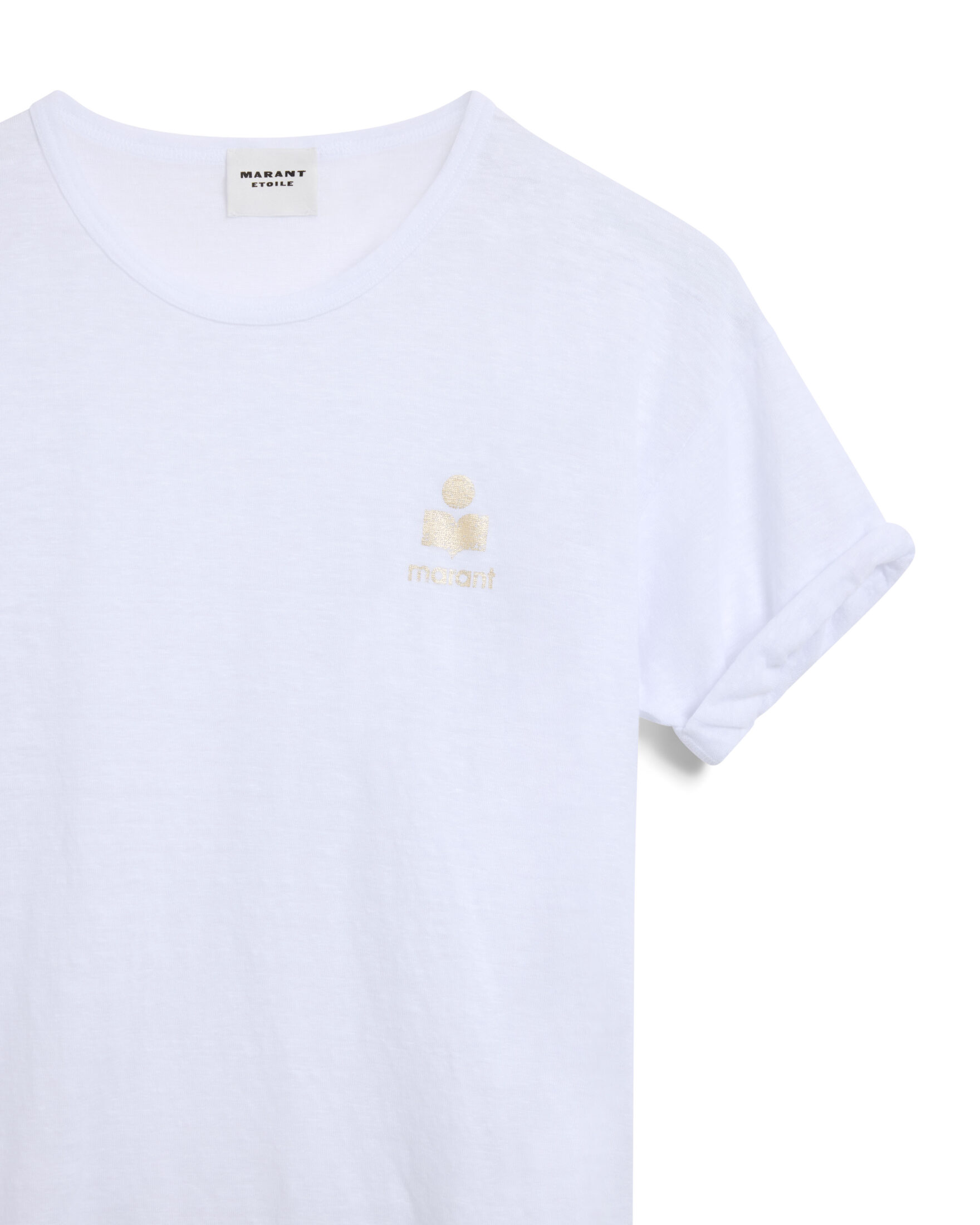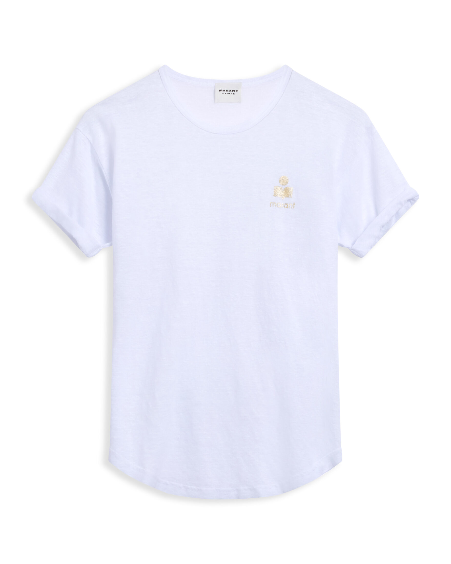 Koldia T-Shirt fra Isabel Marant Étolie. Enkel og luftig T-skjorte i lin med en avslappet passform. Designet har rund hals, korte ermer og en diskré logo i gull på brystet. Perfekt til varme dager med et rent og tidløst uttrykk.