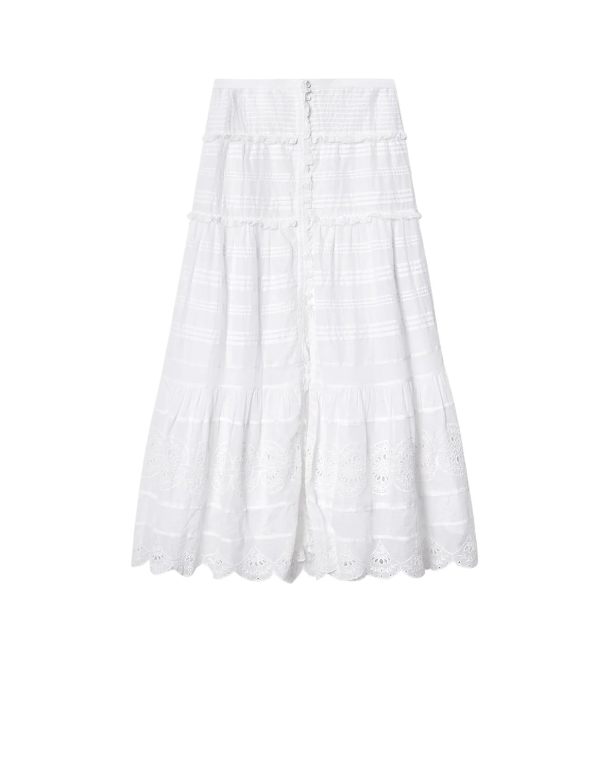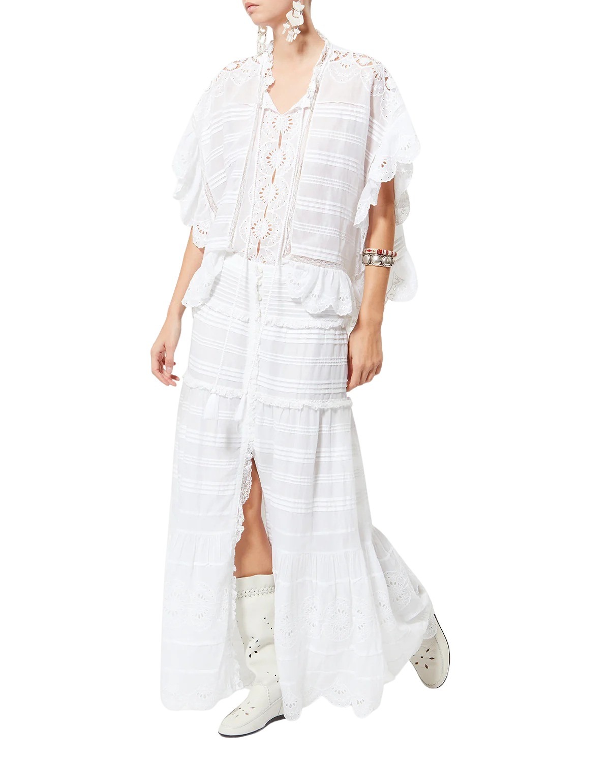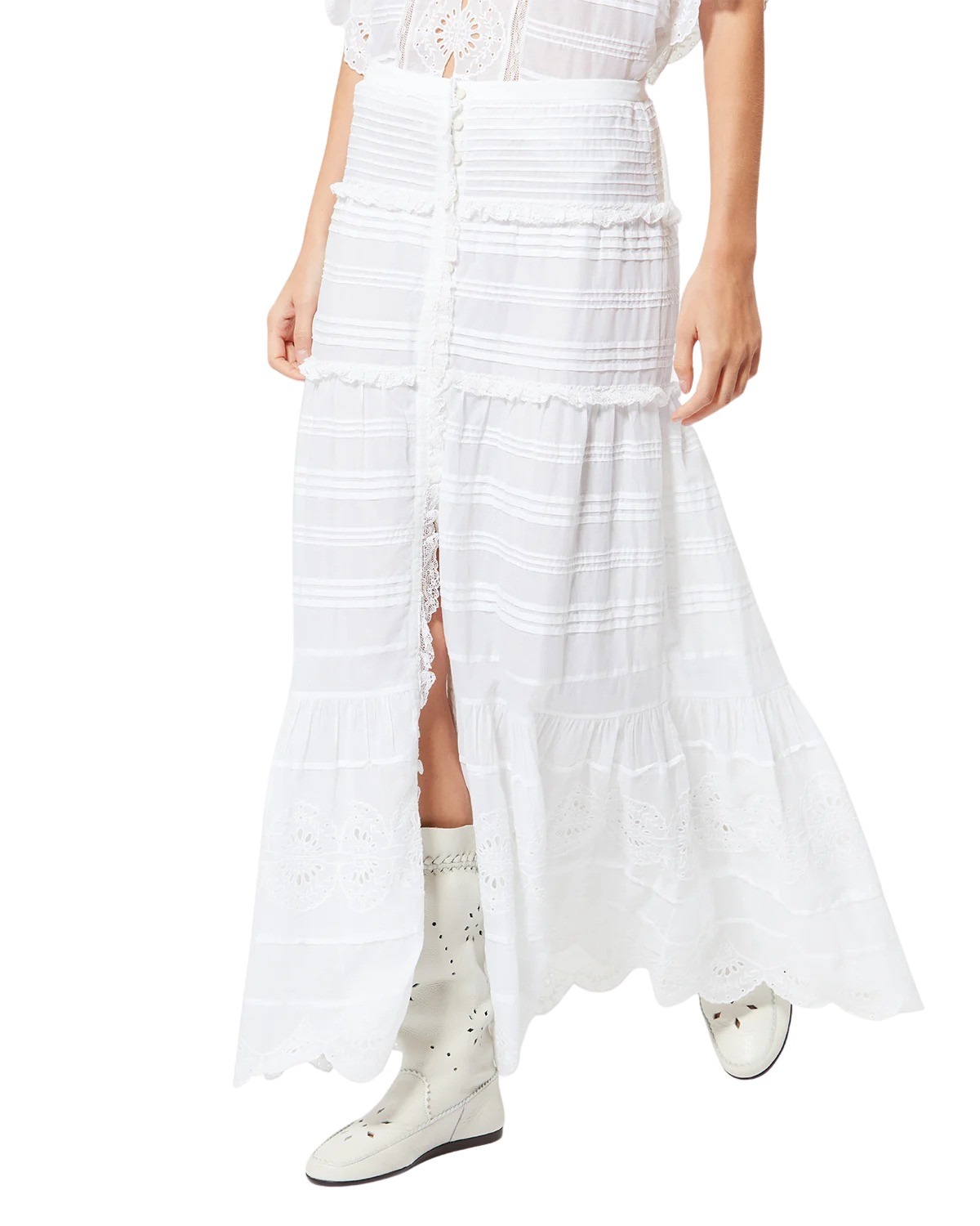 Paoline Frilly Cotton and Floral Lace Skirt fra Isabel Marant Étoile. Langt skjørt i lett bomull med delikate blondedetaljer og volanger. Det har høy midje, knappelukking i front og et luftig, feminint fall som gir et elegant uttrykk. Perfekt til både en enkel topp i hverdagen og en pyntet bluse til sommerlige anledninger.