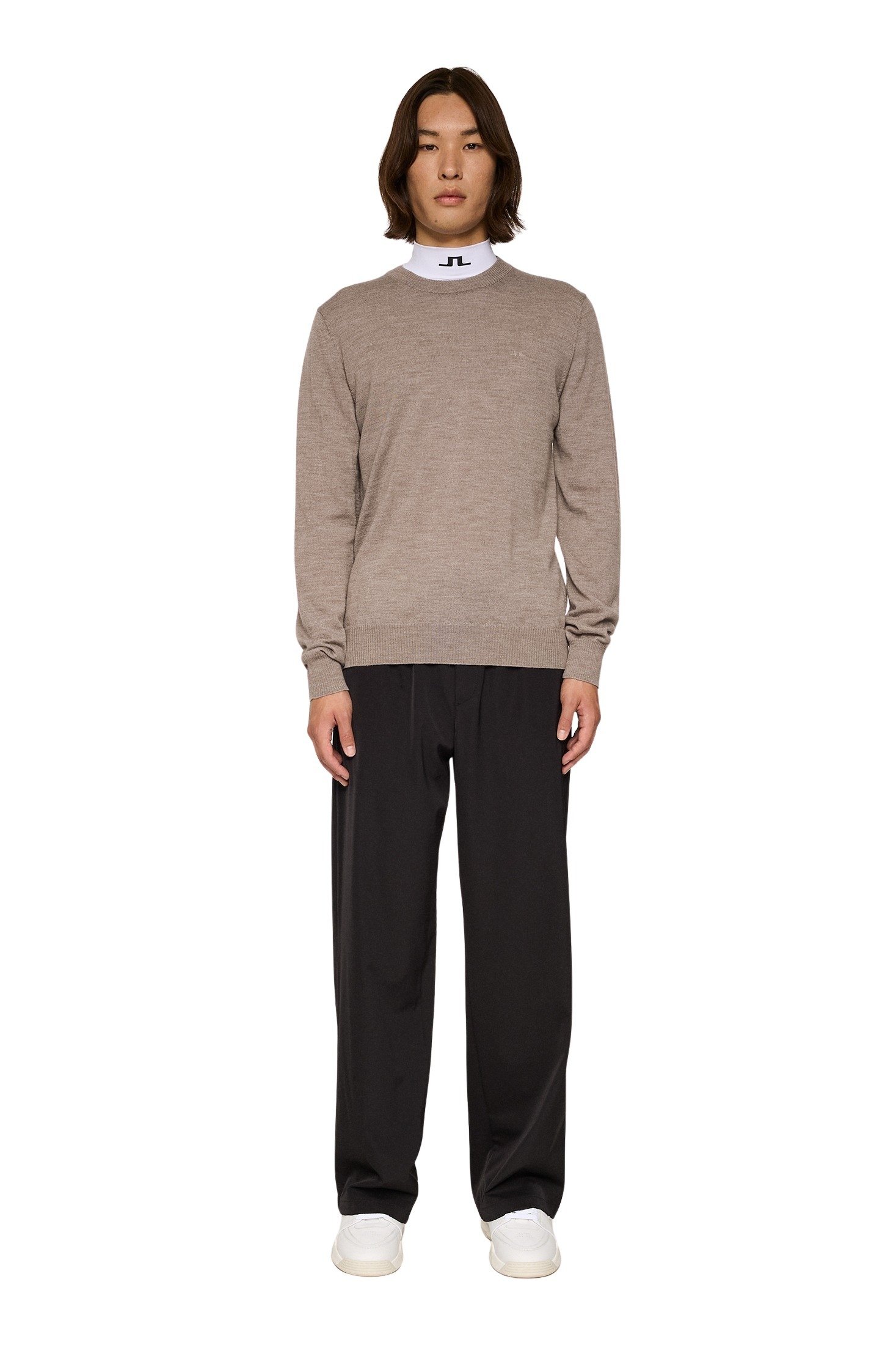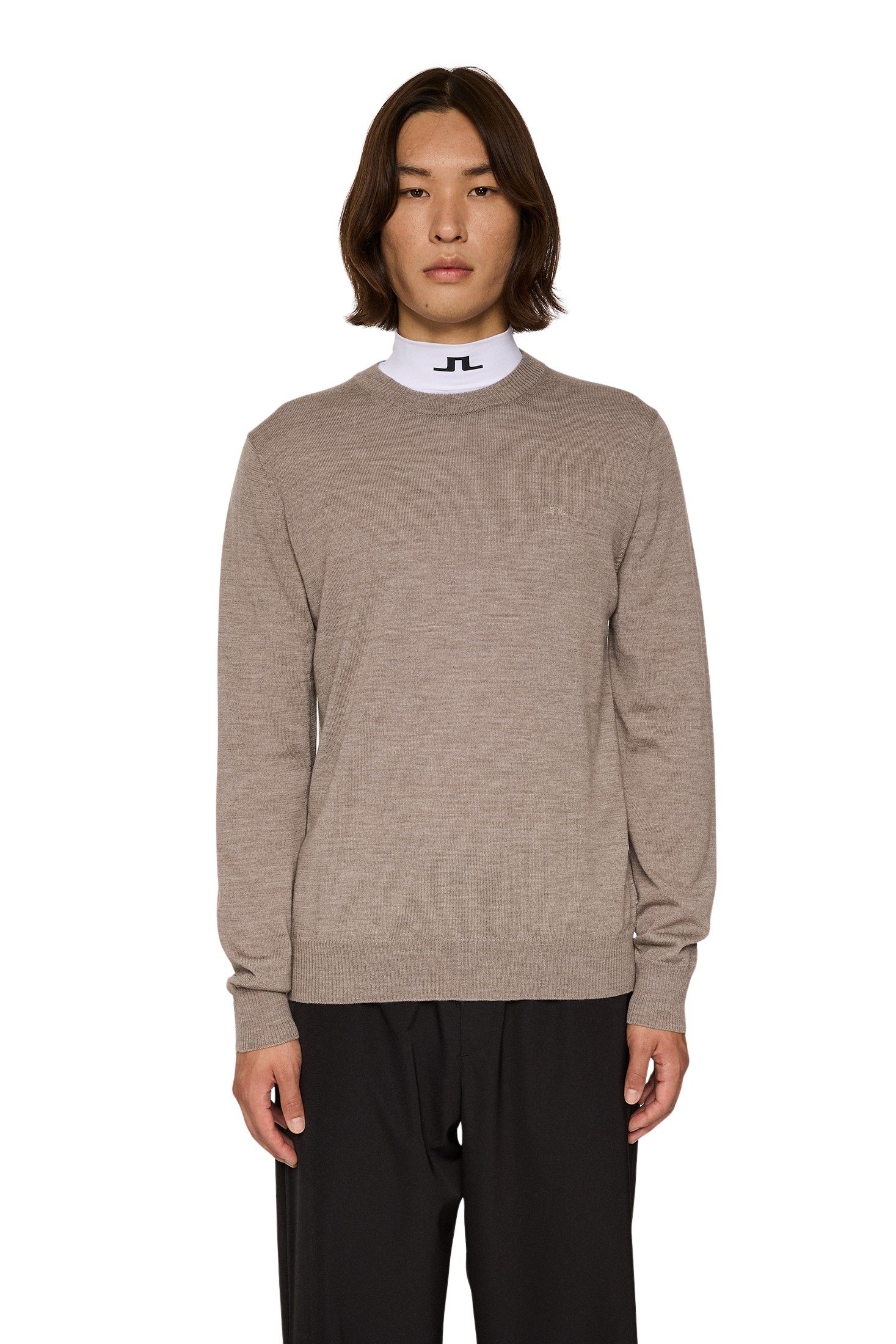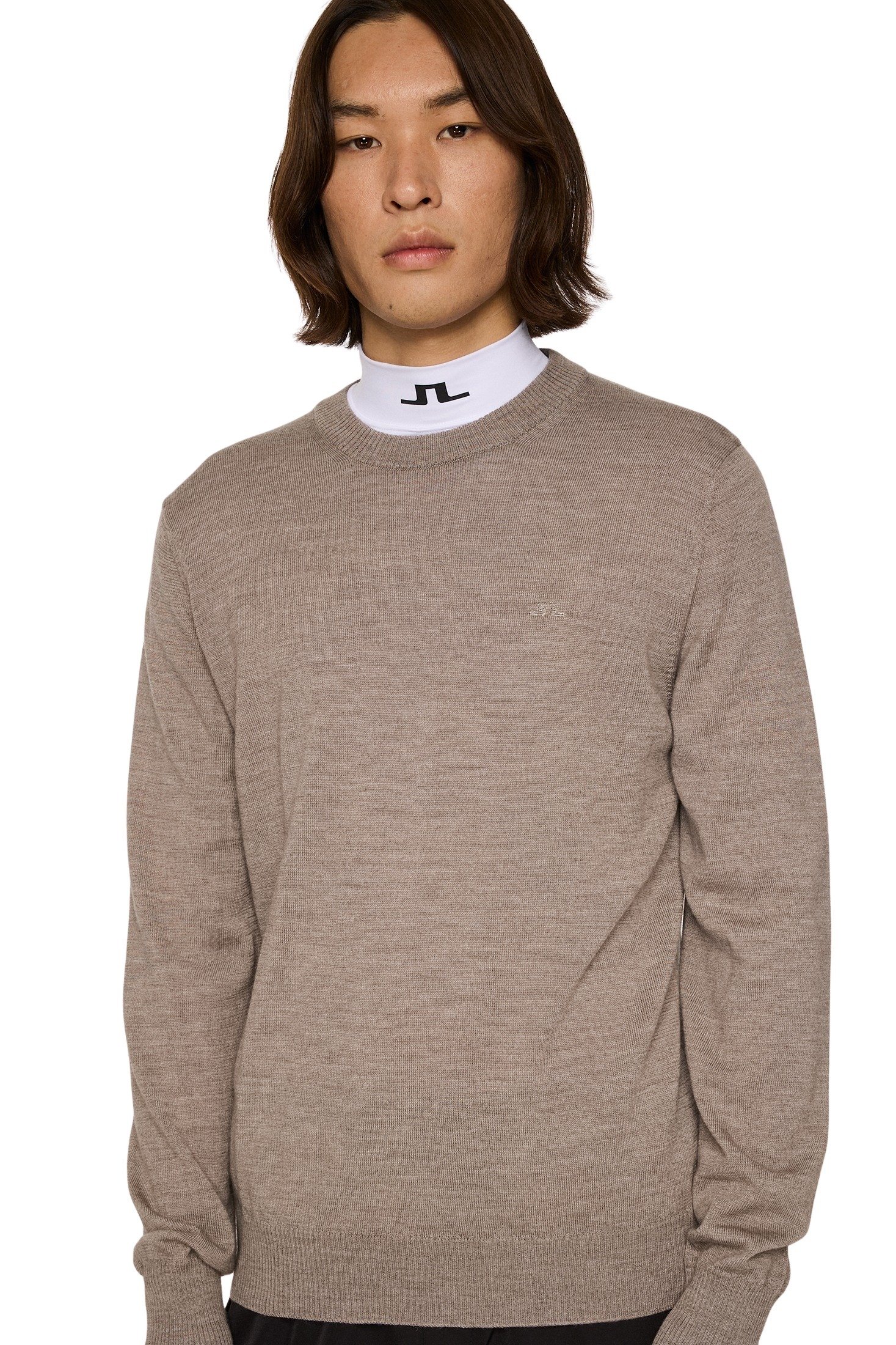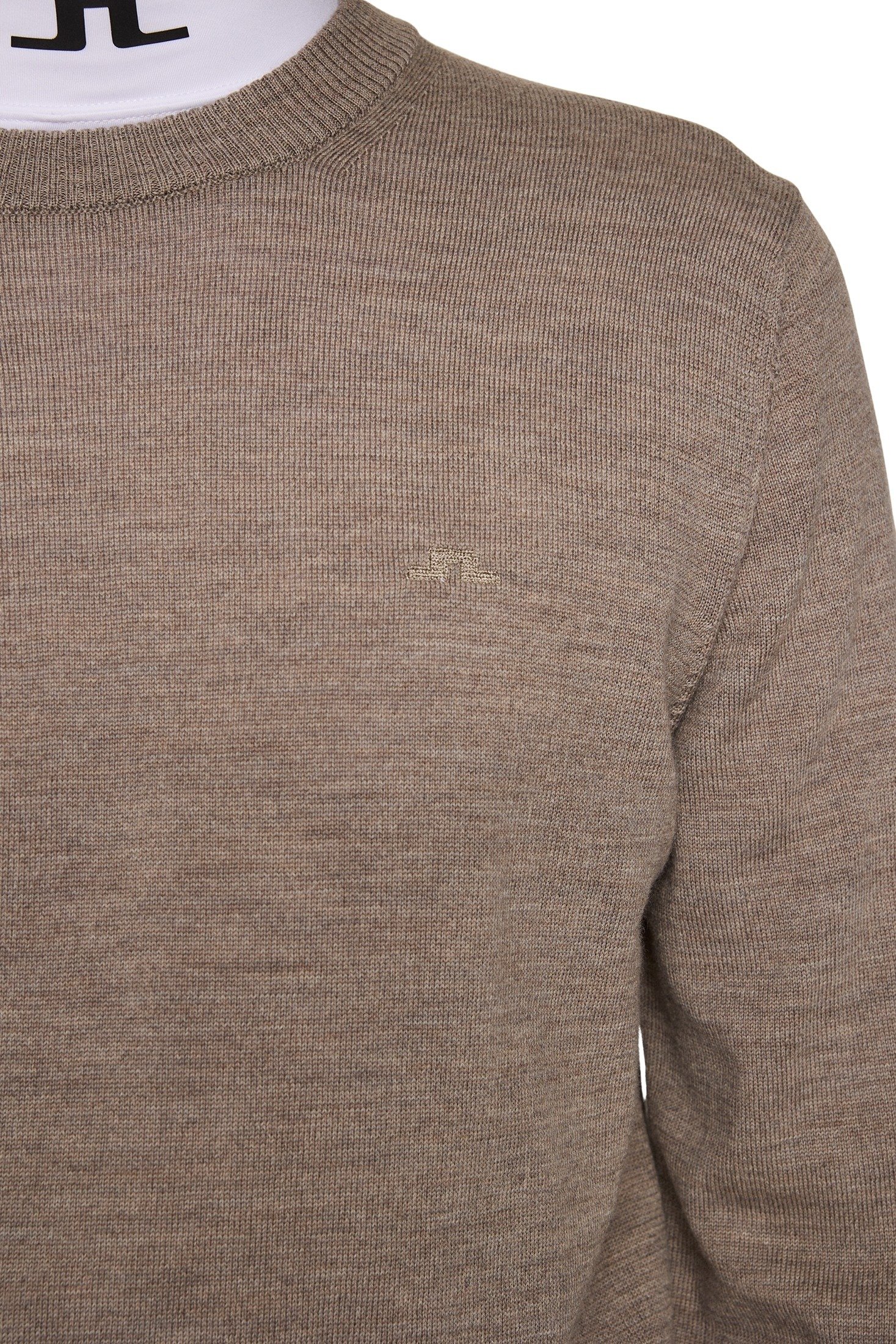 Genser til herre fra J.Lindeberg. Rund halset genser laget i myk merinoull med ribbestrikkede kanter. Et essensielt tilskudd til enhver garderobe.