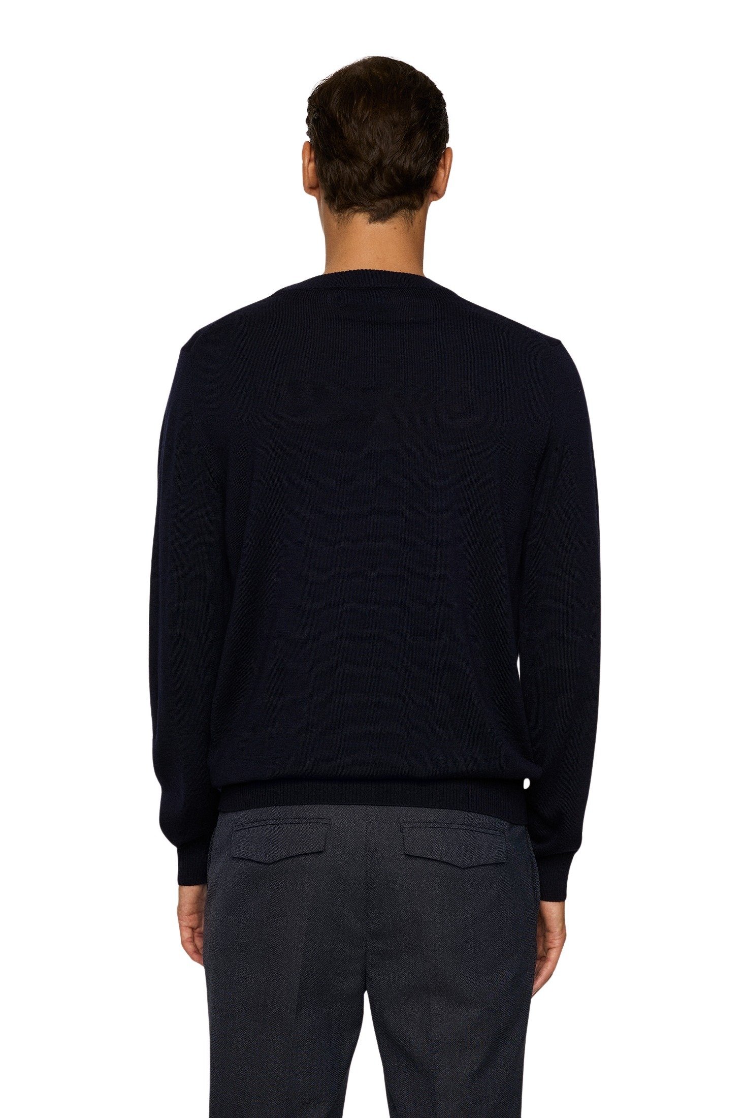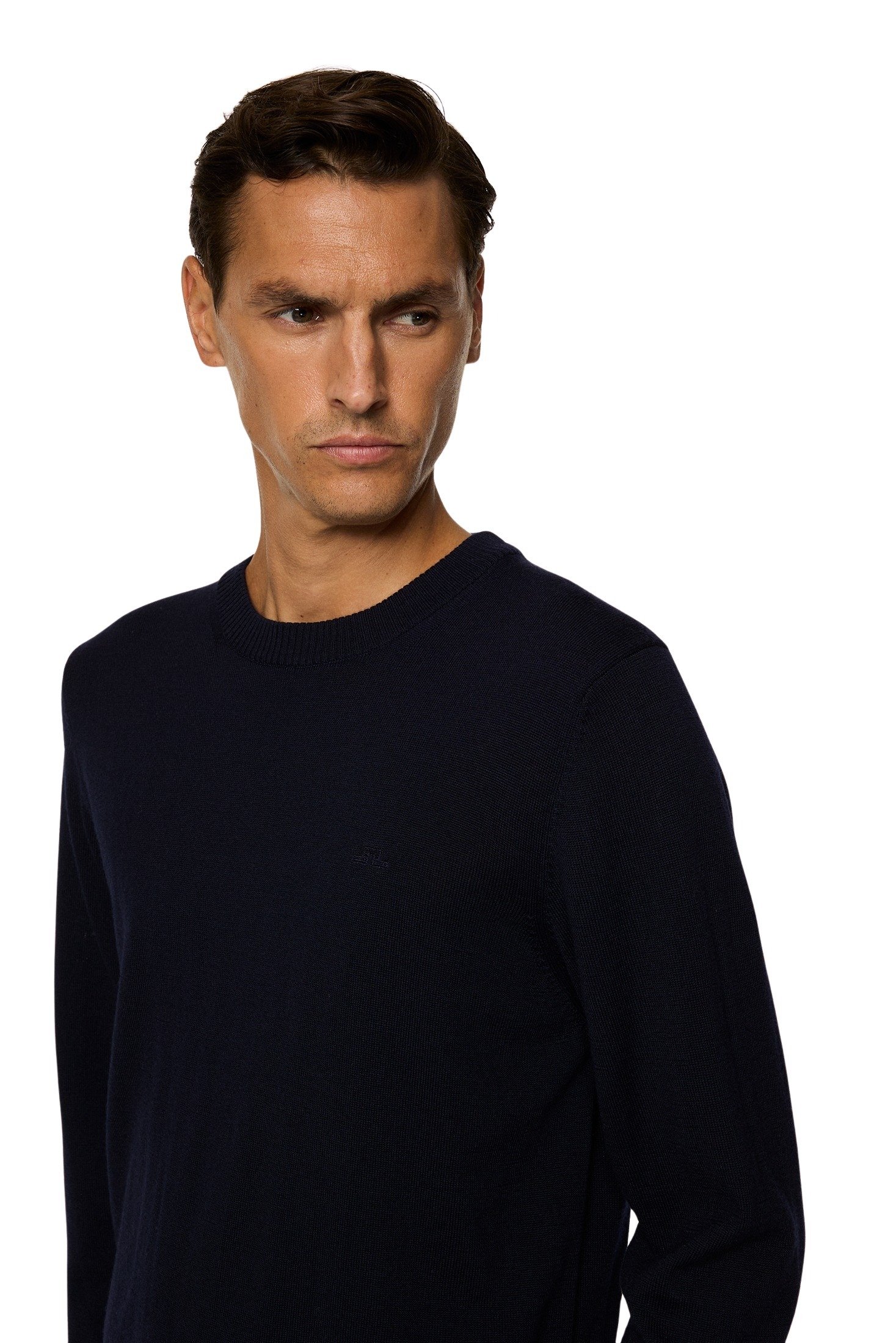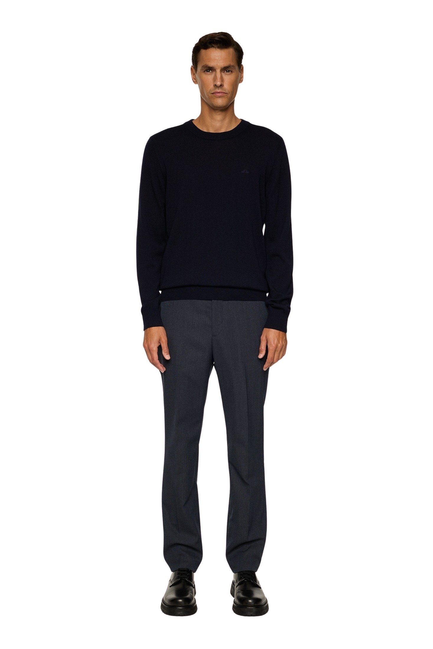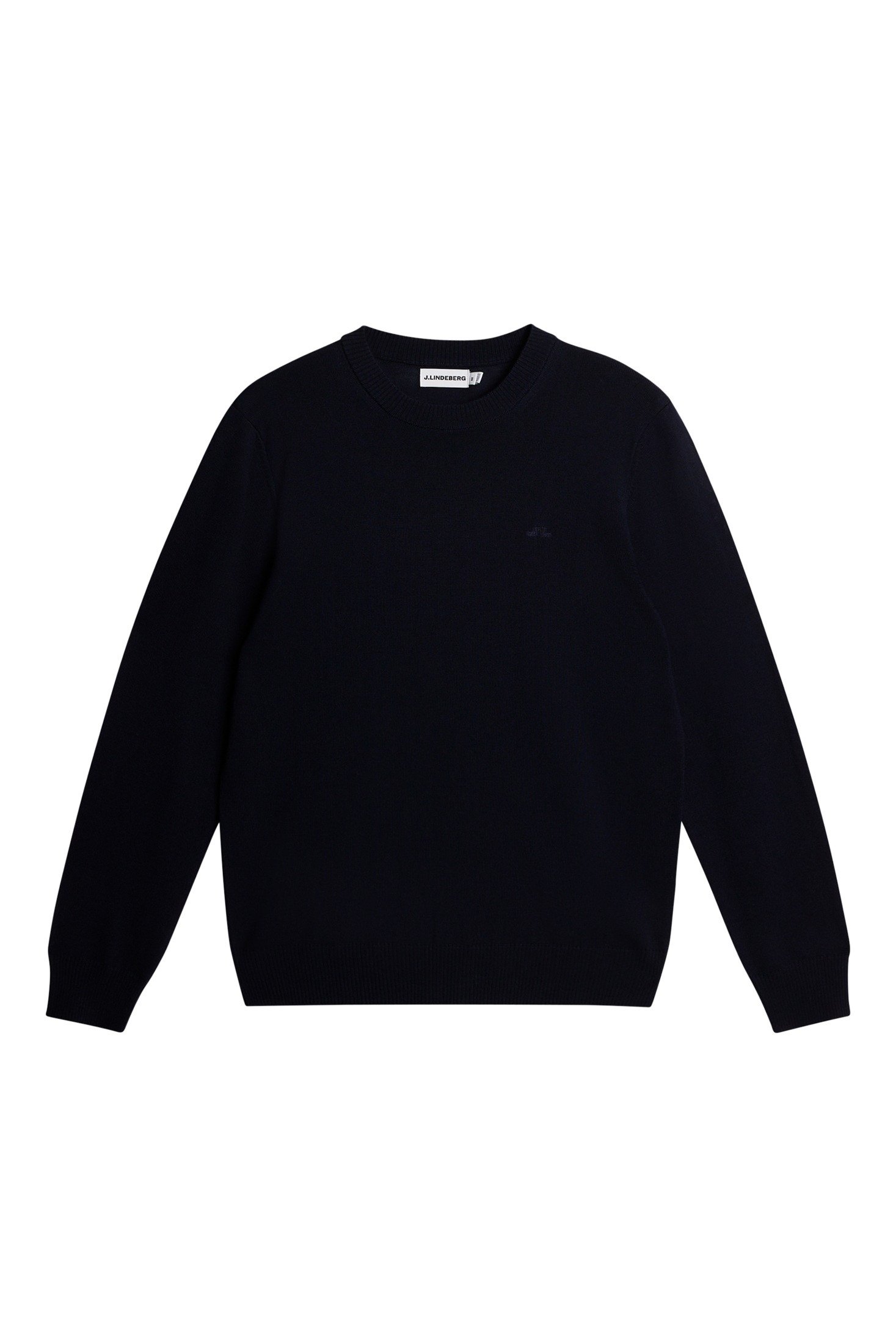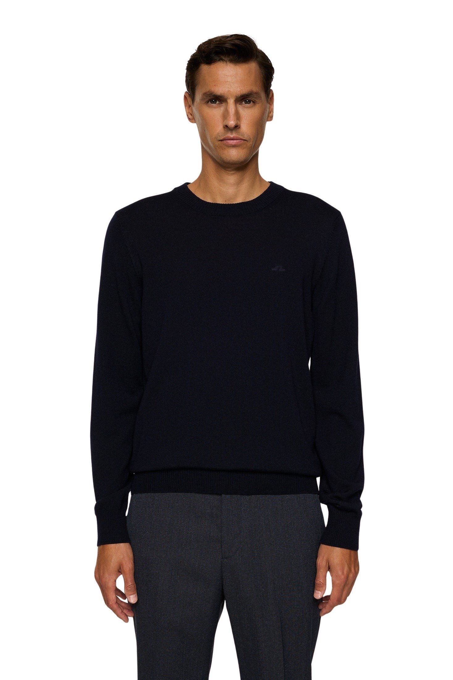 Genser til herre fra J.Lindeberg. Rund halset genser laget i myk merinoull med ribbestrikkede kanter. Et essensielt tilskudd til enhver garderobe.