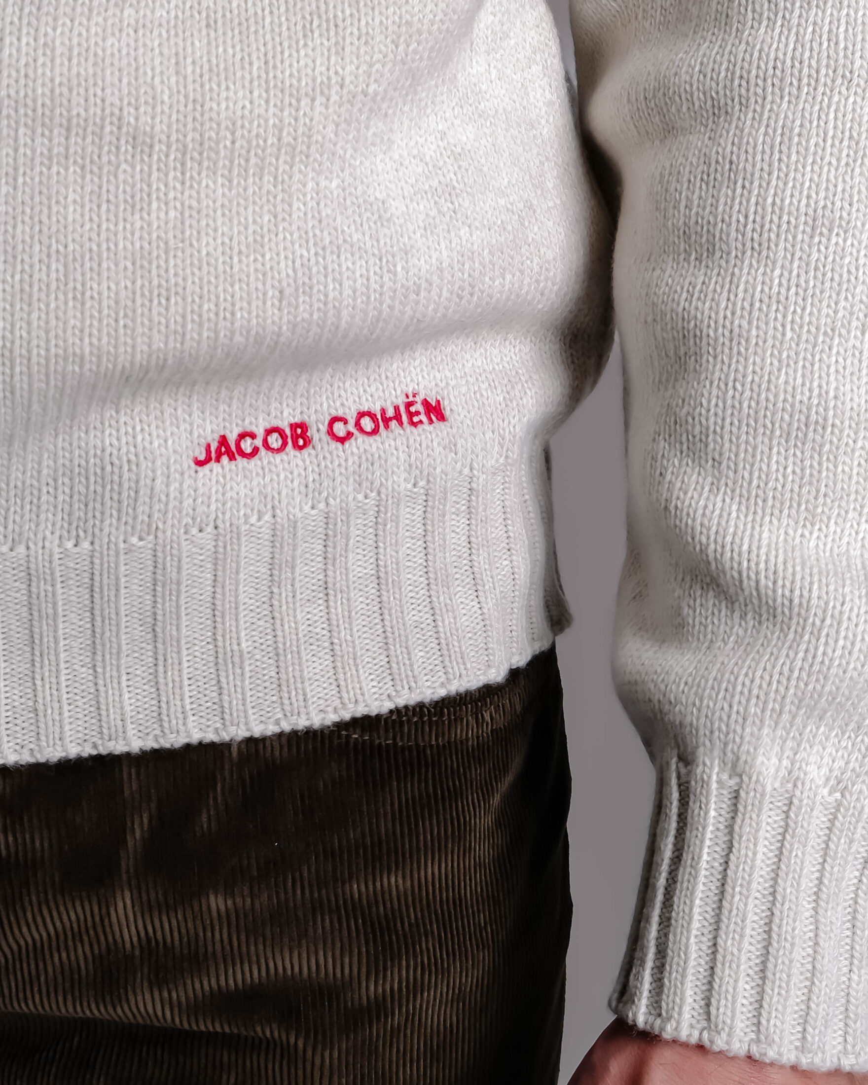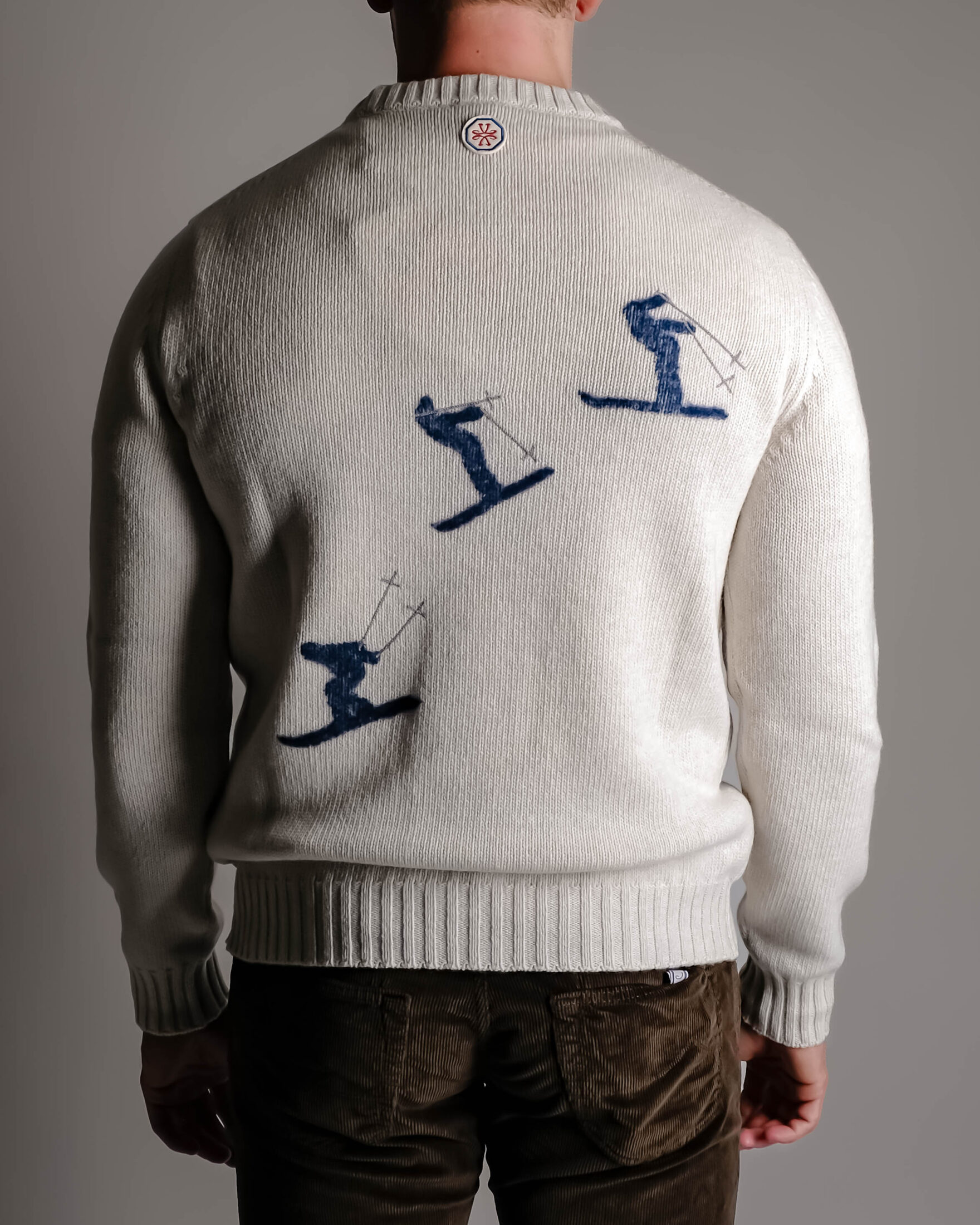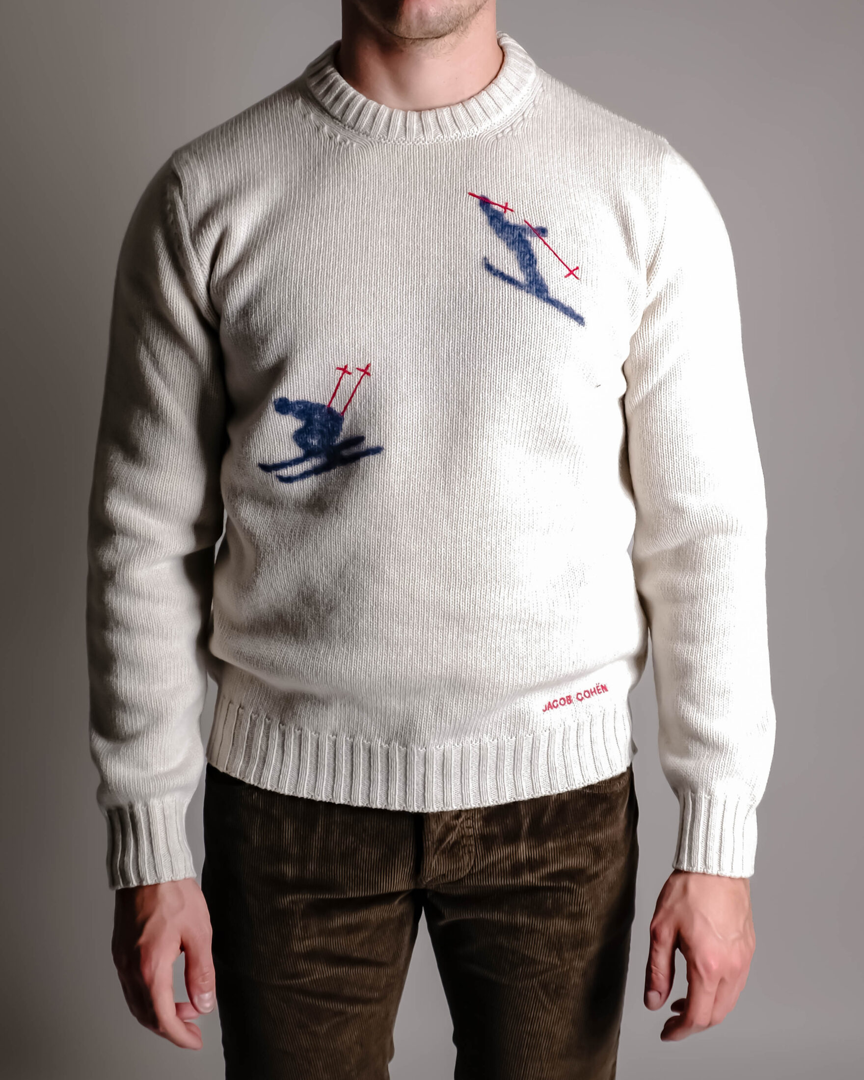 Flott strikket genser fra italienske Jacob Cohën. Genseren er strikket i myk råull og er prydet med skimotiv både foran og bak, samt en brodert Jacob Cohën-logo ved falden.
