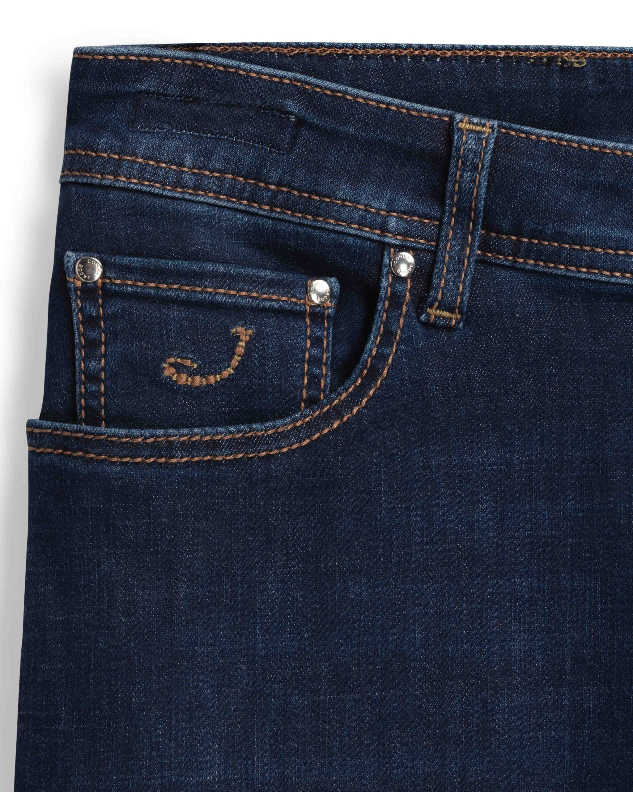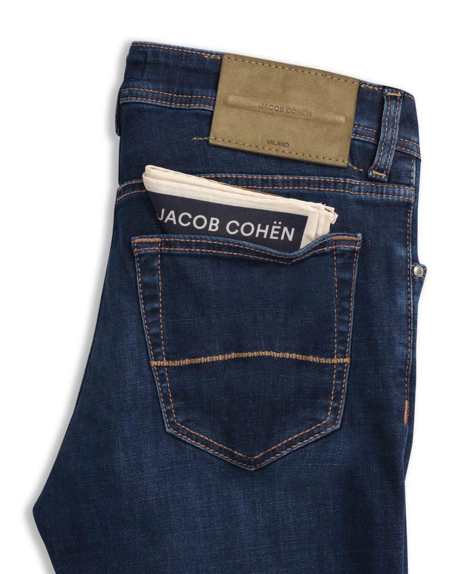 Detaljert med signaturknapper, kontrastsømmer og skinnpatch med logo – et tydelig kjennetegn på ekte Jacob Cohën-kvalitet.