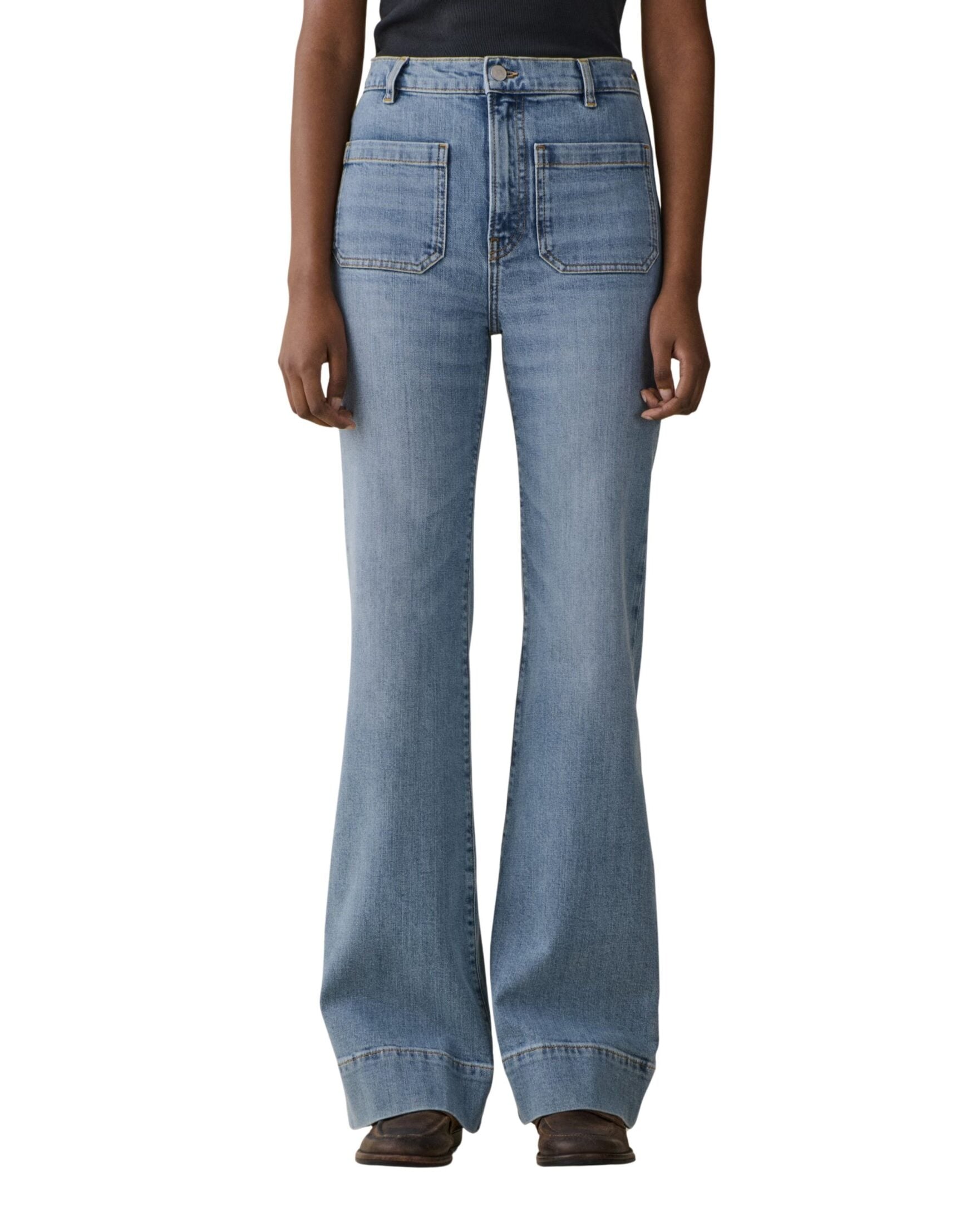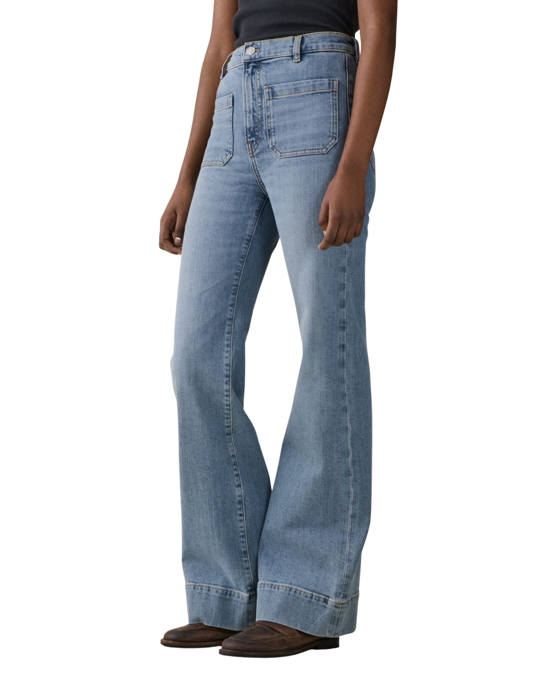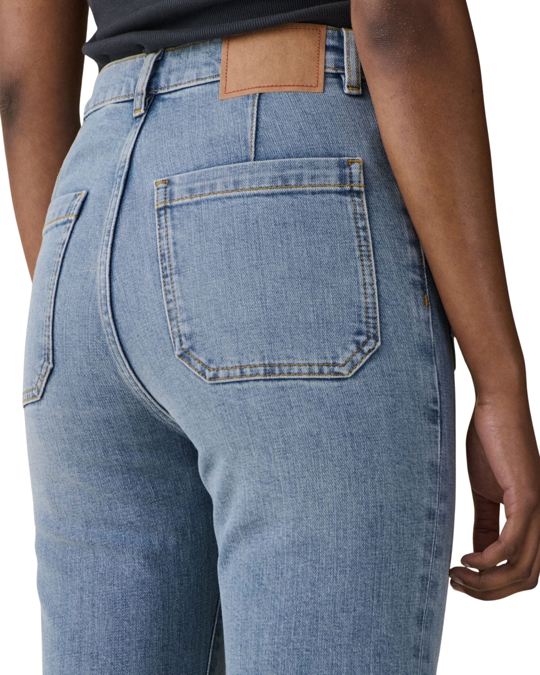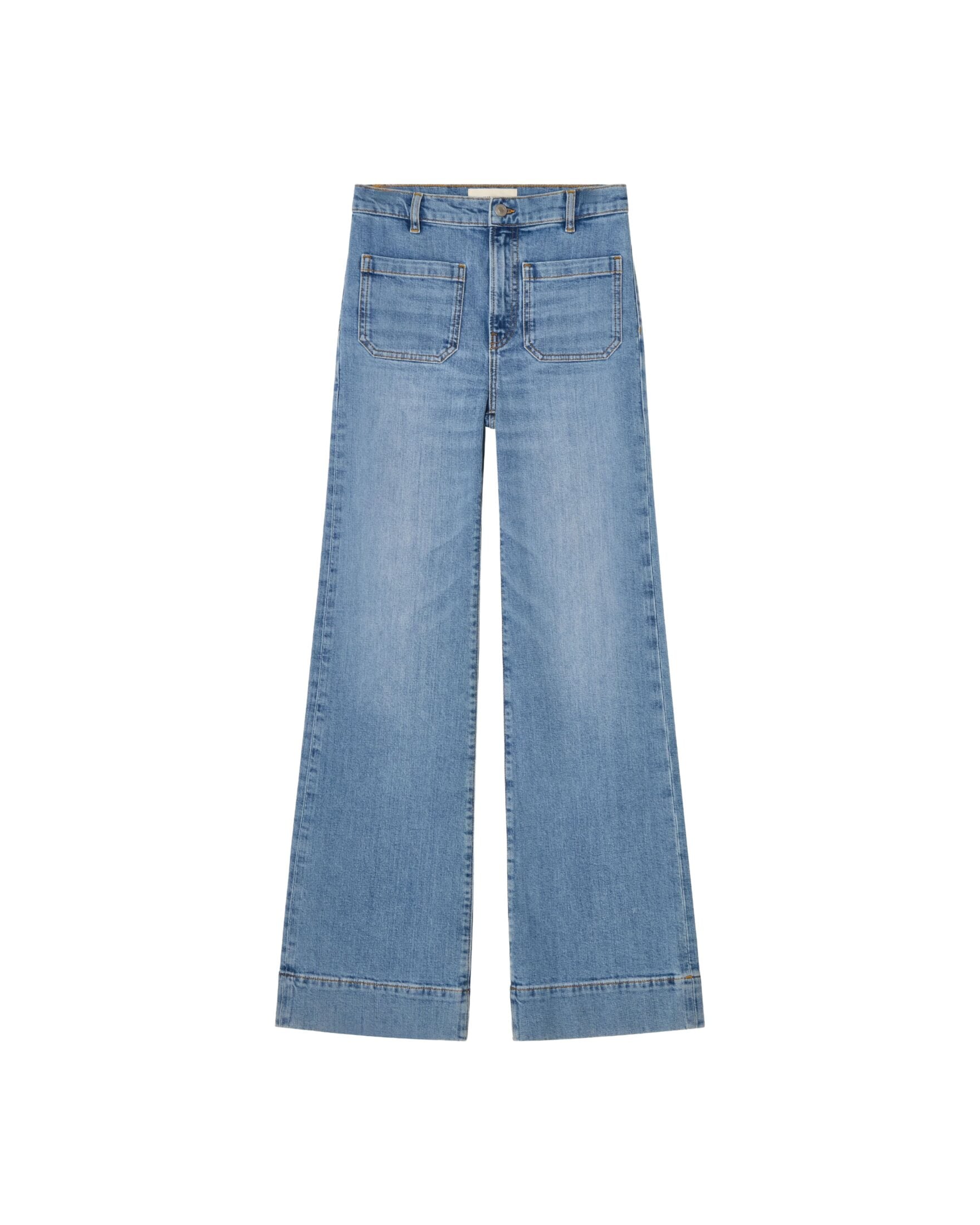 St. Monica fra Jeanerica. Jeans med høy midje og tydelige, påsydde lommer som gir et karakteristisk uttrykk. Fasongen er smalere øverst og går over i vide ben med markert sleng nederst. En statement-denim med retrofølelse og moderne komfort.