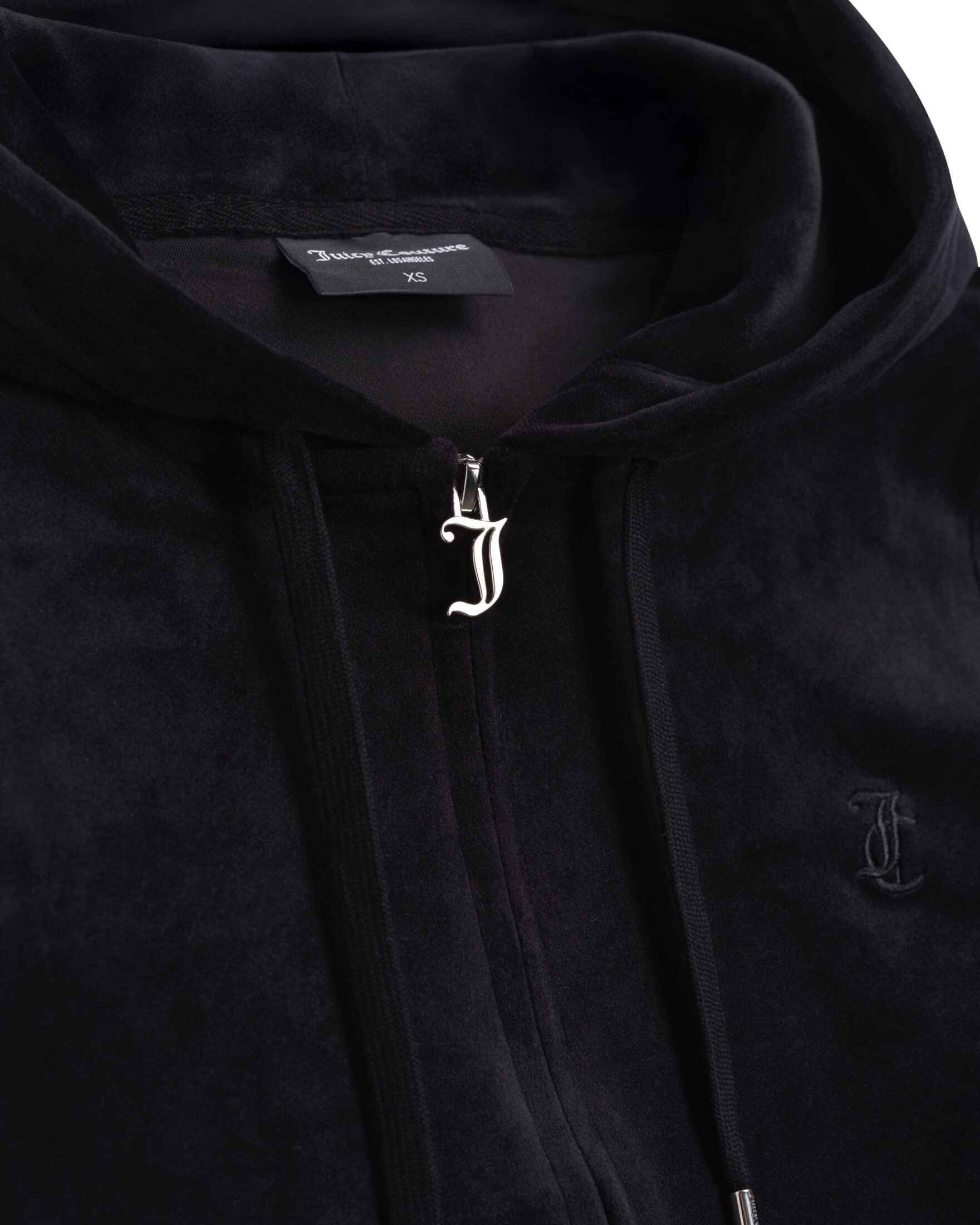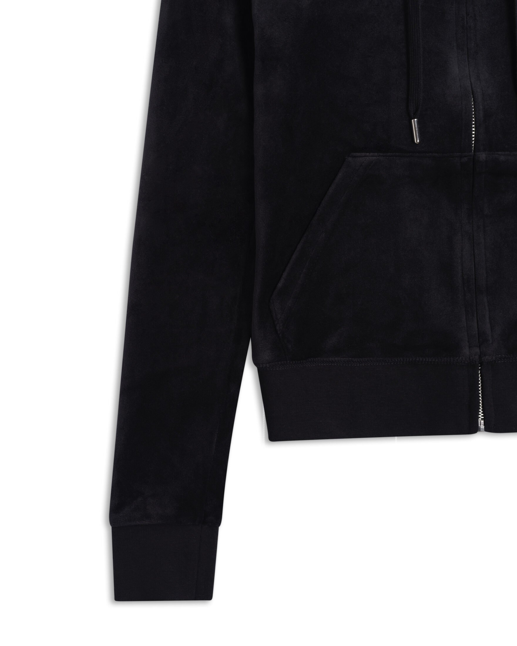 Hettejakke til dame fra Juicy Couture. En tidløs hettejakke i myk velour som kombinerer komfort og luksus. Den har klassisk Juicy-passform, glidelås i front og praktisk kengurulomme. Diskret logo på brystet gir et elegant preg. Perfekt til både hverdagsbruk og avslappede anledninger.