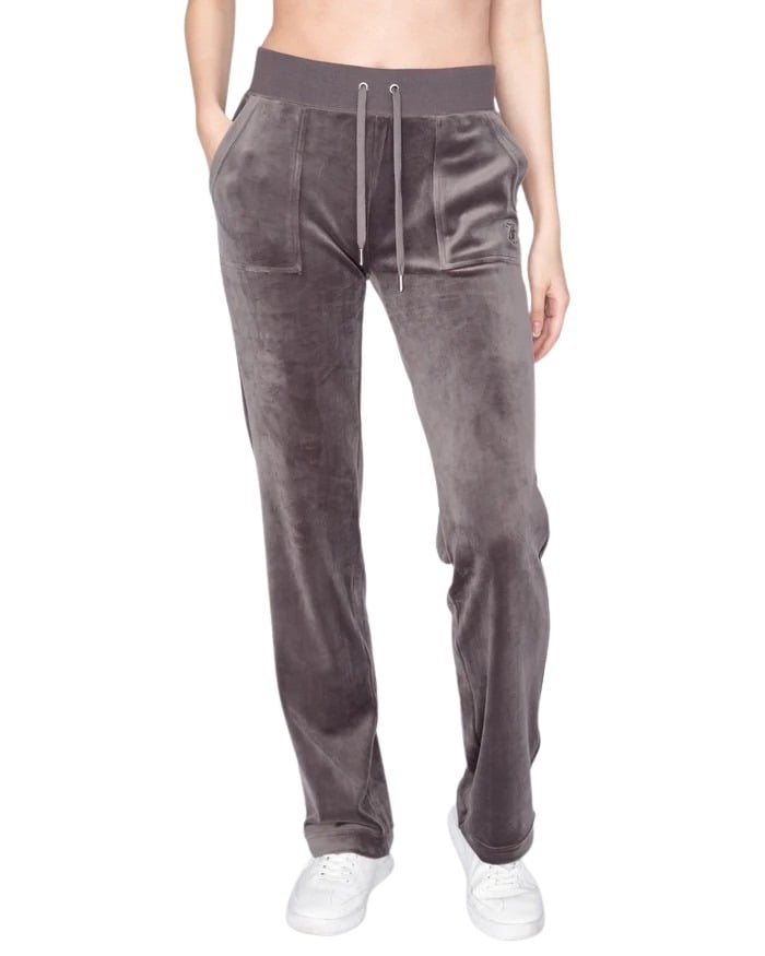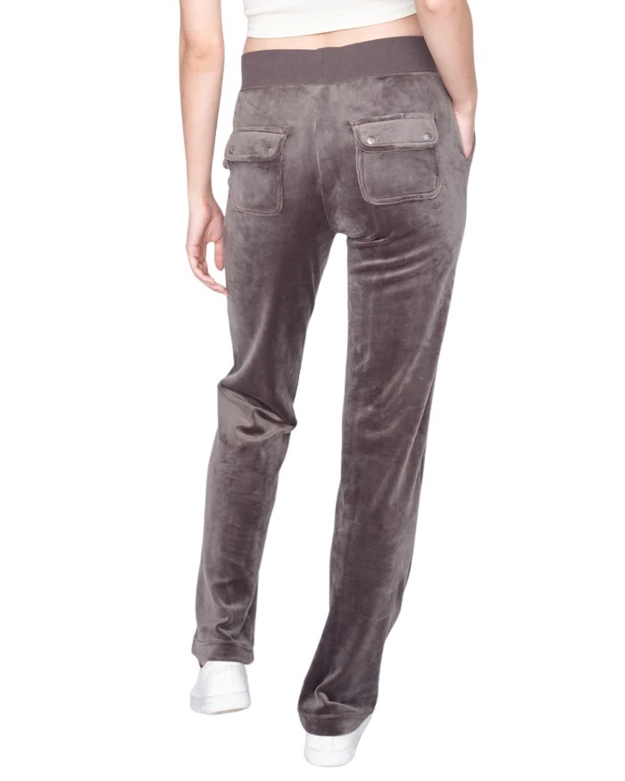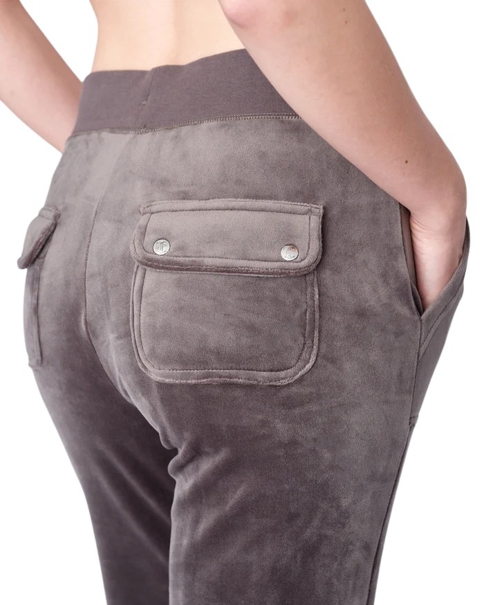Komfortabel bukse i myk velour fra Juicy Couture. Buksen er høy på livet med knyting. Sidelommer og to lommer med klaff og trykknapp bak.