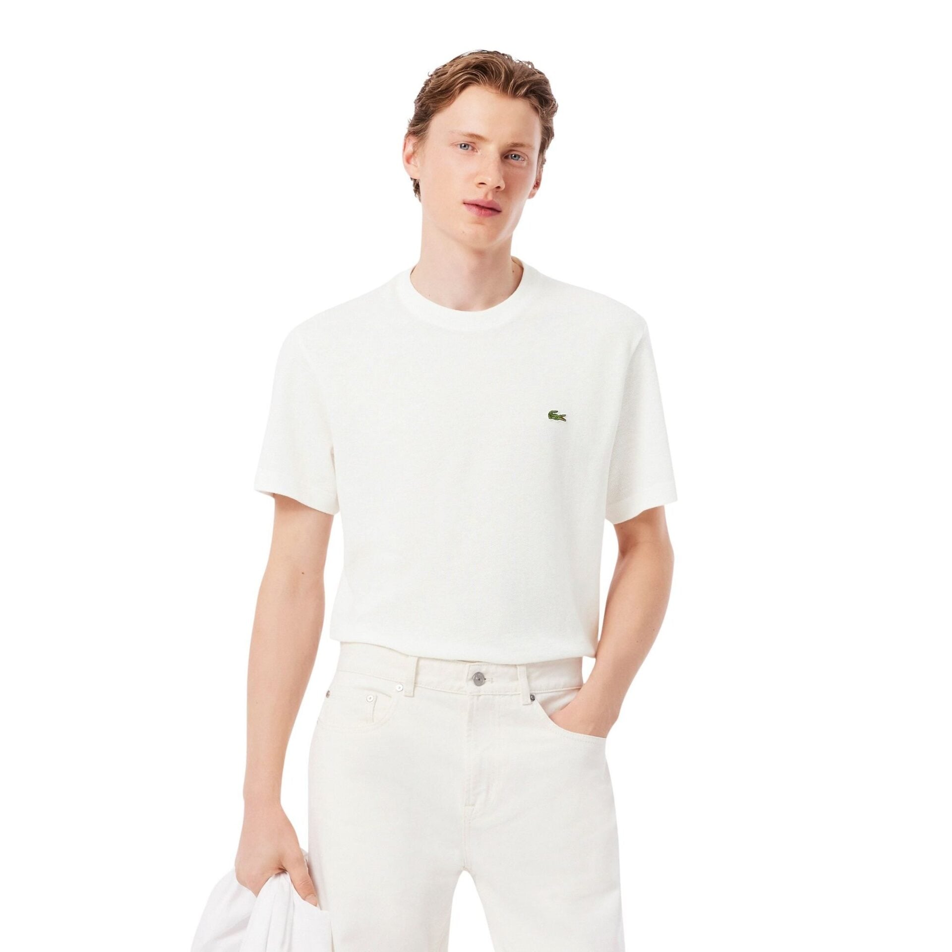 T-skjorte til herre fra Lacoste. Stilren t-skjorte laget i ikonisk piqué med en behagelig blanding av lin og bomull. Stoffet faller pent og gir et lett, elegant uttrykk som passer perfekt til sommeren. Fullført med brodert krokodillelogo på brystet.