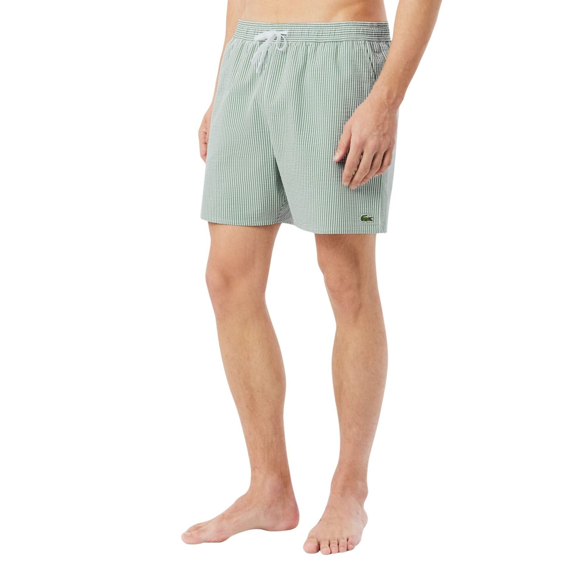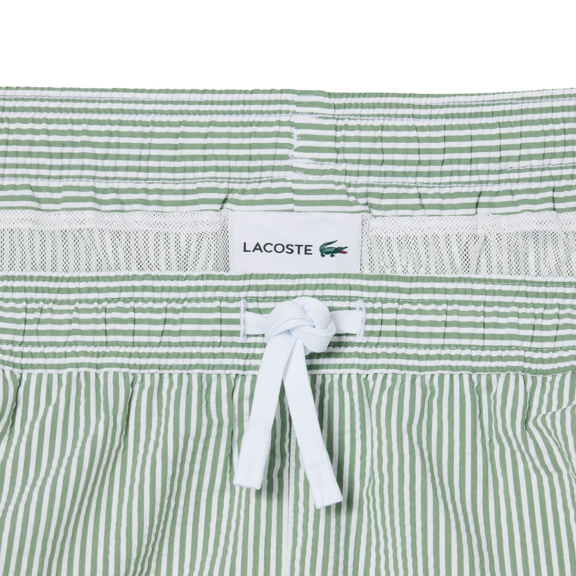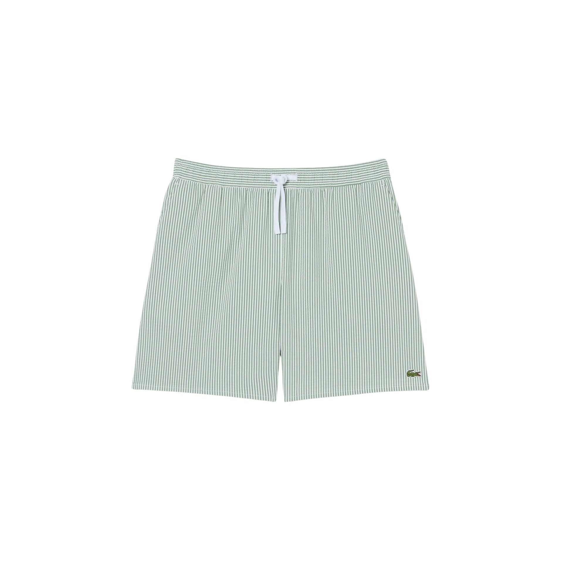 Badeshorts til herre fra Lacoste i lett og behagelig seersucker-kvalitet med smale striper. Modellen har en komfortabel passform med innertruse i mesh og hurtigtørkende materiale. Elastisk liv med snøring gir god passform. Avsluttet med brodert krokodillelogo. Leveres med praktisk oppbevaringspose.