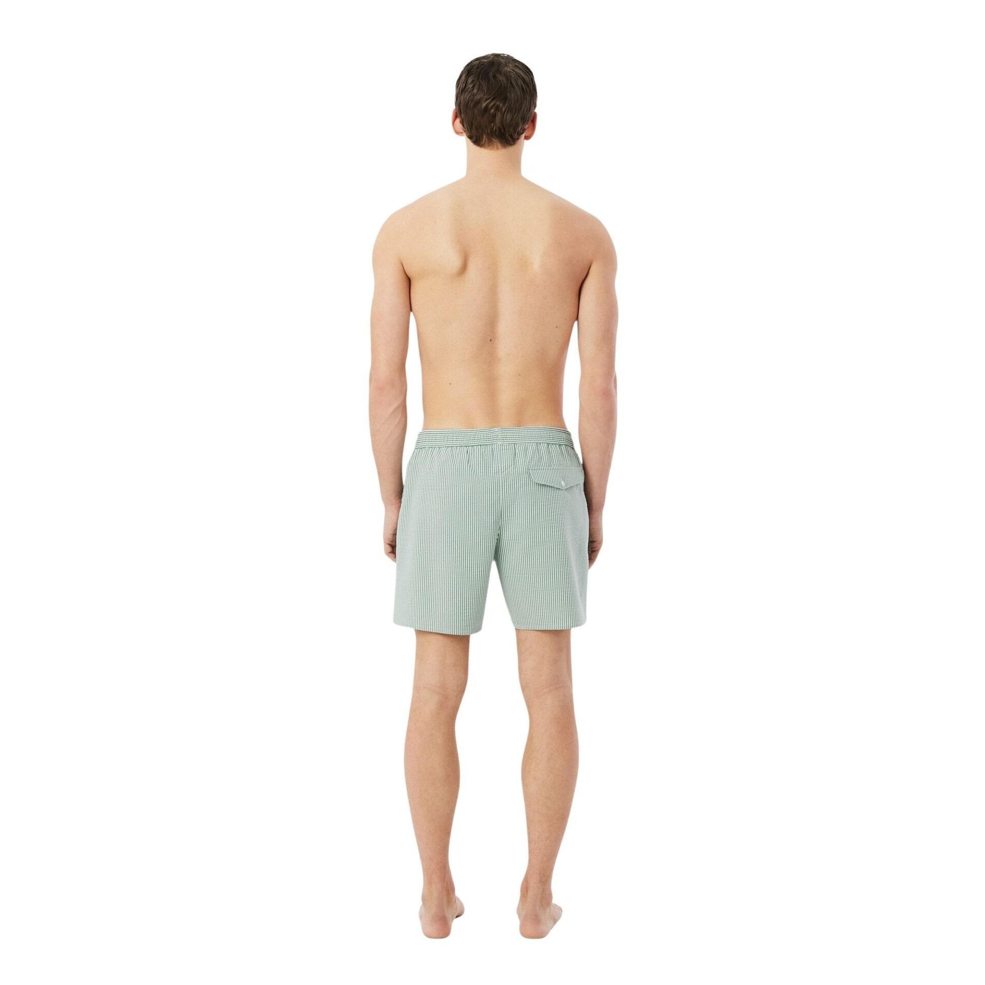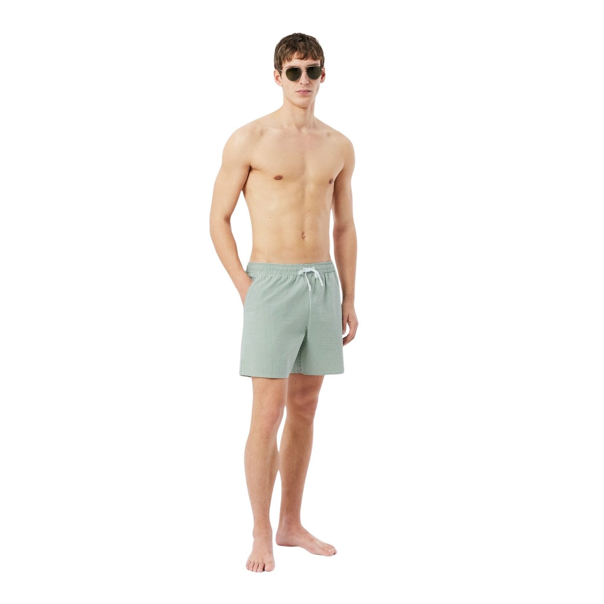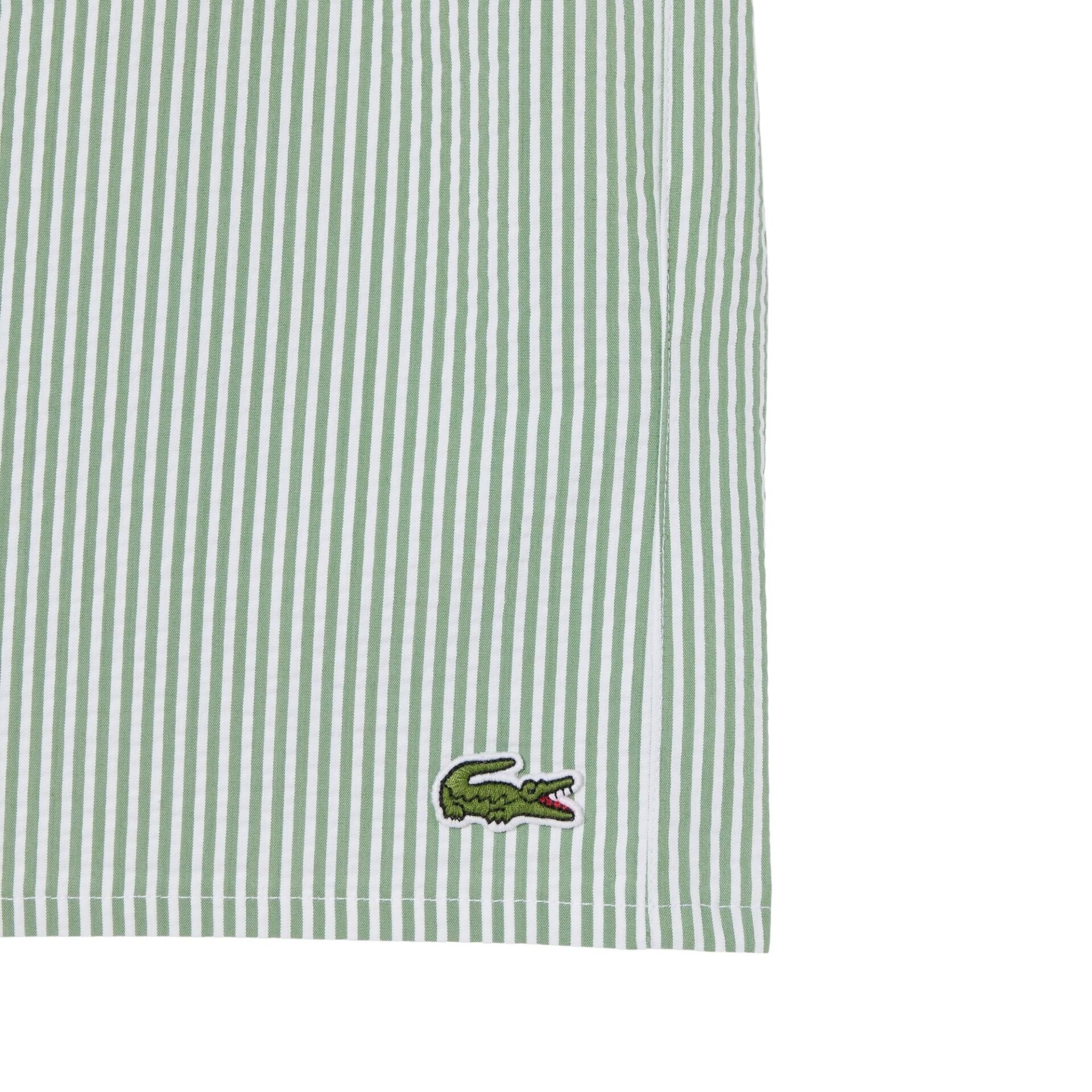 Badeshorts til herre fra Lacoste i lett og behagelig seersucker-kvalitet med smale striper. Modellen har en komfortabel passform med innertruse i mesh og hurtigtørkende materiale. Elastisk liv med snøring gir god passform. Avsluttet med brodert krokodillelogo. Leveres med praktisk oppbevaringspose.