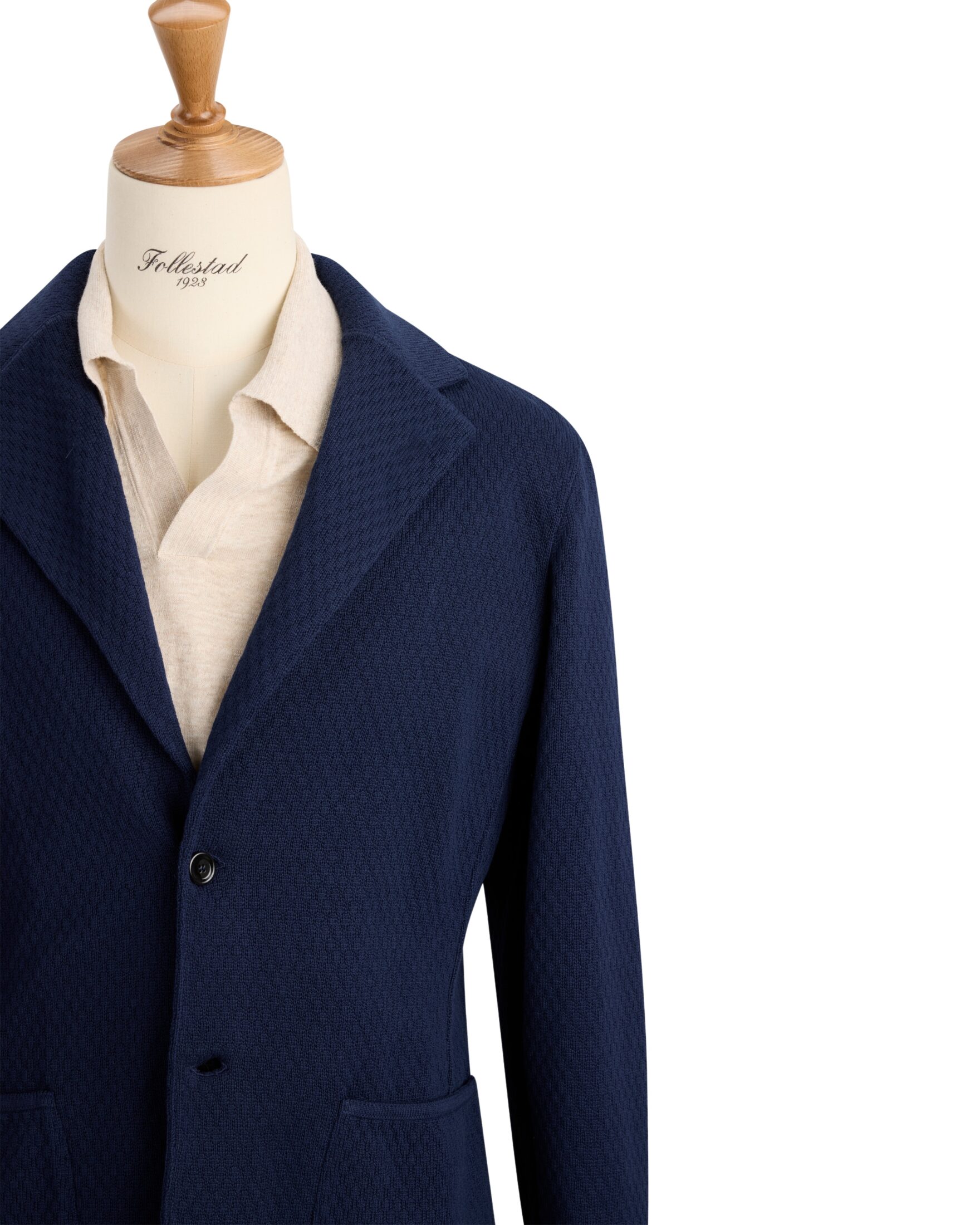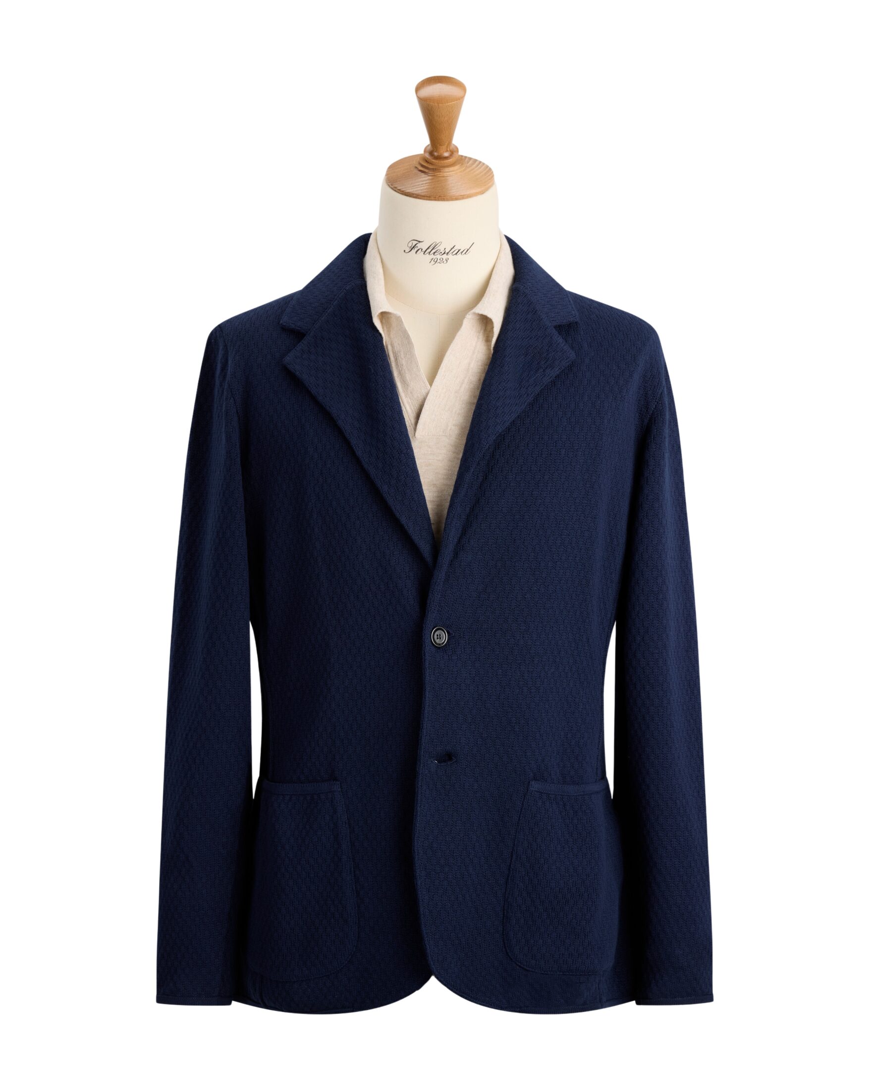 En sofistikert blazer til herre fra Lardini i lett strikket bomullskvalitet. Den myke og fleksible konstruksjonen gir høy komfort, mens det enkeltspente designet gir et klassisk og stilrent uttrykk. Perfekt til både jobb og fritid.