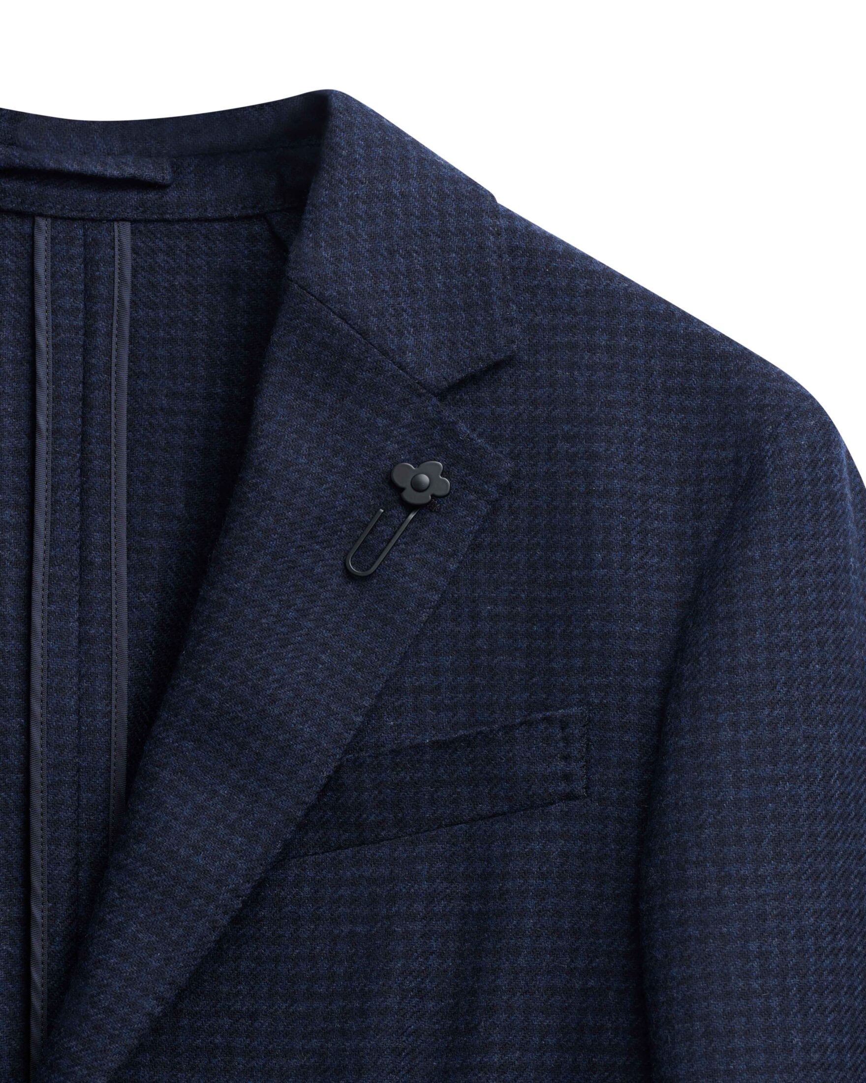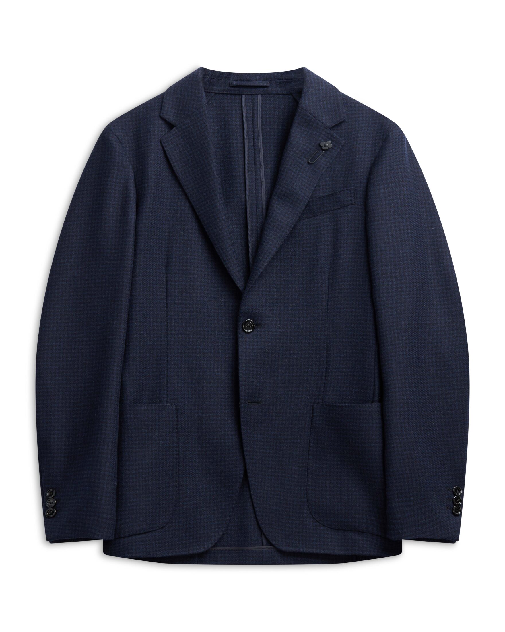 Eksklusiv blazer til herre fra italienske Lardini, laget i en luksuriøs blanding av ull og kasjmir. Den mørkeblå tonen kombinert med et subtilt hundetannmønster tilfører dybde og karakter. Snittet og konstruksjonen sørger for en raffinert silhuett. Med detaljer som påsydde lommer, notch lapels og Lardinis signaturblomst på slaget, er dette en blazer som utstråler italiensk håndverk på sitt beste. Perfekt til både jobb og elegante fritidsanledninger.