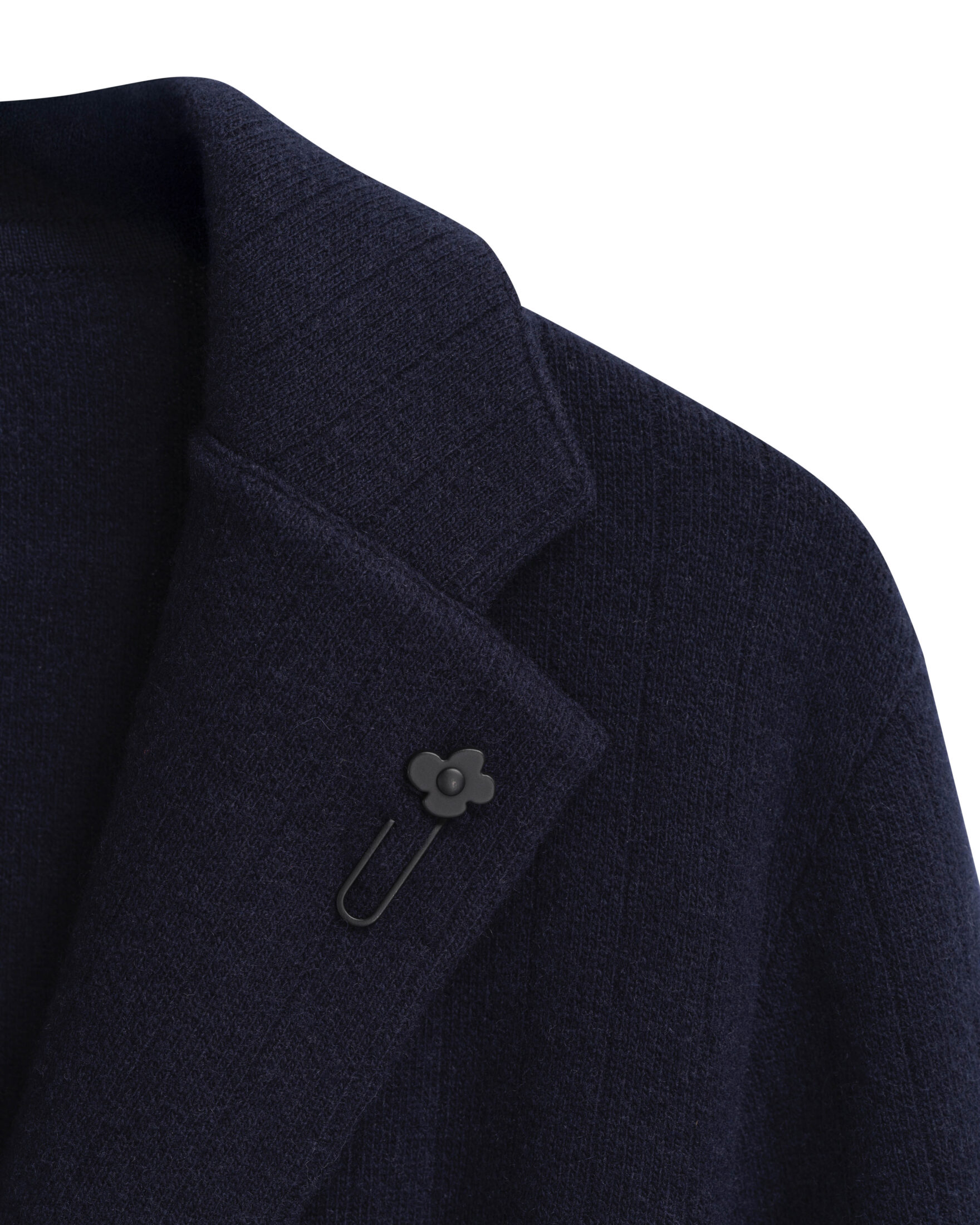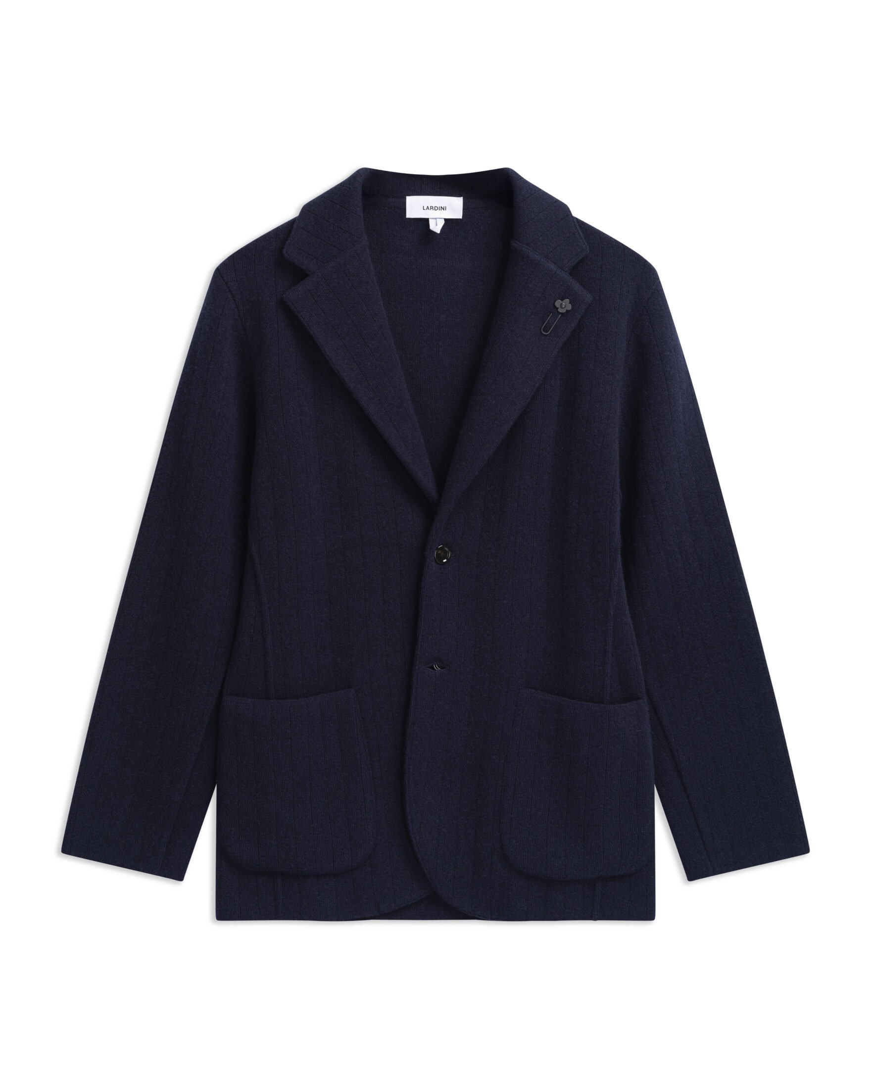 En elegant og moderne blazer fra italienske Lardini. Laget i en luksuriøs blanding av ny ull og kasjmir. Den myke og fleksible strikken gir en komfortabel passform uten å gå på kompromiss med den skreddersydde estetikken. Den dype marineblå fargen kombinert med subtile vertikale striper gir et tidløst og sofistikert uttrykk. Perfekt til både formelle og avslappede anledninger.
