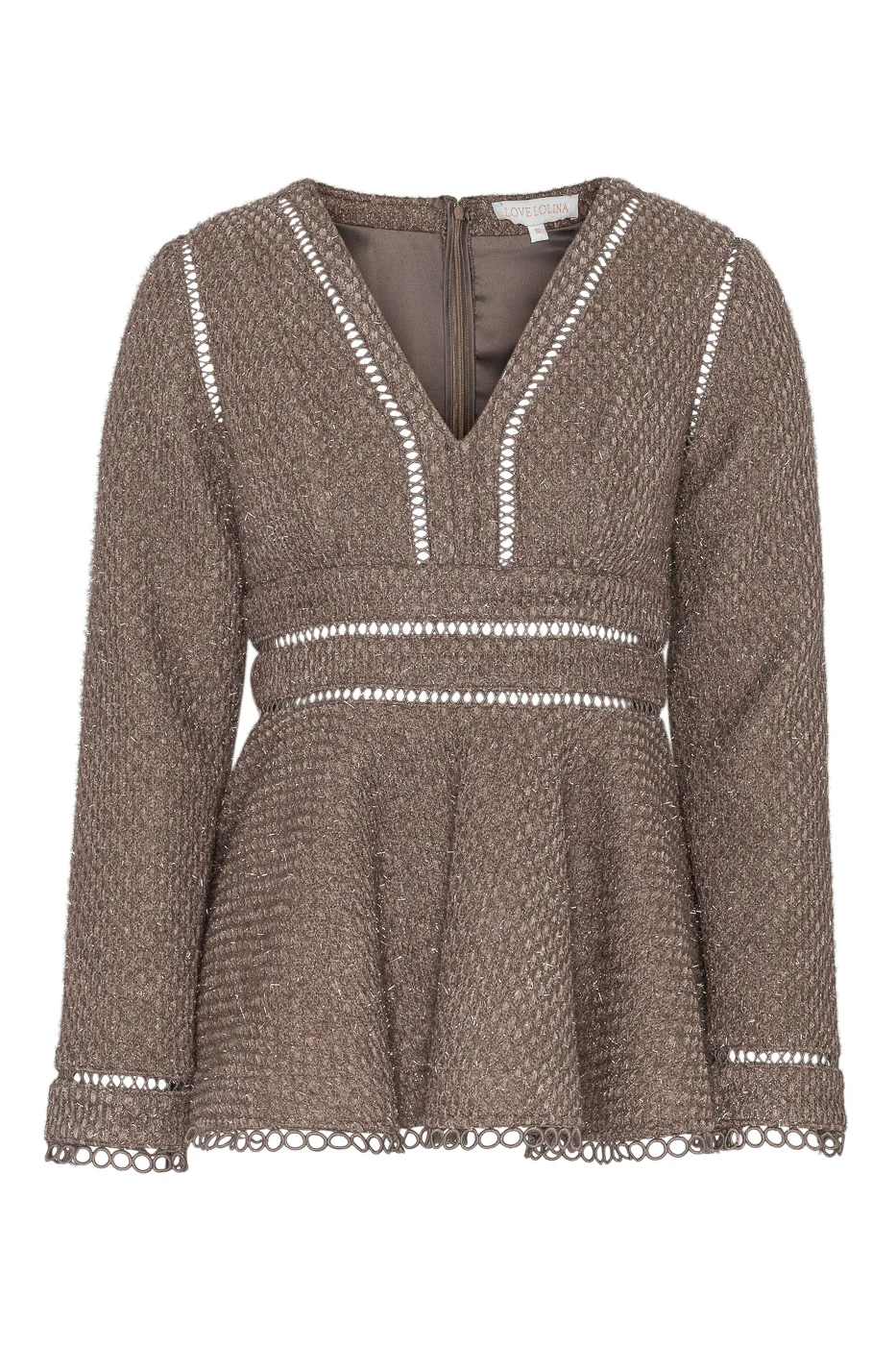 Topp til dame fra Love Lolina. Laget av et teksturert stoff med subtile metalliske tråder for et hint av glans. Den har en flatterende V-hals og lange ermer. Detaljene langs midjen, ermene og nederkantene gir en feminin finish.