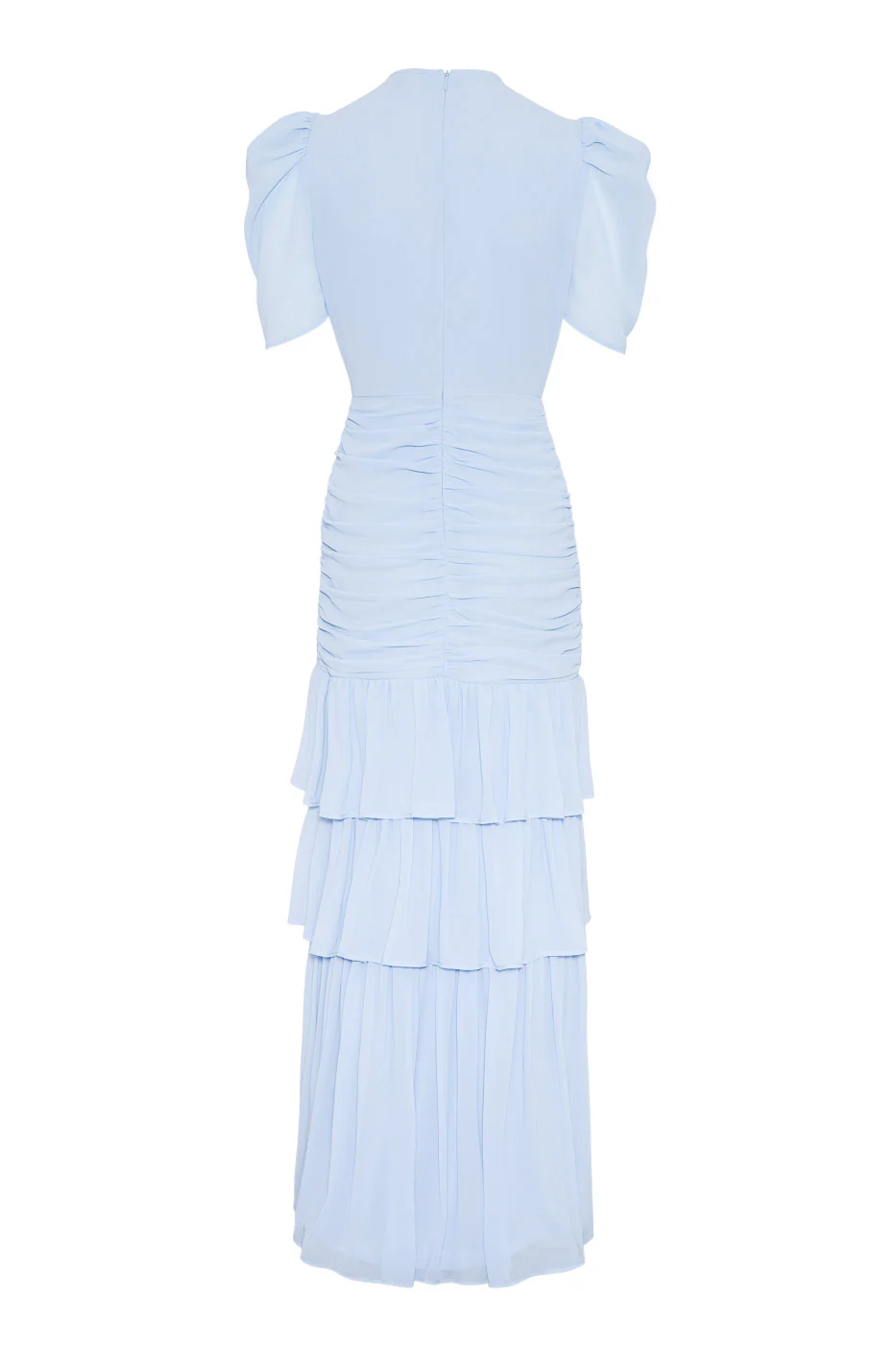 Jenna Maxi Dress fra Love Lolina. En romantisk maxikjole med voluminøse puff­ermer og flatterende V-hals. Den draperte overdelen fremhever midjen, mens det lagdelte skjørtet gir lett og elegant bevegelse. En perfekt kjole til bryllup, sommerfester og andre spesielle anledninger.