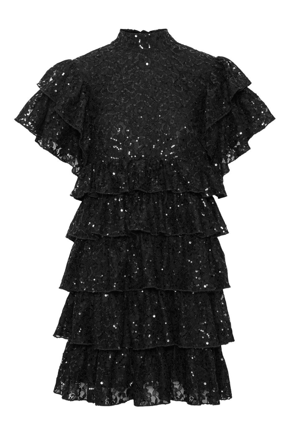 Kjole til dame fra Love Lolina i delikat blondestoff med paljettdetaljer. Kjolen har høy hals, volanger og sløyfe i ryggen. En feminin og leken festkjole, perfekt til kveldsbruk.