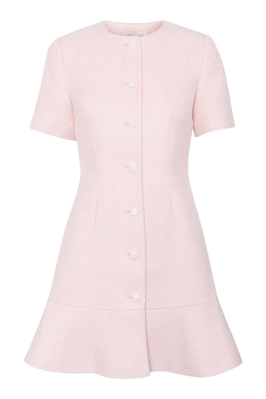 Tilly Mini Dress fra Love Lolina. En feminin minikjole i tweed med en flatterende, figurnær passform. Den har korte ermer, knappelukking i front og et lett utsvingt skjørt som gir et elegant uttrykk. En tidløs kjole som fungerer like fint til hverdags som til mer pyntede anledninger.