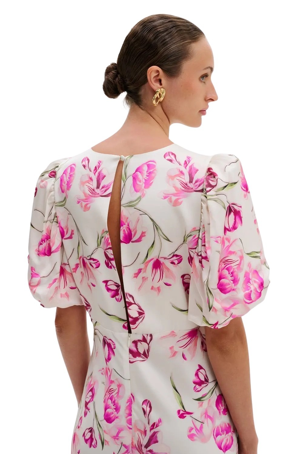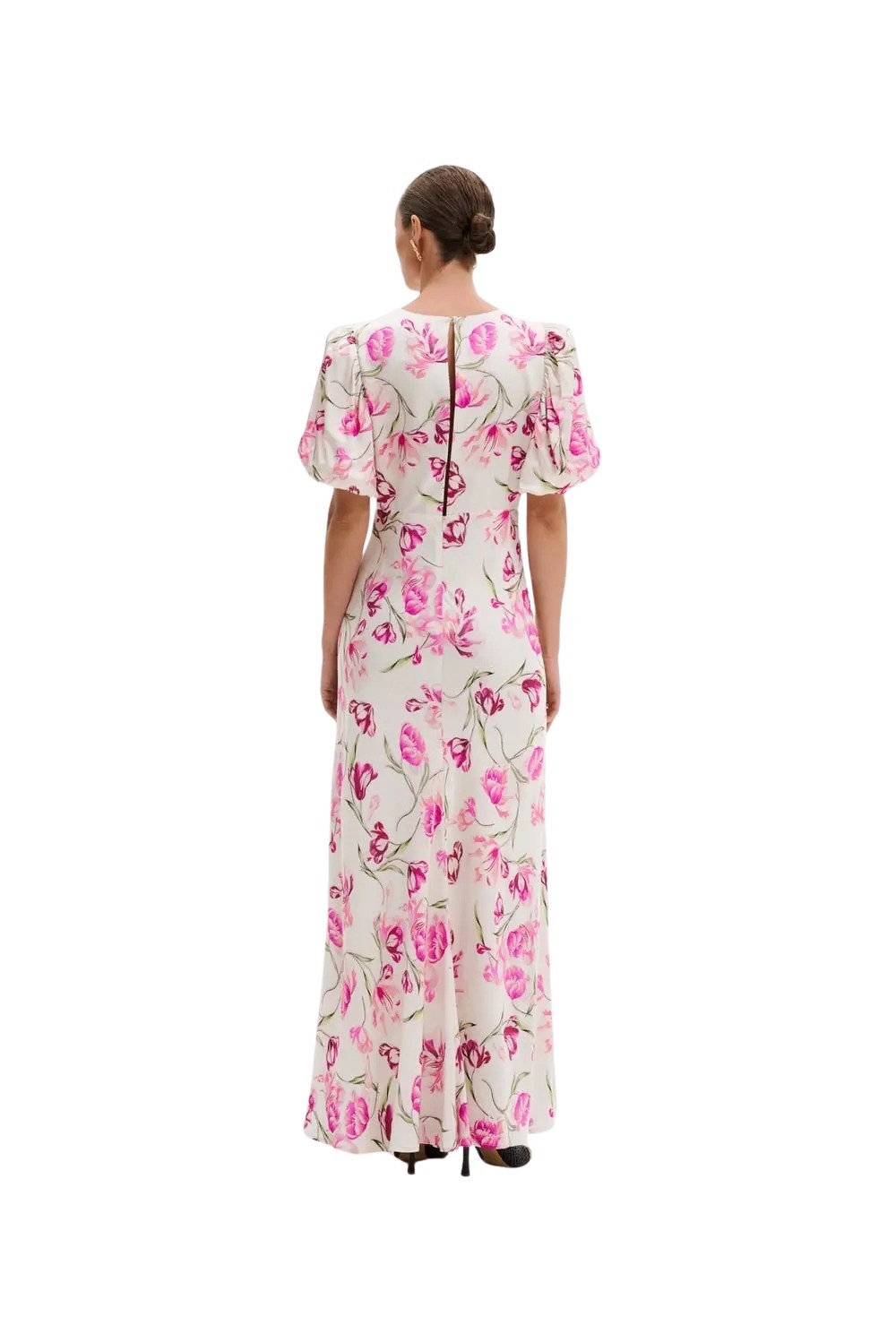Freja Maxi Dress fra Malina. En elegant, figurnær kjole med vakkert blomsterprint og feminin silhuett. Den har korte puffermer og delikate sømdetaljer som fremhever formen på en sofistikert måte. Perfekt til bryllup, sommerfester og anledninger hvor du ønsker et raffinert og tidløst uttrykk.