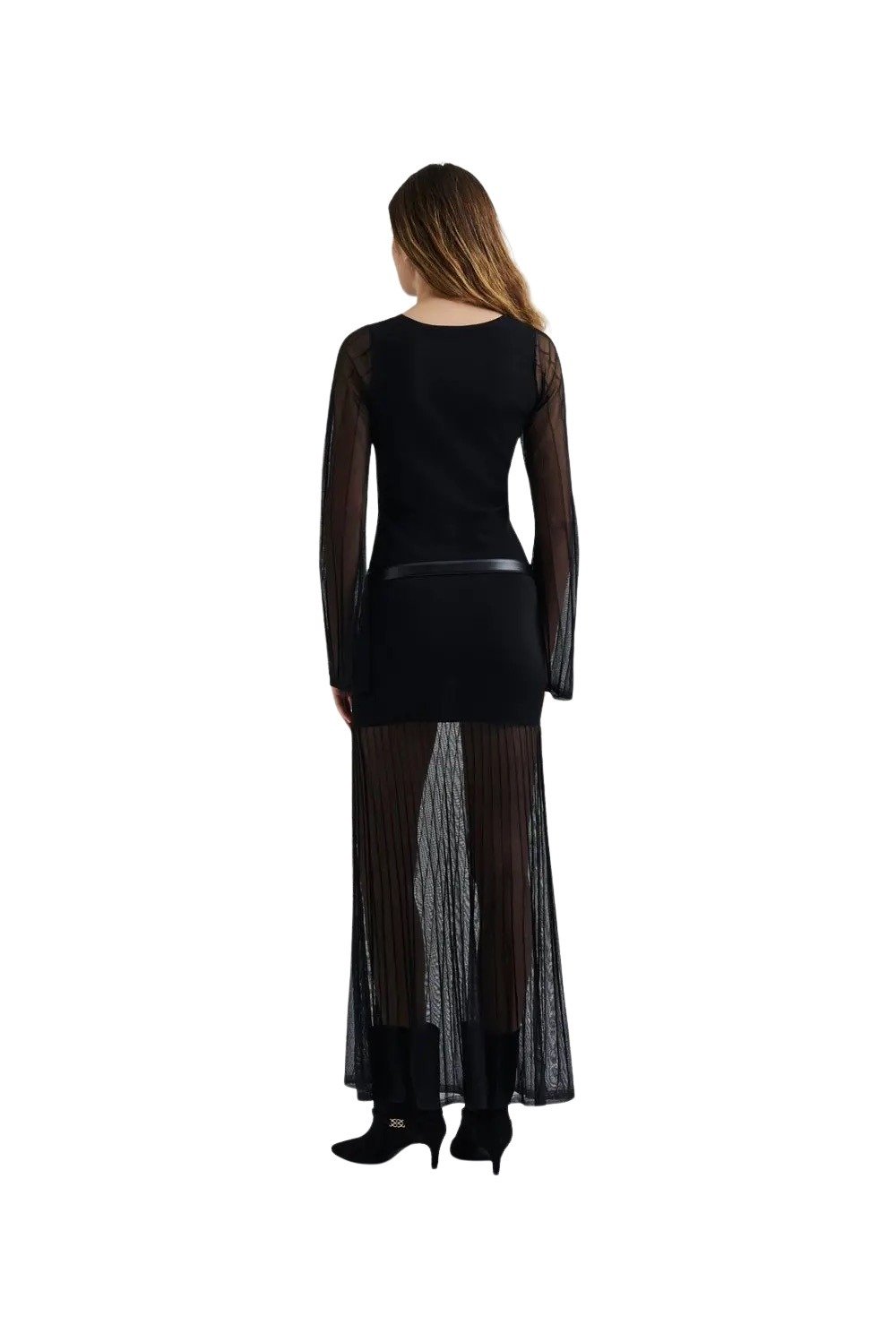 Maxikjole til dame fra Malina. Strikket kjole med gjennomsiktig plisséskjørt og ermer. Et elegant tillegg i garderoben som kan styles opp med hæler og glitrende tilbehør for en stilfull og sofistikert look.